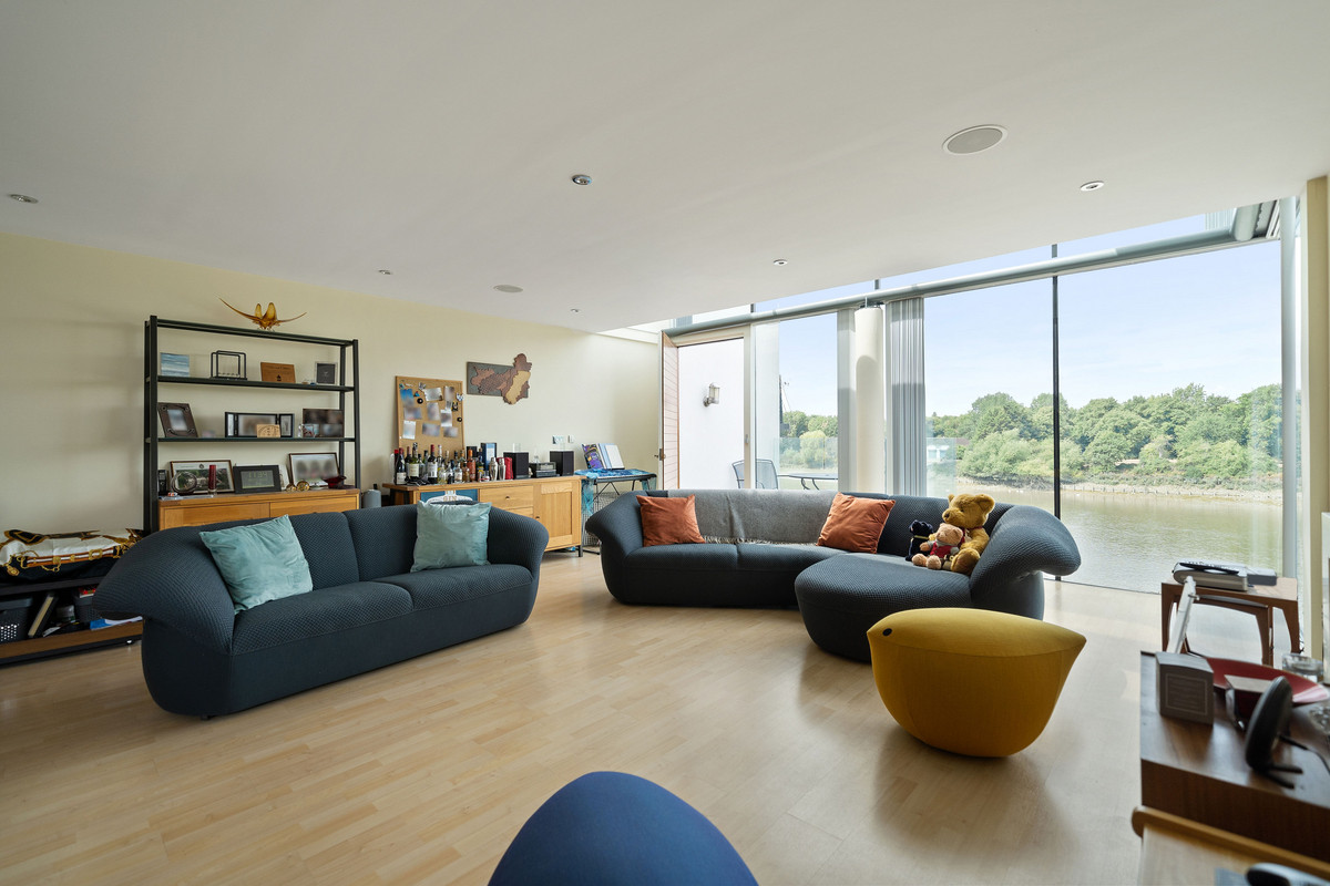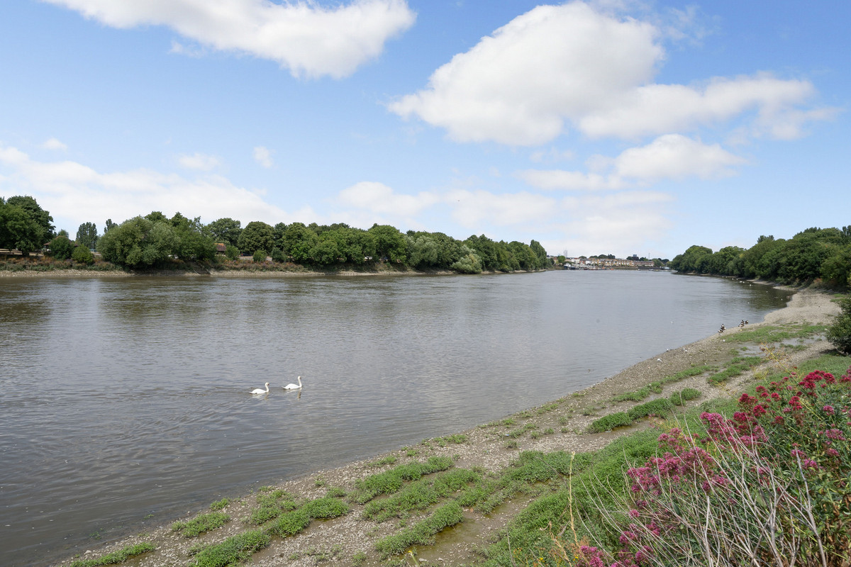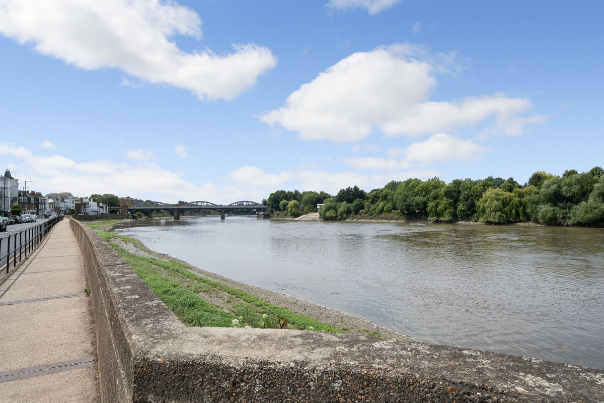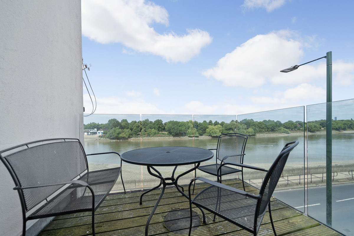 Situated on the second floor, the property totals 1,249sq,ft comprising a spacious open plan kitchen, dining and reception room, two double bedrooms, two bathrooms, extensive hallway storage and balcony area. A generously proportioned, open plan kitchen and reception room is equipped with modern built in appliances and breakfast bar, with a magnificent floor to ceiling extended glass wall bringing natural light cascading into the space and presenting panoramic views over the Thames. Both bedrooms are of a great size benefitting from full scale windows and bespoke built in wardrobes, the master bedroom has a stylish en-suite with walk in shower, with a four piece family bathroom completing the accommodation. A private balcony at the front of the building is the perfect outdoor space to enjoy this picturesque spot.