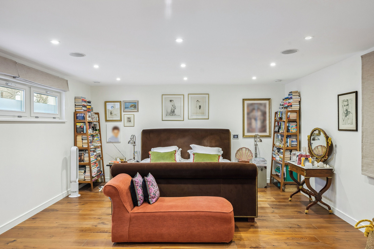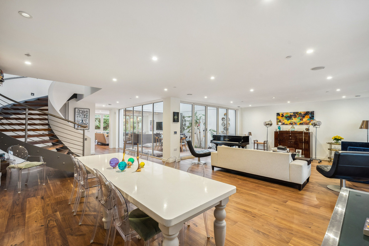 Inside, a standout feature is the gracefully curved plaster staircase. The front of the house boasts predominantly glass elements, including an entrance door that opens into a luminous and spacious open-plan reception room. This area seamlessly transitions into a triple-height Orangery with an opening glass roof, flooding the space with natural light. The modern kitchen is impeccably fitted with high-end appliances and integrated amenities, complemented by a utility room. Adjacent to the kitchen, a generous orangery dining room with a vaulted ceiling awaits, offering an ideal setting for gatherings. The living space flows openly, fostering an excellent atmosphere for entertaining. The living area flows effortlessly, creating an inviting atmosphere for entertaining. Through bi-folding doors, the south-facing courtyard garden, elegantly decked, expands the open-plan living space.