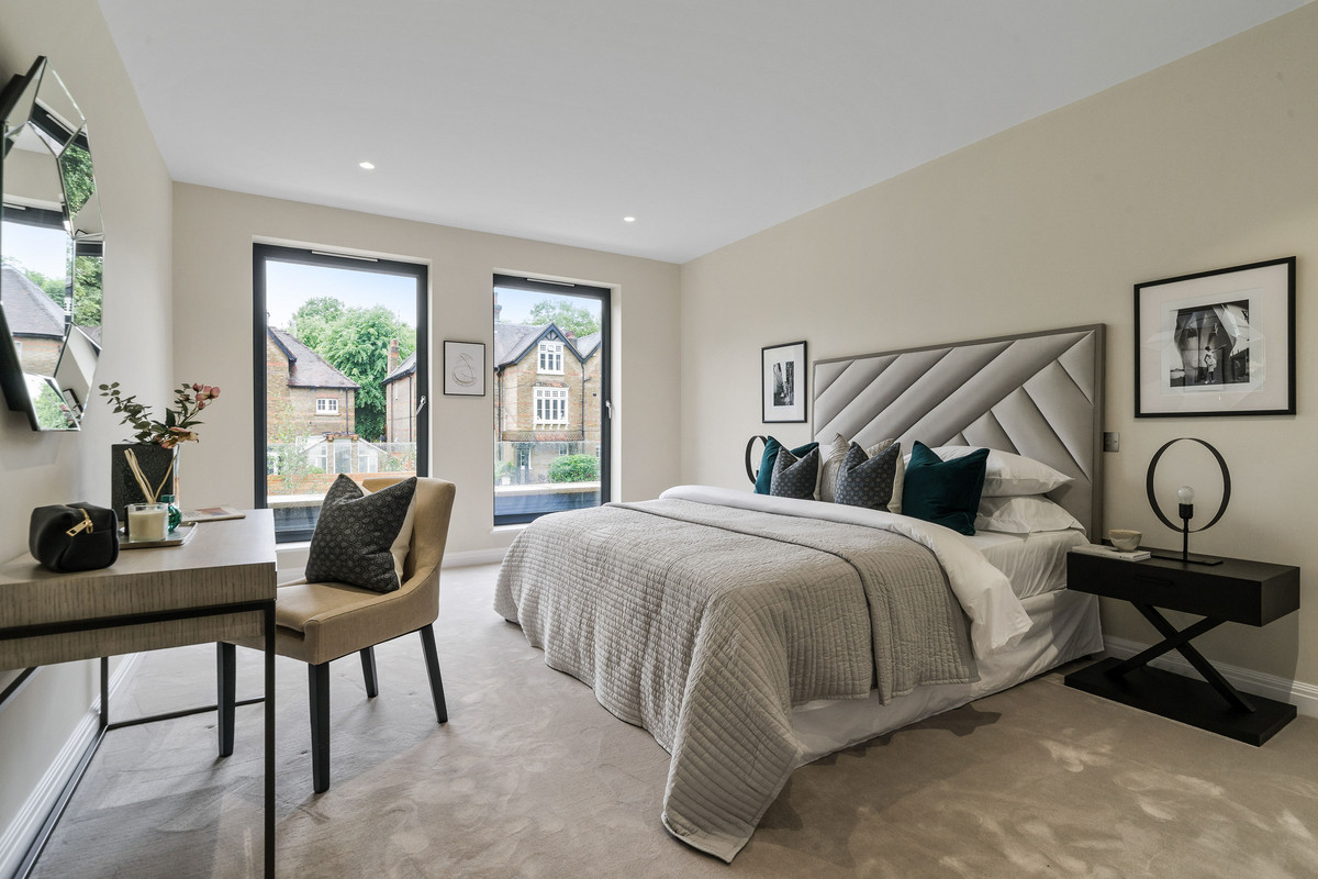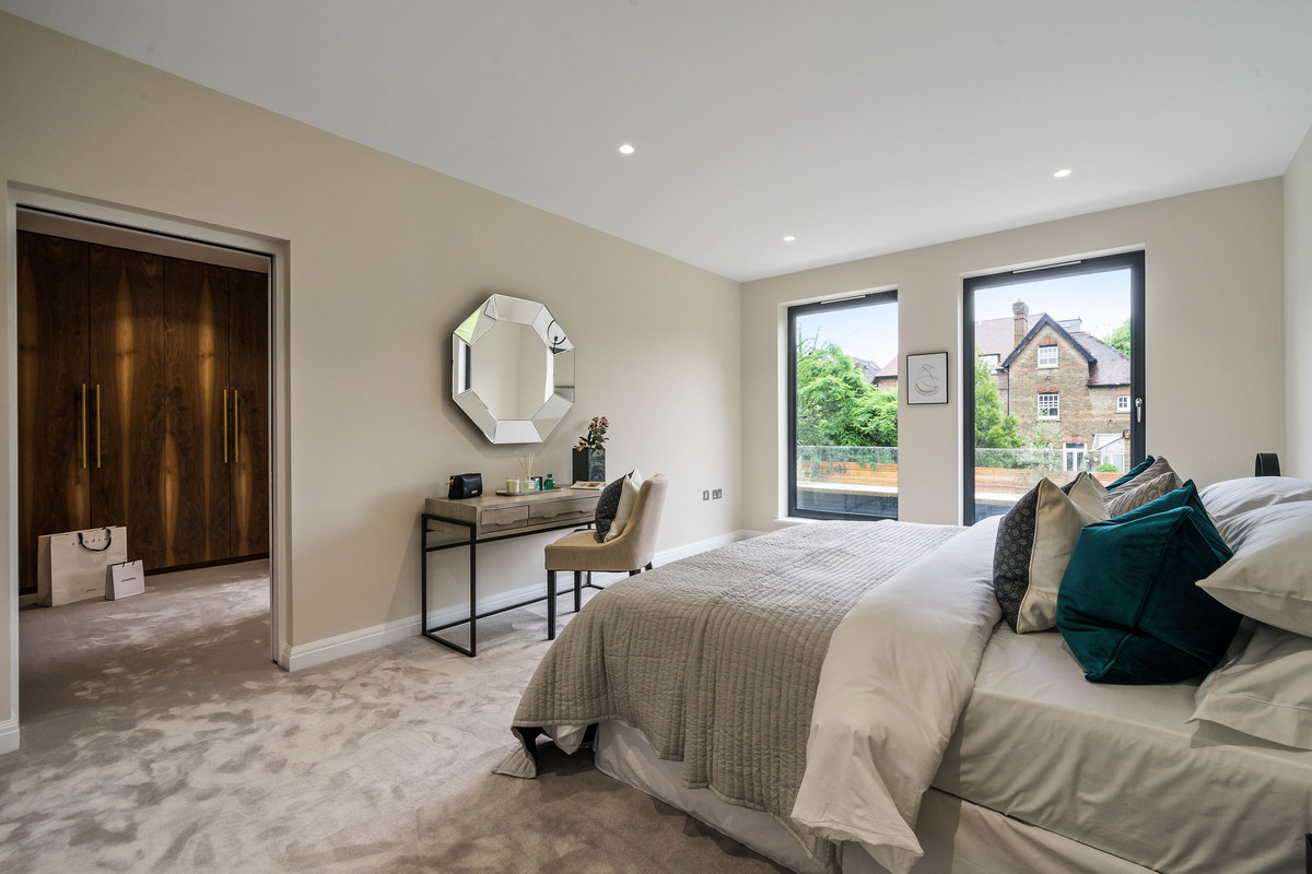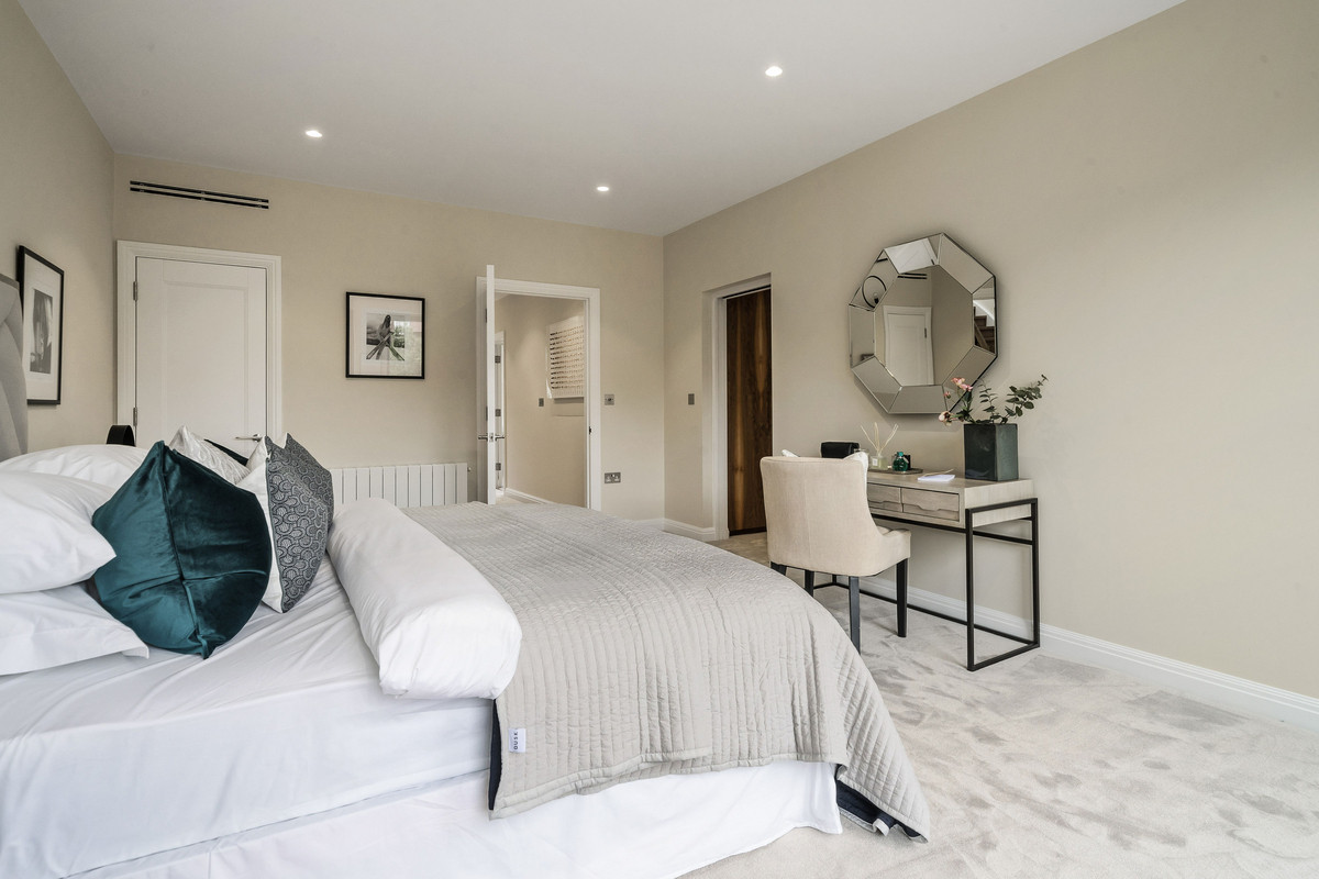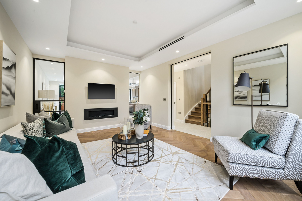 On the first floor there is an incredible principal bedroom with a walk-in dressing room, luxurious en-suite bathroom and a Juliette balcony. A second double bedroom also benefits from a walk-in wardrobe and modern en-suite shower room. The second floor hosts two further double bedrooms as well as a modern family bathroom. Additionally the property benefits from gated off-street parking for two cars, utility/plant room, underfloor heating, air conditioning and solar panels.