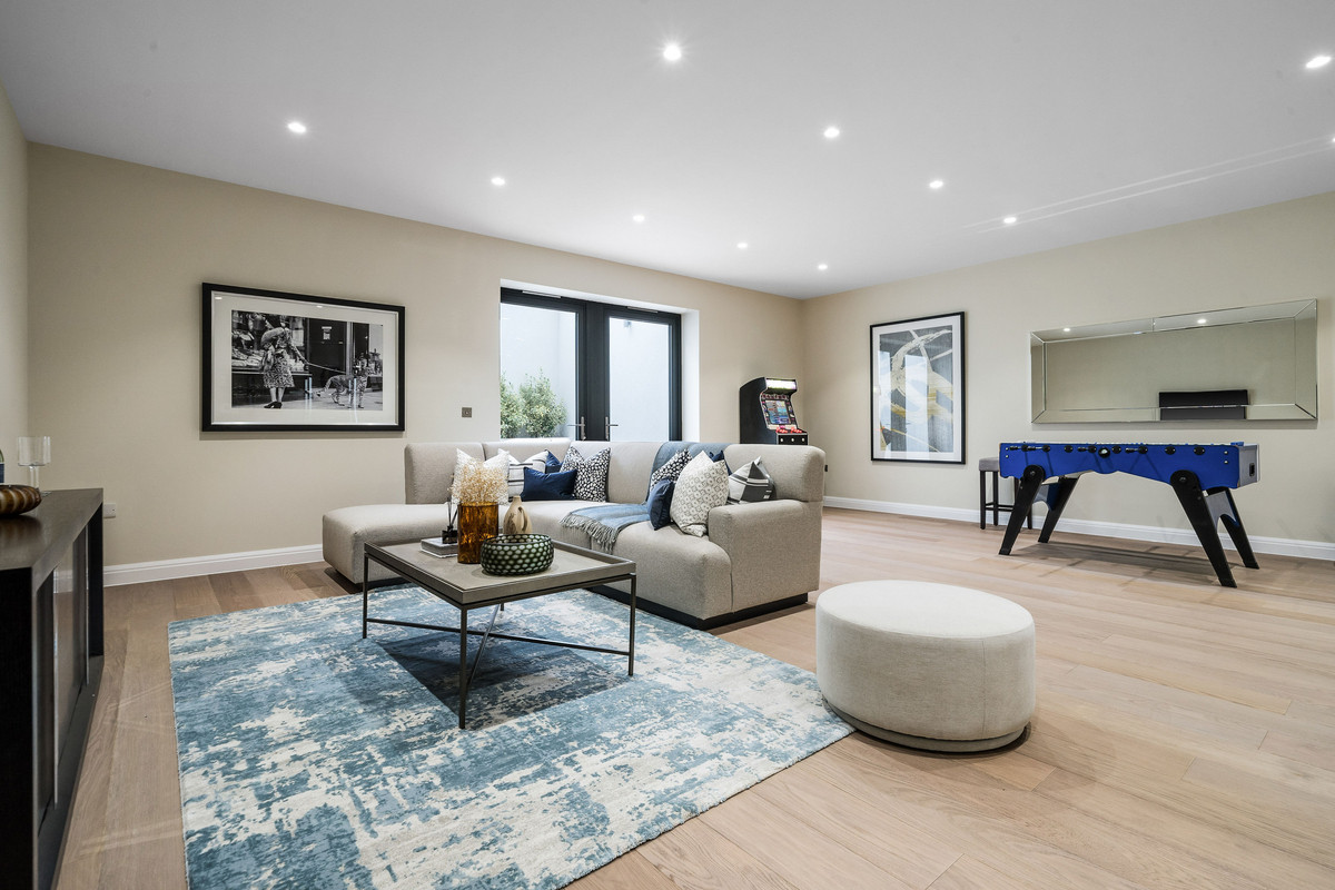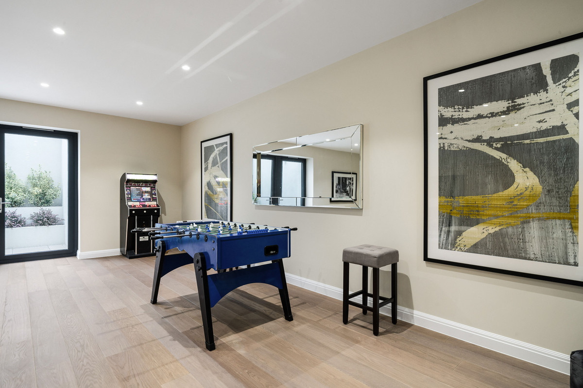 The lower ground floor offers a flexible space with access to a patio garden, currently set up as a games room but could be utilised as a gym, cinema or perhaps even a play room. There is also a large double bedroom with en-suite bathroom and access to a private patio garden.