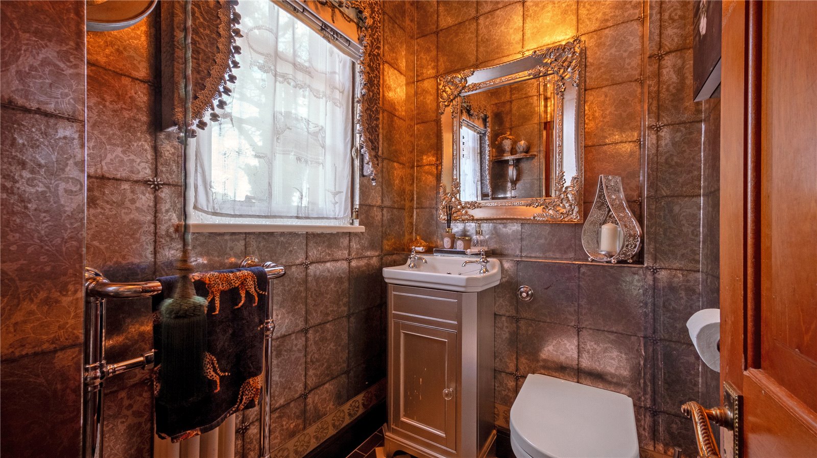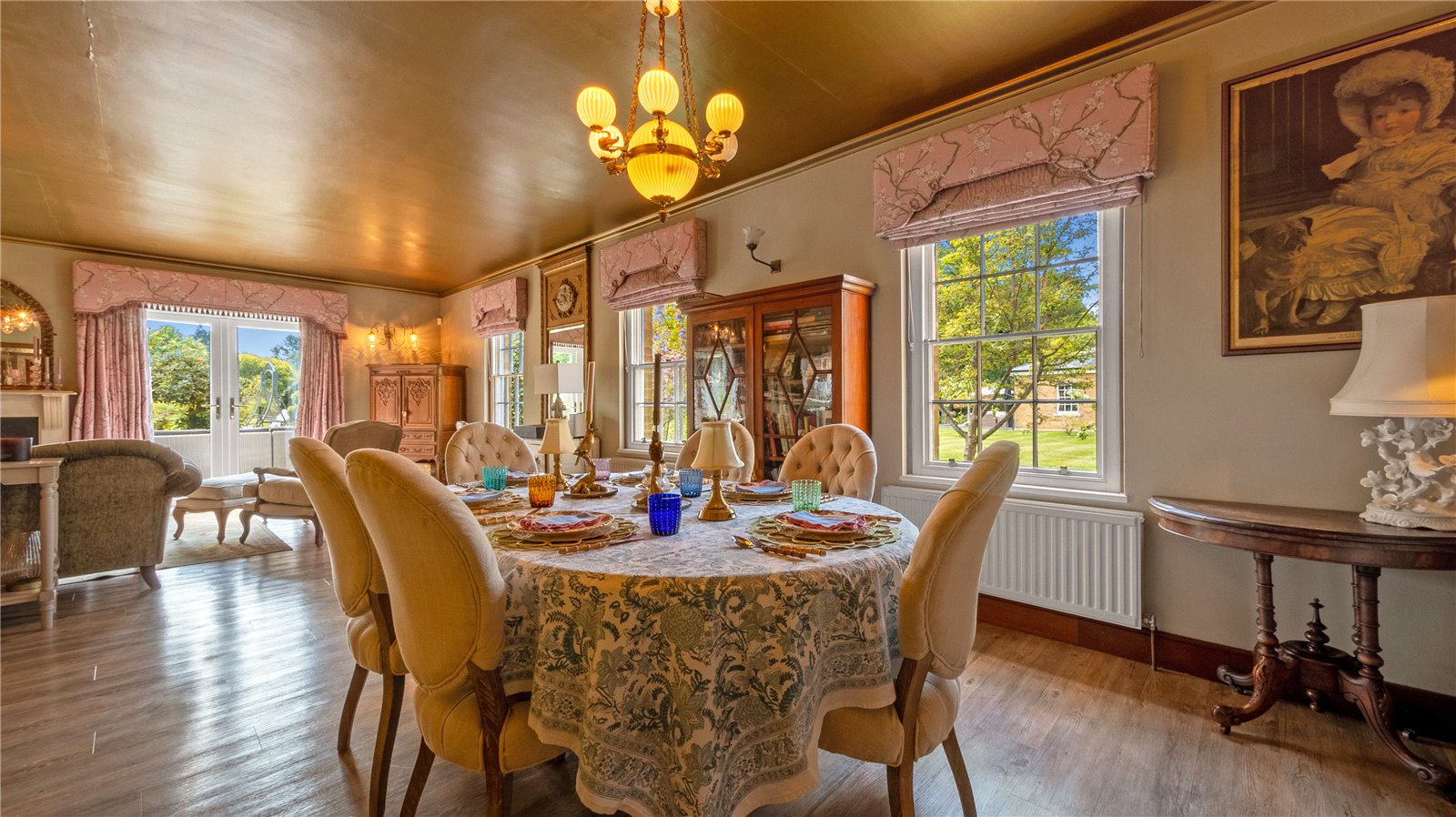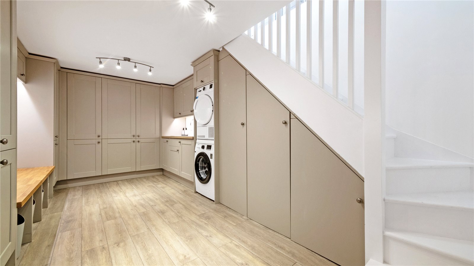 Adjacent to the kitchen is the formal dining room, a bright and airy space with two sets of double doors opening onto the garden, creating a seamless indoor-outdoor flow. Stairs from this room lead to a newly refurbished basement utility room, which boasts floor-to-ceiling fitted cabinets, a wine fridge, and plenty of space for laundry appliances. This versatile space could also serve as a home cinema.