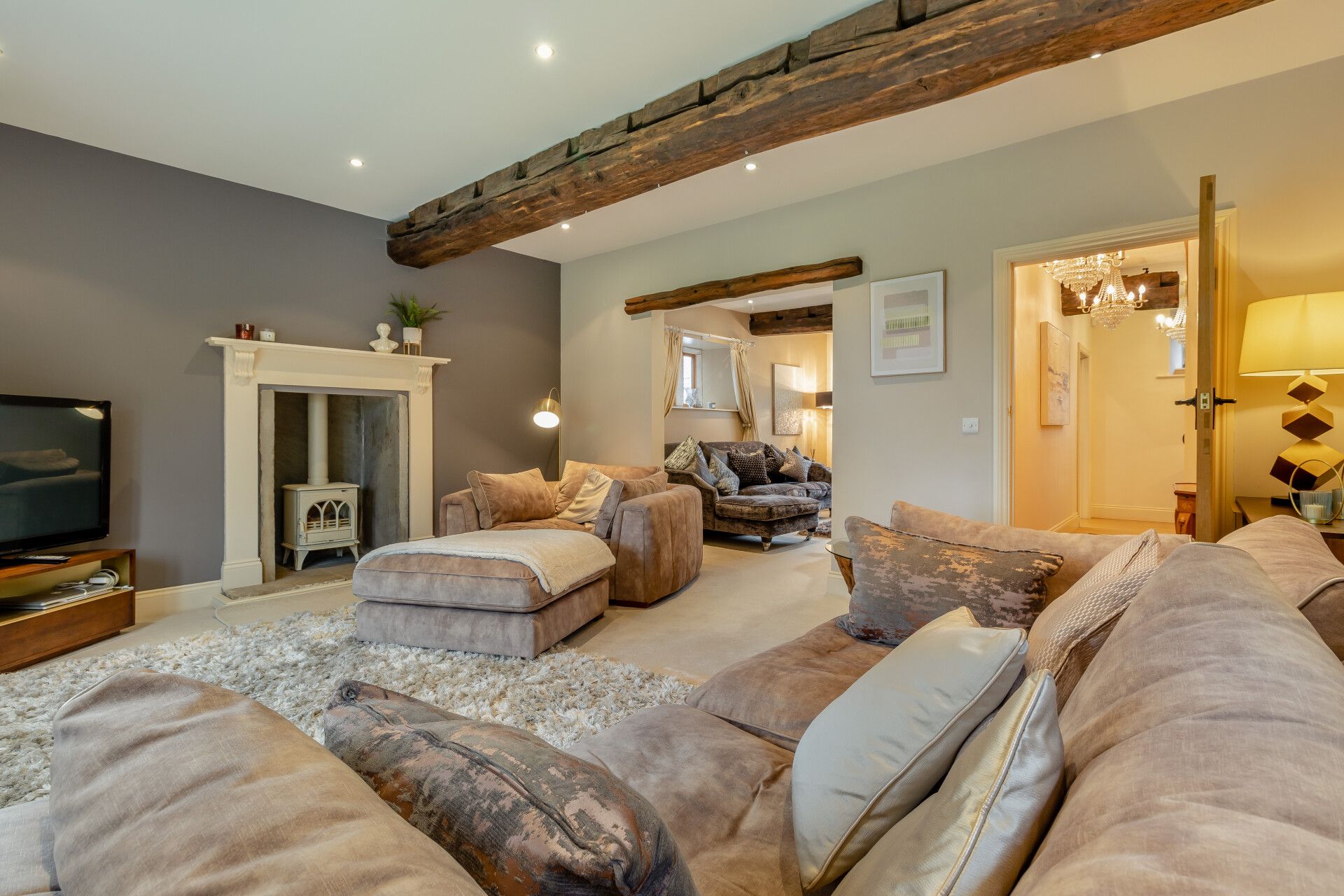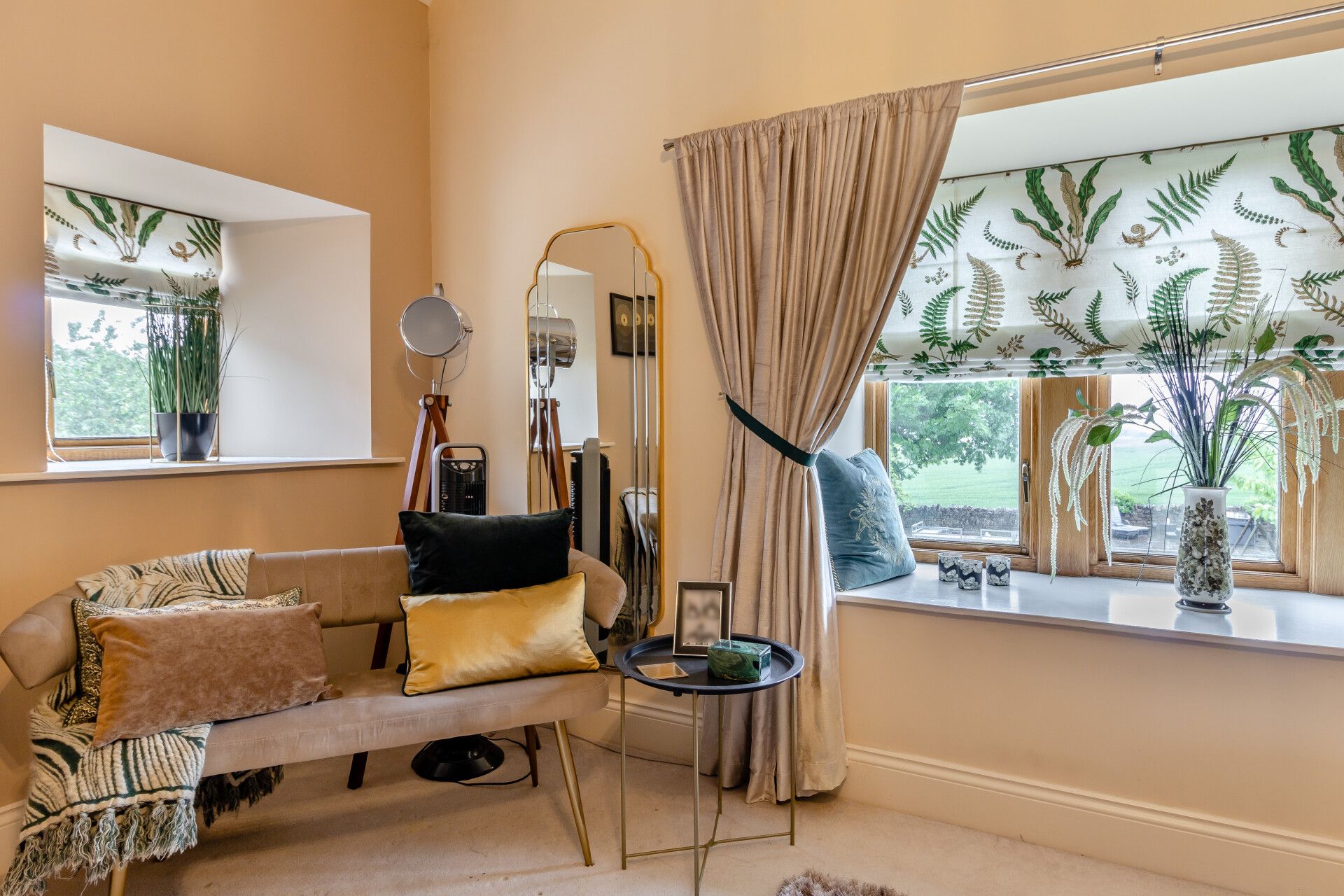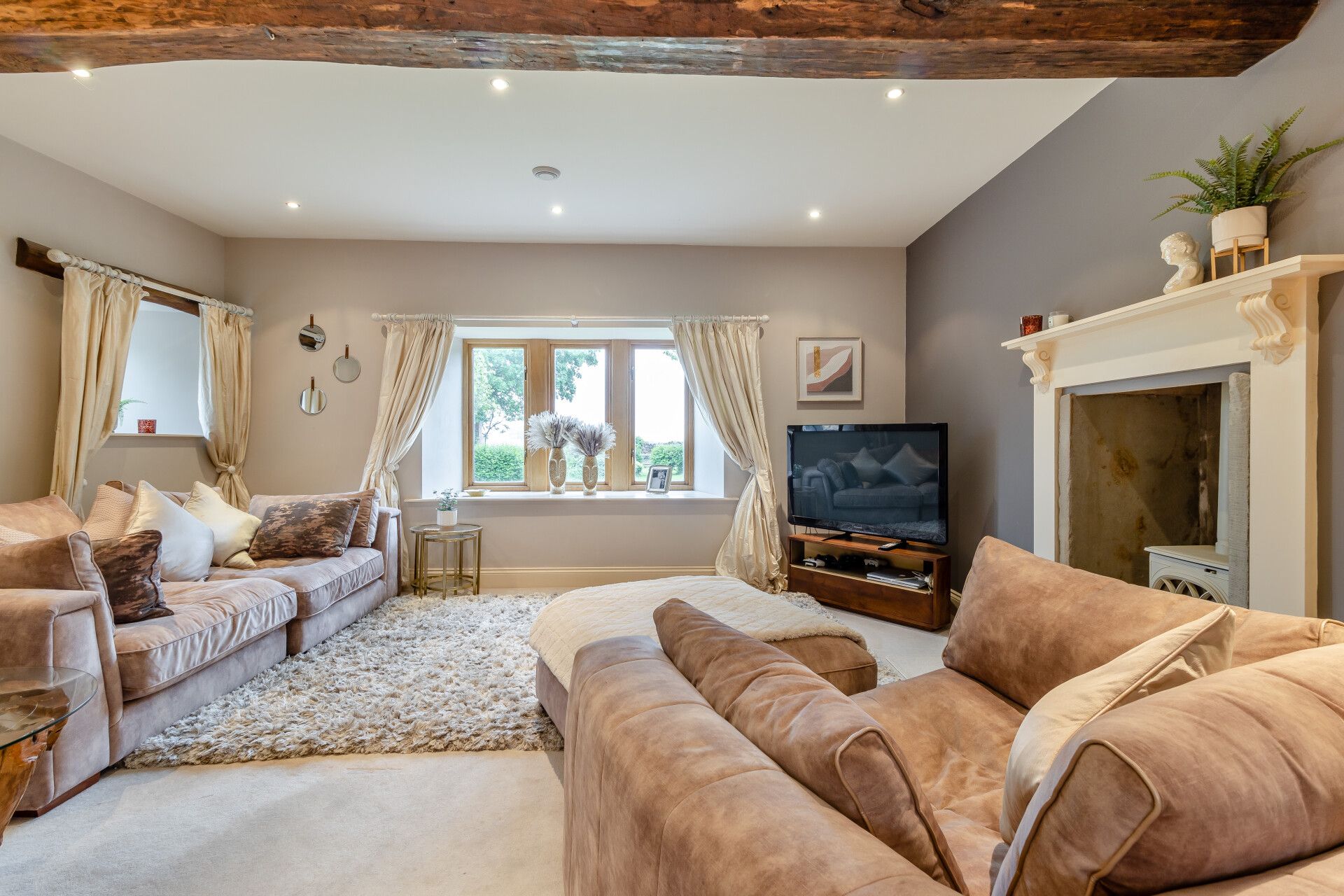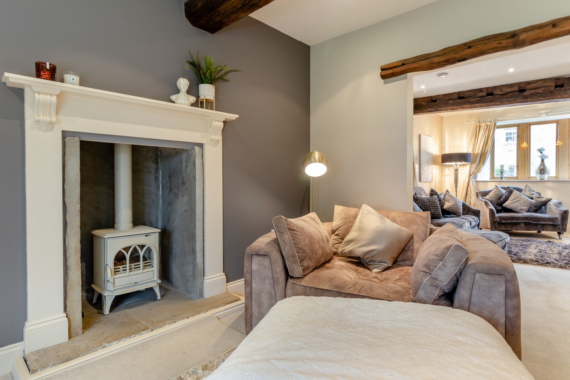 The lounge is positioned to the rear aspect of the home and enjoys a double aspect position, with windows to side and rear elevations, the rear enjoying a view over the garden whilst commanding long distance views over adjoining scenery beyond. A generous room with original exposed beams to the ceiling, a feature fireplace with an inset electric stove which sits on a stone flagged hearth. Open-plan access is provided to a versatile room, currently used as a second sitting room, once again enjoying a double aspect position, having stone mullioned windows to the side, large windows to the front commanding an impressive outlook over the courtyard. The room also has an exposed beam to the ceiling.