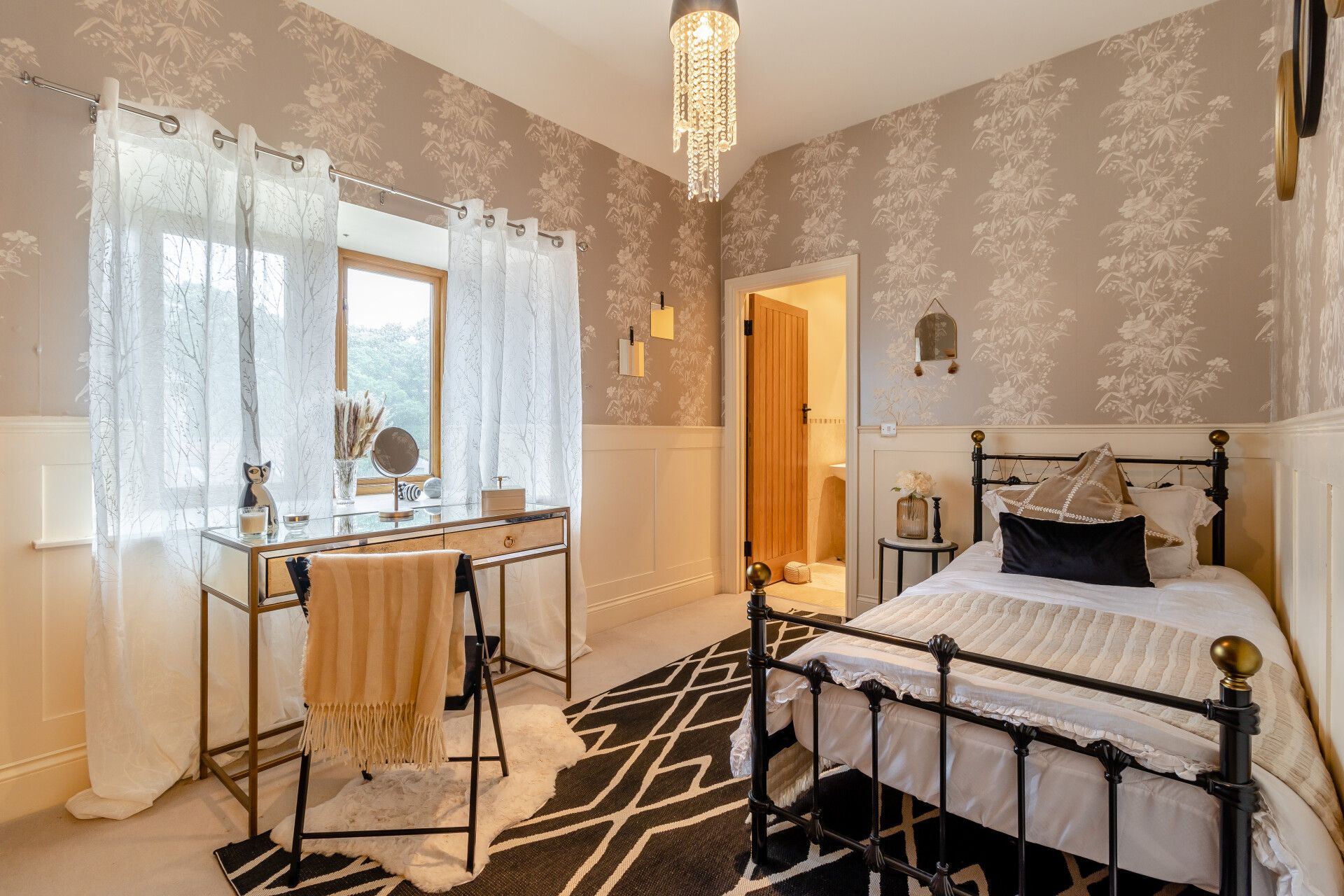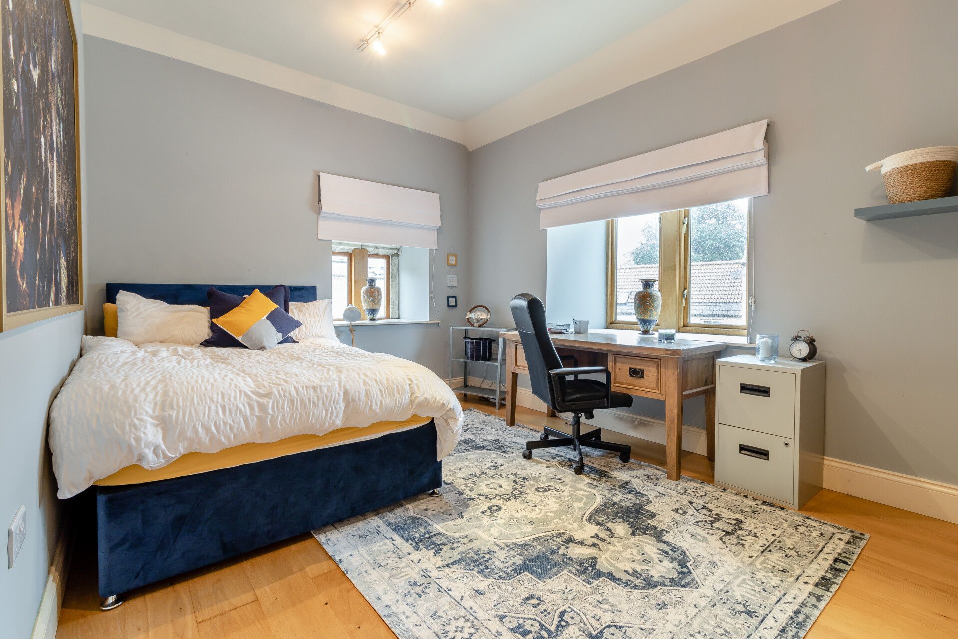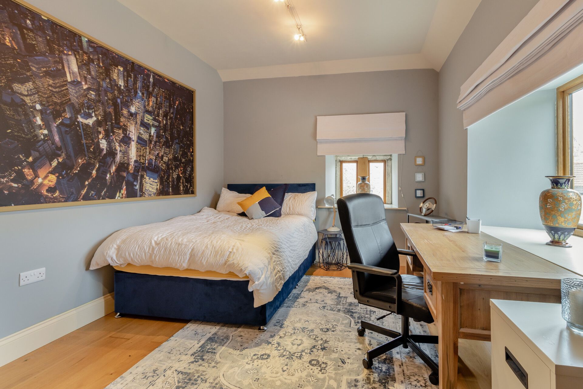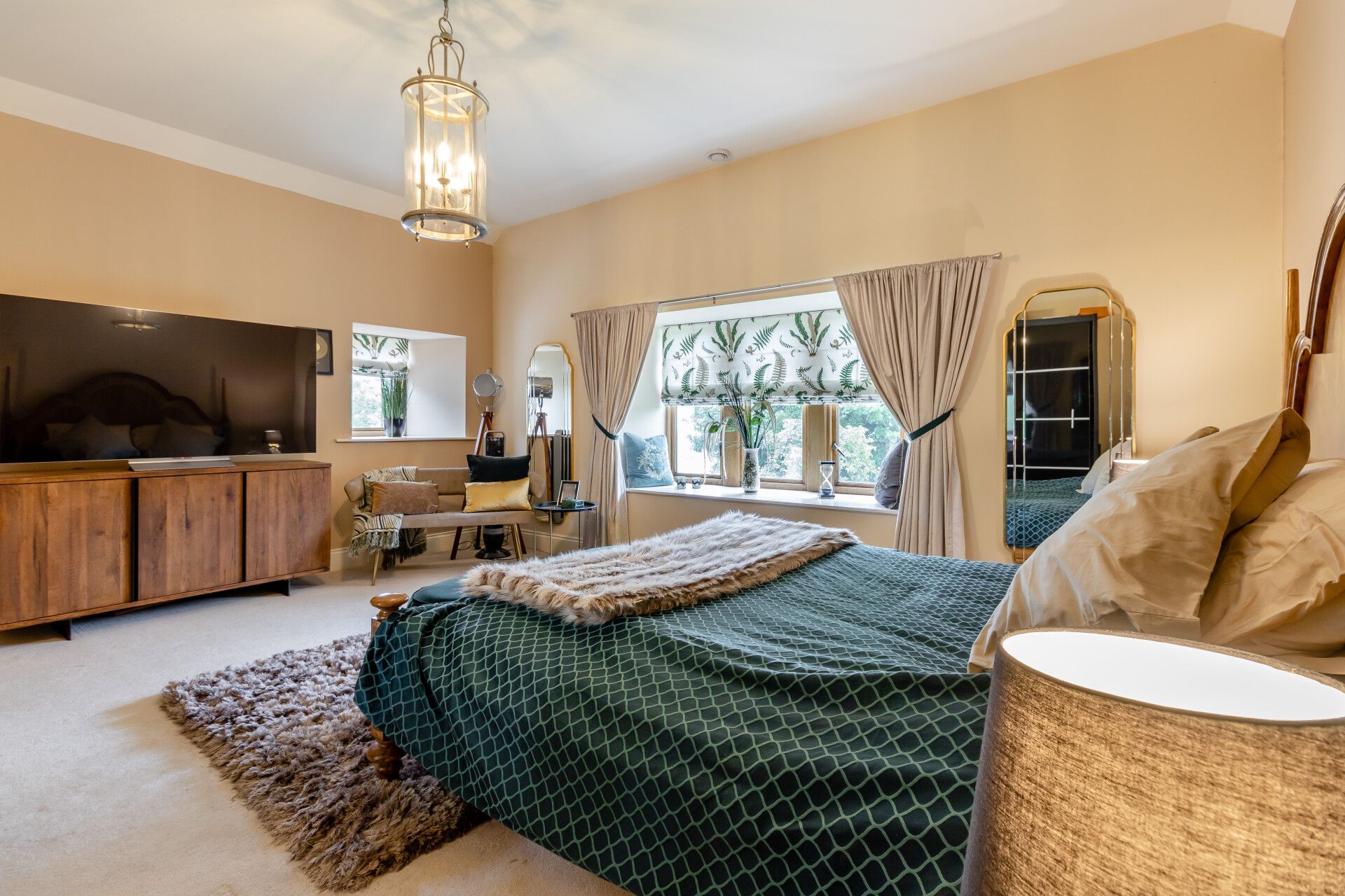 The largest bedroom is positioned to the rear aspect of the home, offers generous proportions with a high ceiling height, has a window to the side in addition to stone mullioned windows to the rear, enjoying scenic views over the garden and beyond.