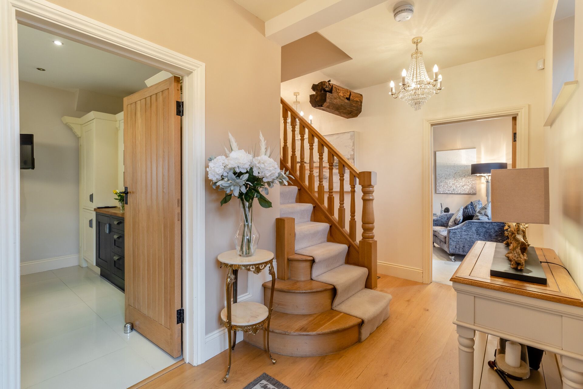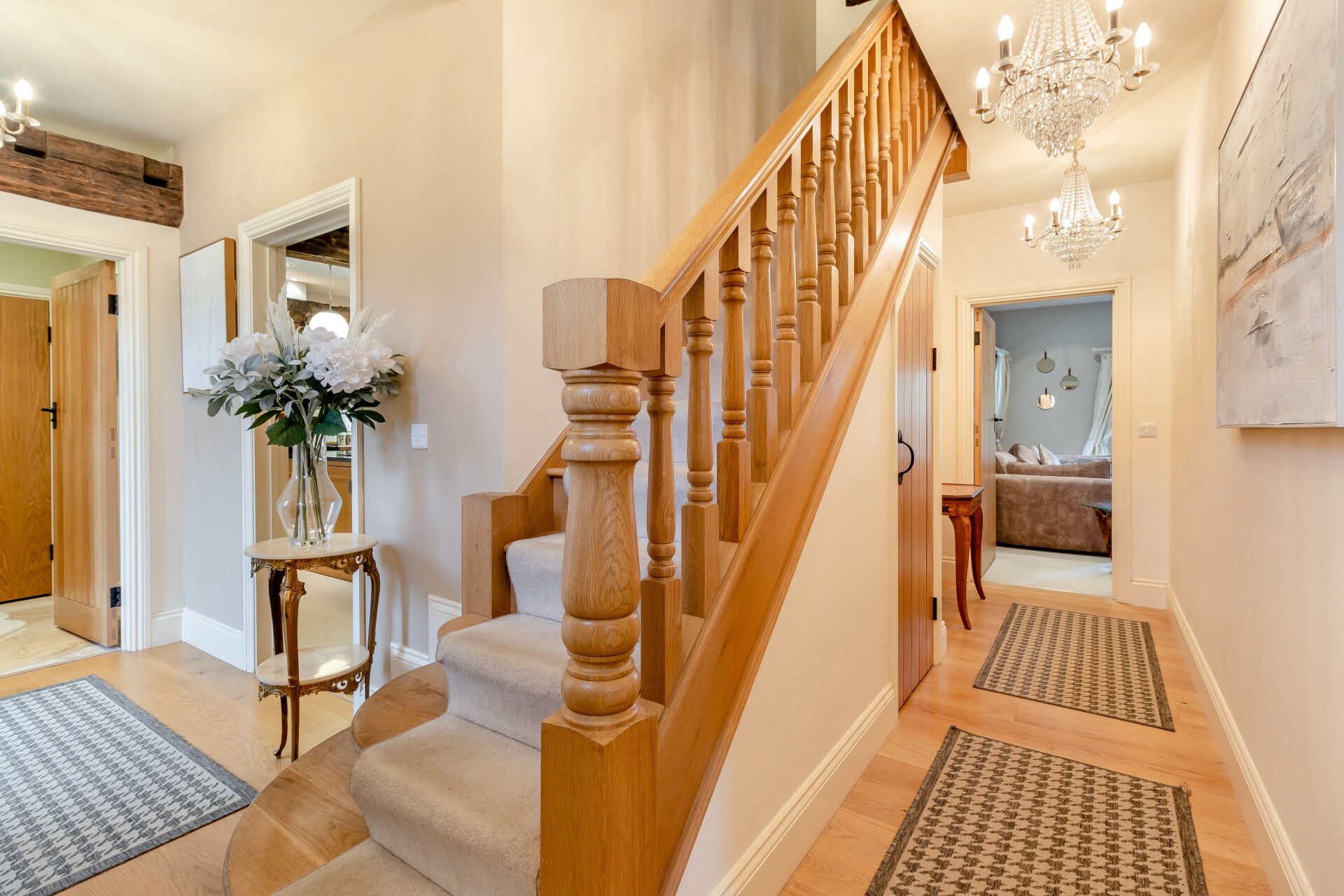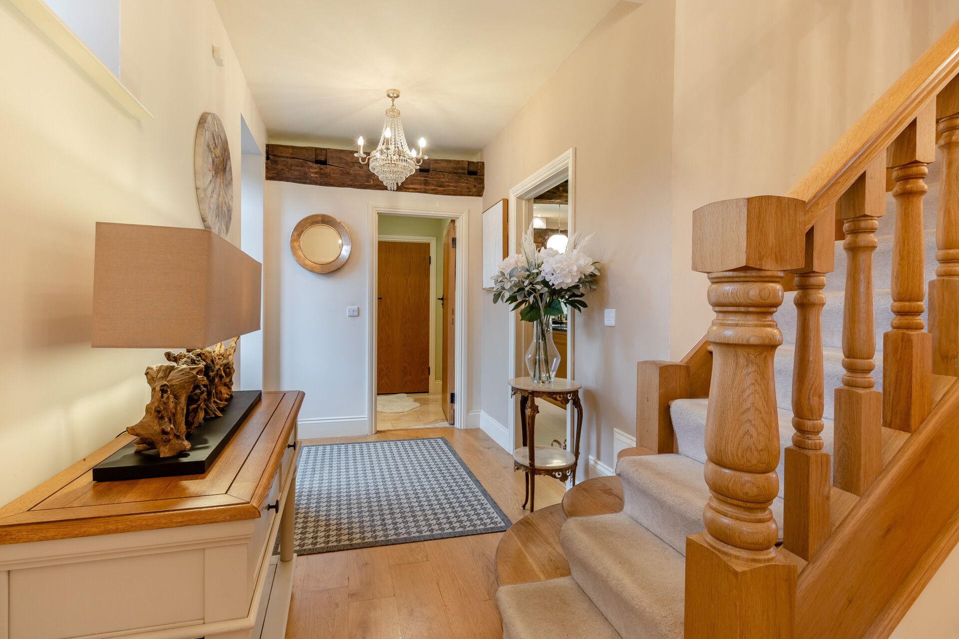 A part glazed oak entrance door opens into the entrance hall, which immediately offers an impressive introduction to the home, with a bespoke oak staircase to the first-floor level, original beams on display and an exposed oak floor.