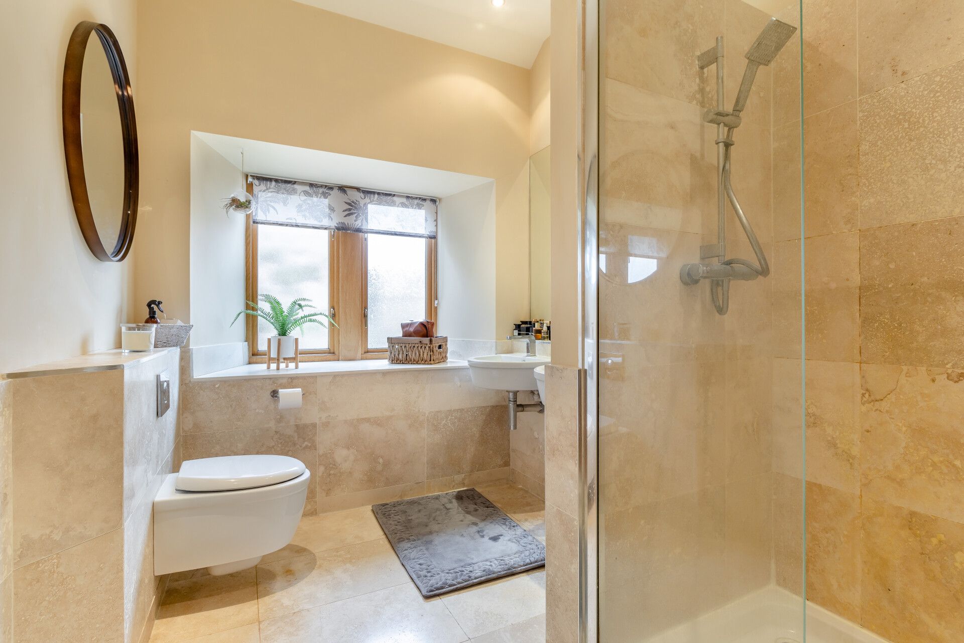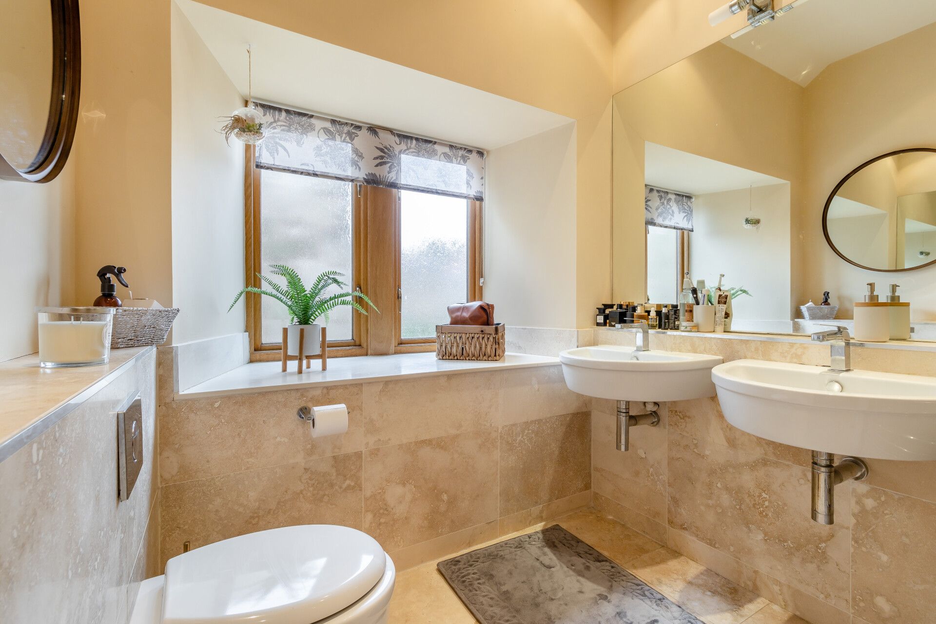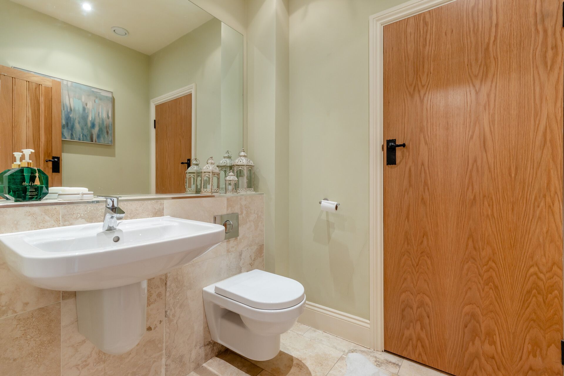 A cloakroom has travertine tiling to the walls and floor, presented with a two-piece suite incorporating Villeroy & Boch furniture, whilst giving access through to the boiler room, which also has plumbing for an automatic washing machine.