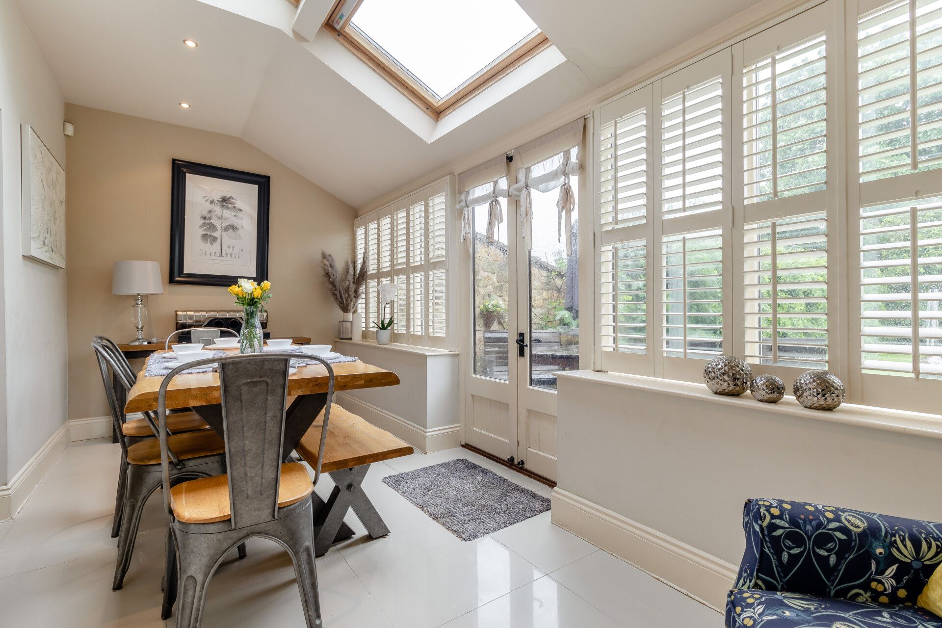 The breakfast room has a continuation of the ceramic tiled floor, skylight windows, a bank of windows to the rear elevation inviting an abundance of natural light indoors, whilst French doors open directly onto a flagged terrace inviting the outdoors inside.