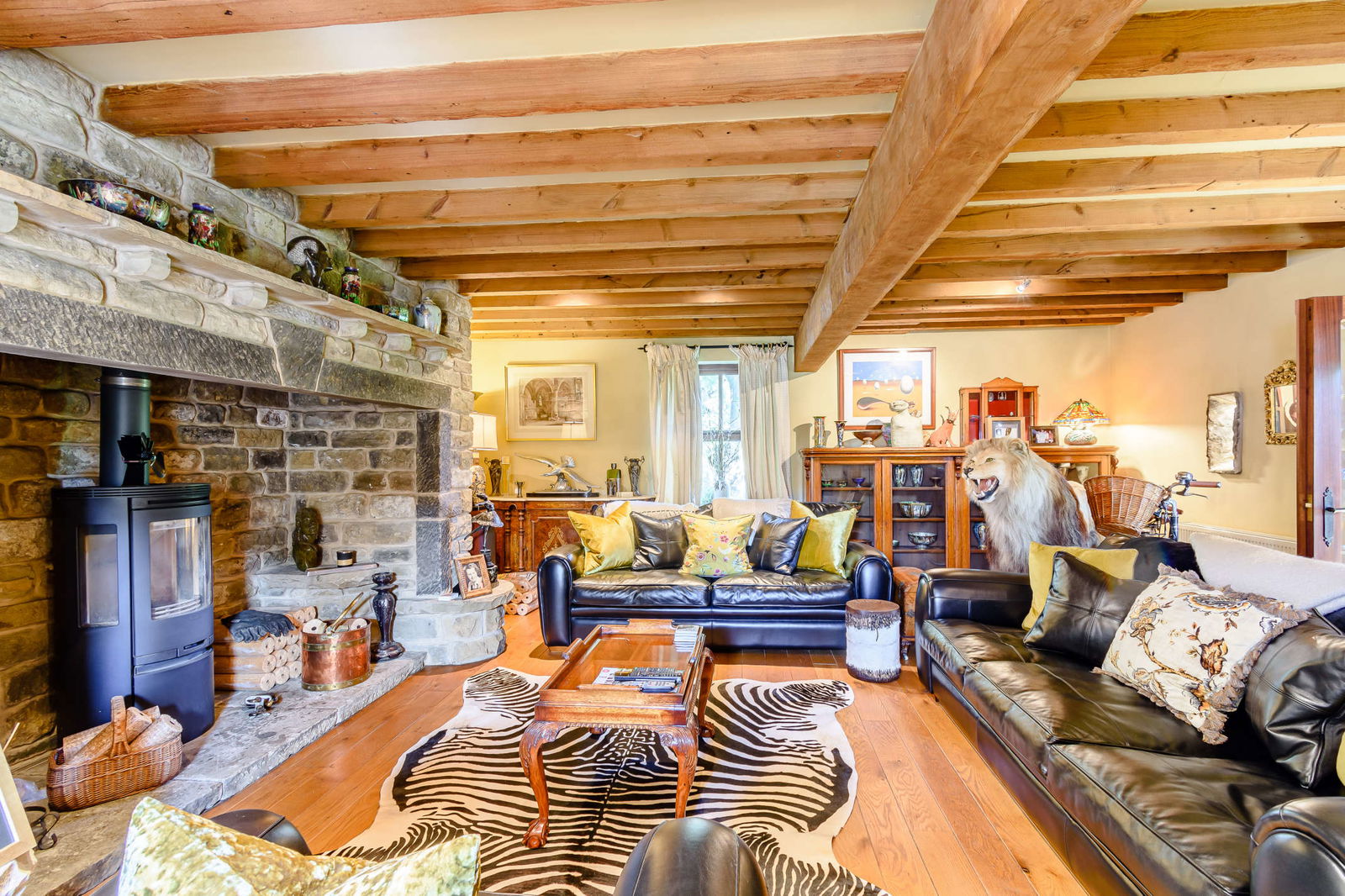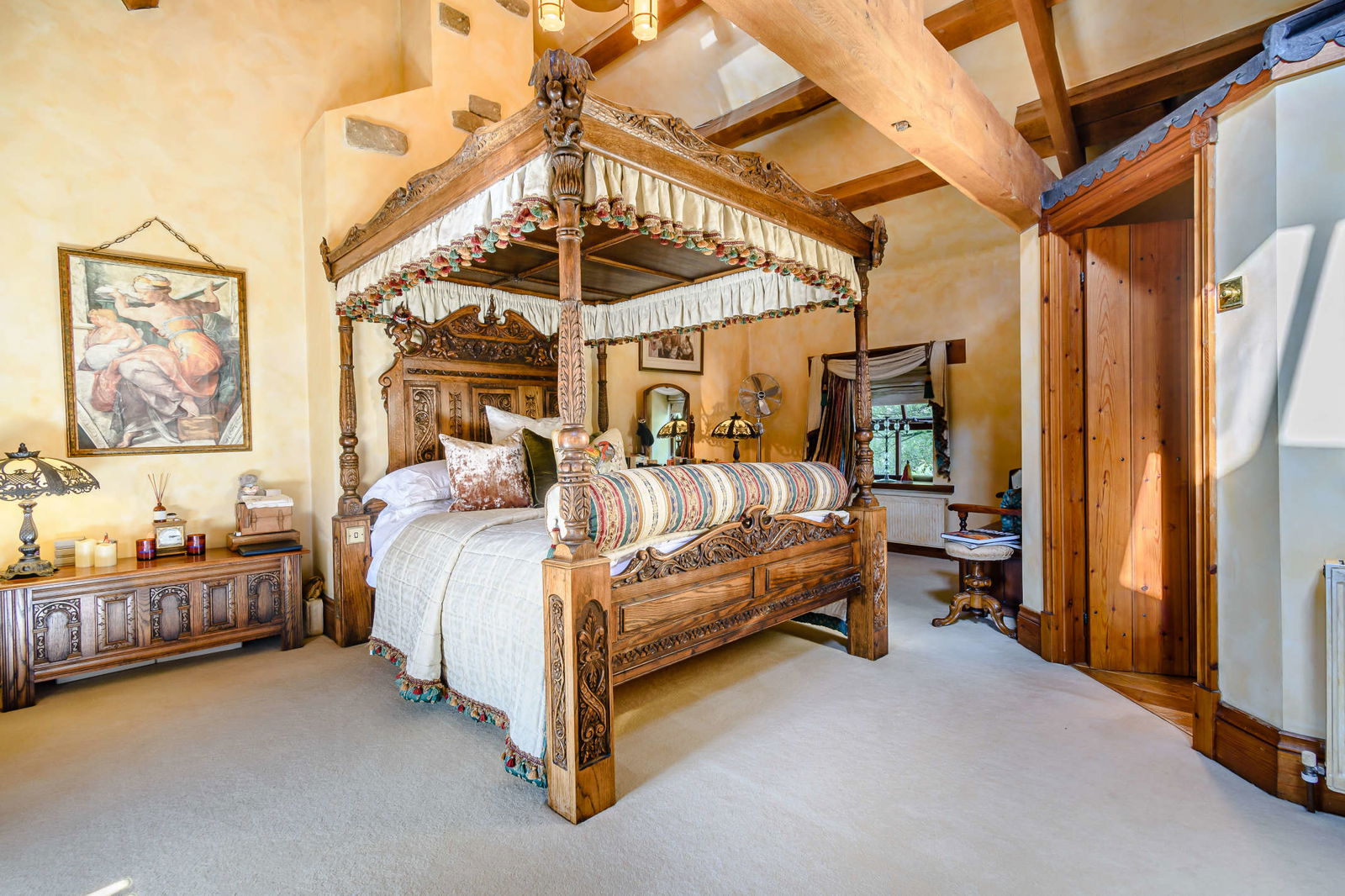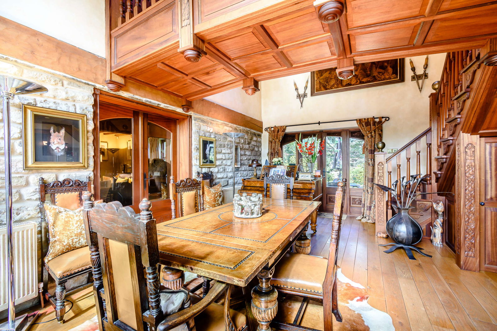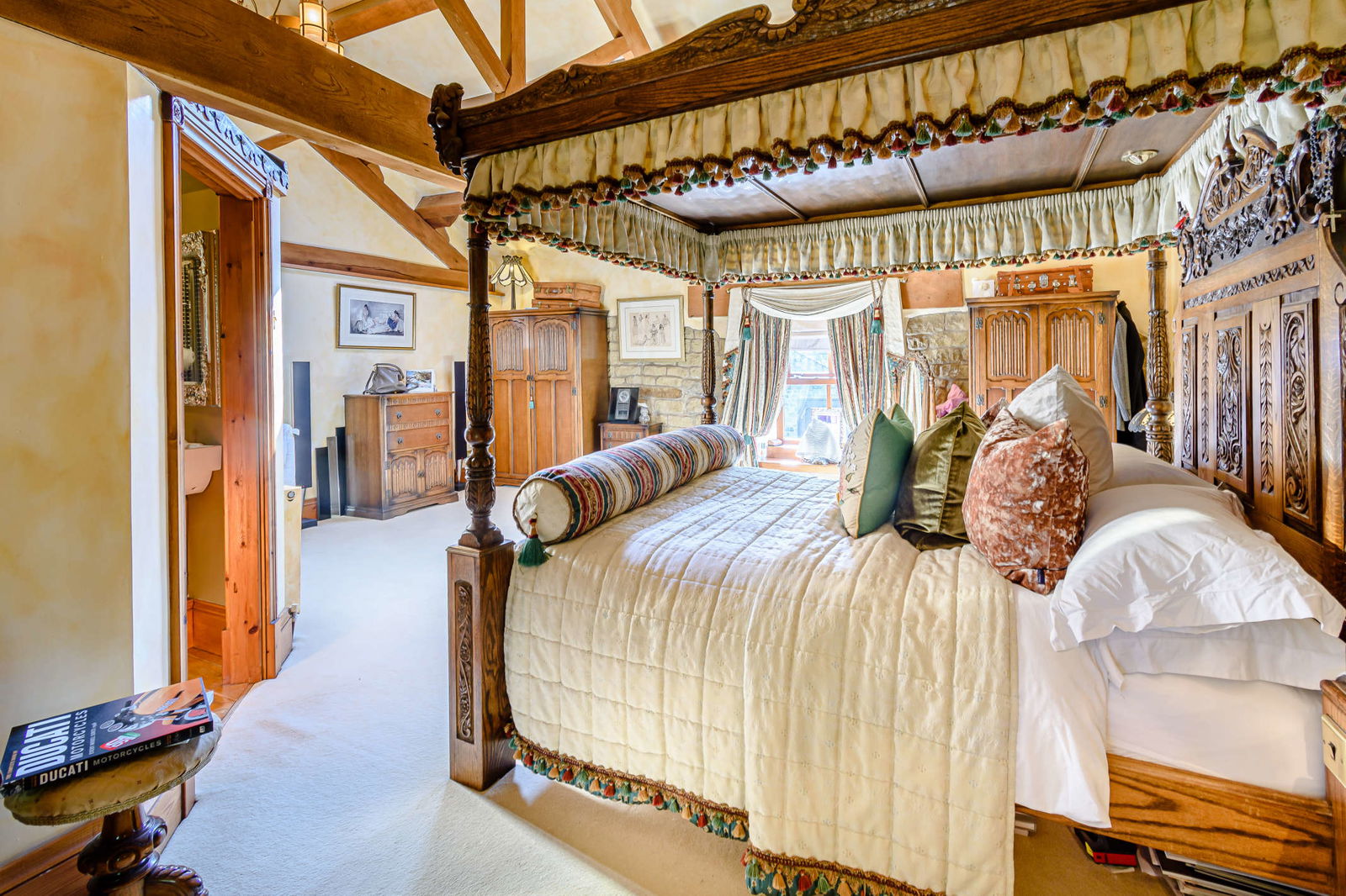 To the front aspect of the house a bespoke mahogany door sits within the original arch to the barn, which is glazed to the full height of the building ensuring natural light is invited indoors. The dining hall presents an impressive introduction to the home, enjoying an exposed double height ceiling into the apex of the building revealing exposed beams and trusses. The room has exposed stone to the walls, an oak floor and two sets of skylight windows whilst French doors open directly onto the rear garden. A bespoke mahogany staircase has detailed spindles and ornate carved newel posts and gives access to the first floor; a galleried mahogany bridge joining the landing to the principal bedroom suite. The ground floor has two additional reception rooms; a snug has exposed timbers, a window directly overlooking the rear garden and an oak floor. The Lounge Offers exceptional proportions, has an oak floor, windows to front and rear aspects, exposed timbers to the ceiling, exposed stone to one wall and a stunning inglenook stone fireplace which has an inset wood burning stove that sits on a stone flagged hearth. The kitchen has exposed timbers to the ceiling, windows overlooking the front garden and a stable style entrance door to the side aspect opening directly onto the driveway. The room has full tiling to the floor and is presented with a bespoke range of fitted kitchen furniture with roll edged work surfaces that incorporate a stainless steel sink. There is a five seater breakfast bar and a compliment of appliances which includes a Belling stove consisting of a double oven and grill with a six ring gas burner, a hotplate with extractor canopy over, a dishwasher and a fridge freezer. From the kitchen access is gained through to the utility, which is presented with furniture matching the kitchen, work surfaces incorporating a sink unit, plumbing for an automatic washing machine and space for a dryer. Access is gained through to a glass fronted hallway which overlooks the rear garden and has an exposed oak floor, exposed stone to the expanse of one wall and a mahogany staircase rising to the first floor mezzanine lounge/potential fifth bedroom. This stunning versatile room offers spacious accommodation, the glass façade overlooking the garden. The room has two Velux skylight windows and additional windows to both front and rear aspects, exposed stone to the walls, an oak floor and traditional cast iron radiators.