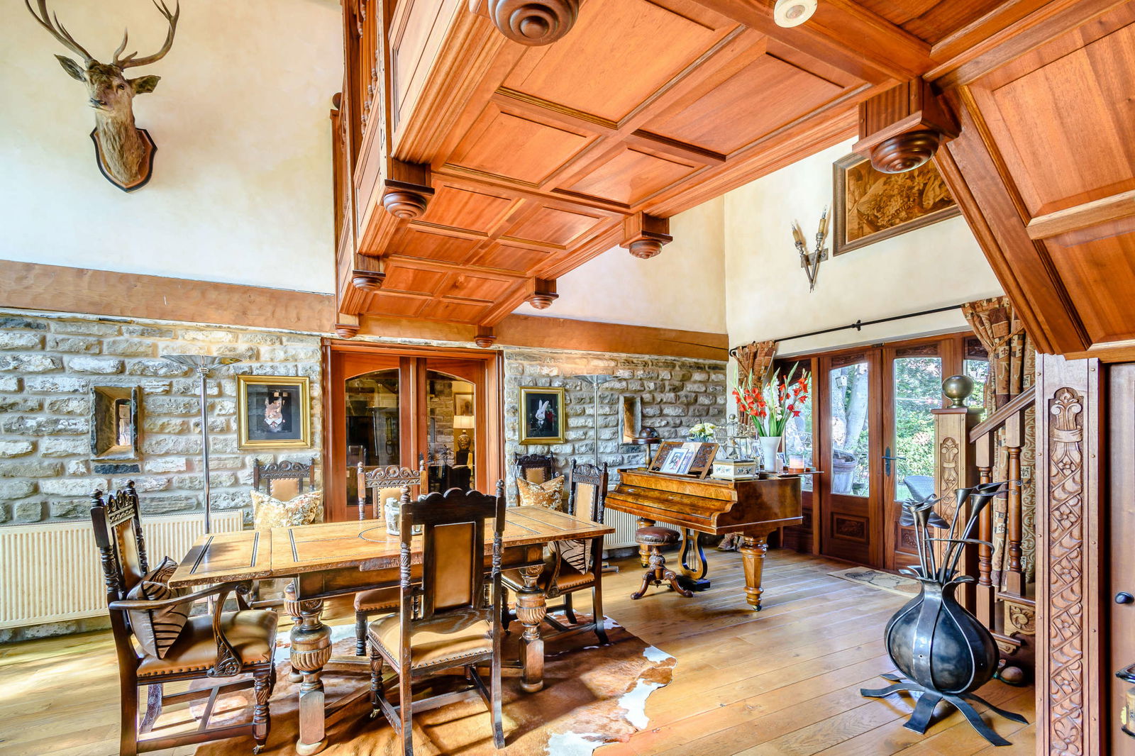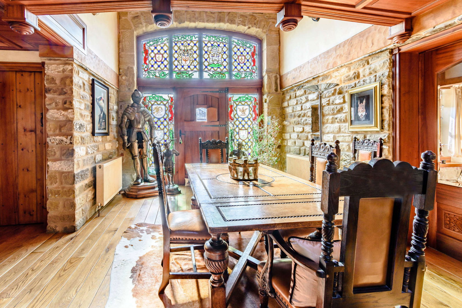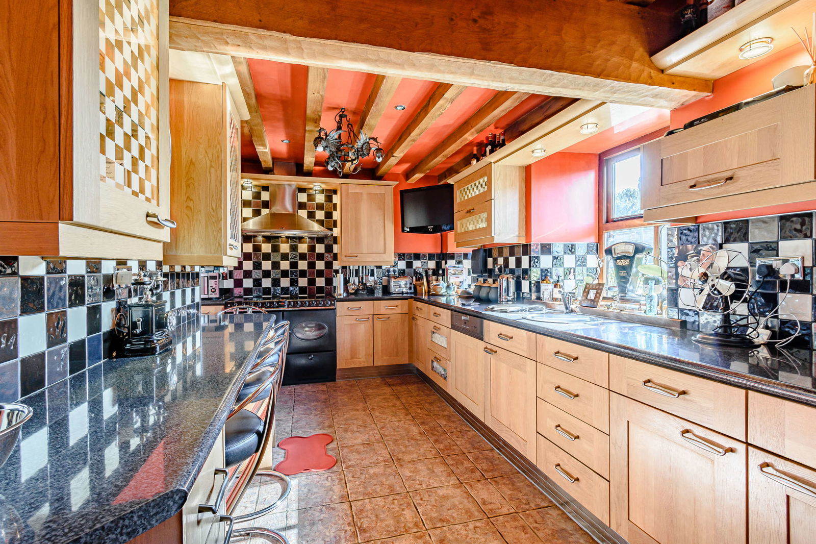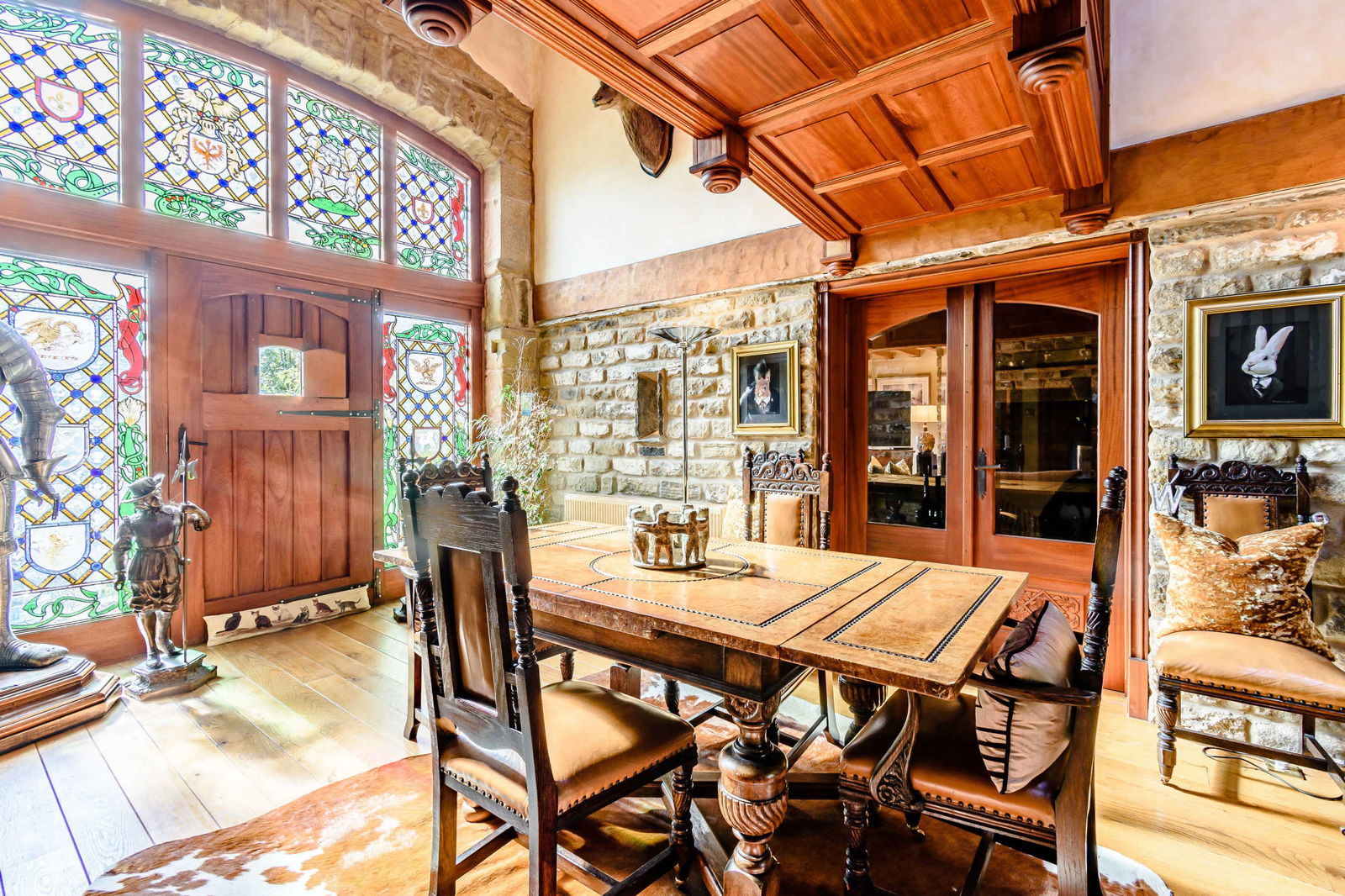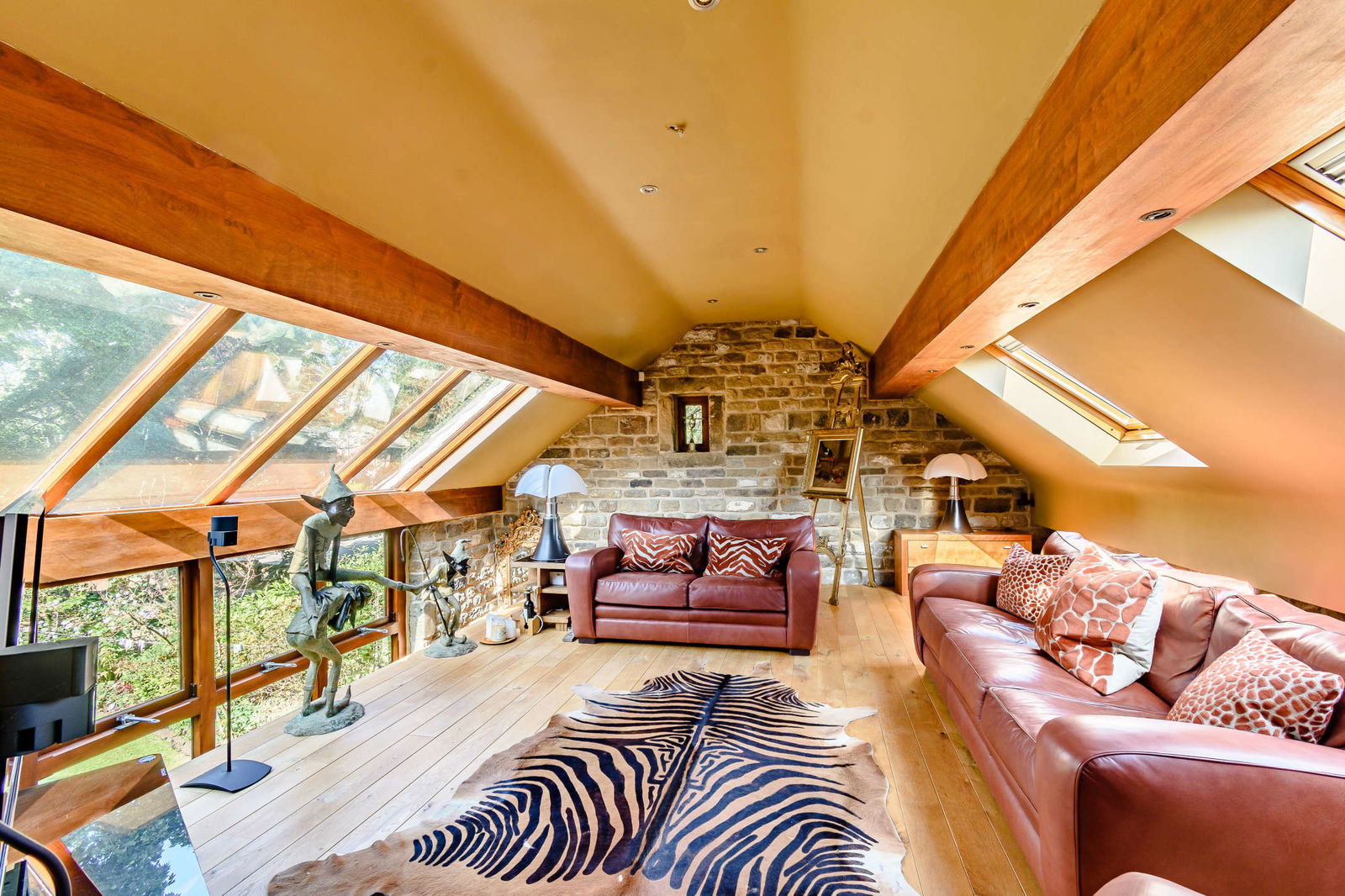 To the front aspect of the house a bespoke mahogany door sits within the original arch to the barn, which is glazed to the full height of the building ensuring natural light is invited indoors. The dining hall presents an impressive introduction to the home, enjoying an exposed double height ceiling into the apex of the building revealing exposed beams and trusses. The room has exposed stone to the walls, an oak floor and two sets of skylight windows whilst French doors open directly onto the rear garden. A bespoke mahogany staircase has detailed spindles and ornate carved newel posts and gives access to the first floor; a galleried mahogany bridge joining the landing to the principal bedroom suite. The ground floor has two additional reception rooms; a snug has exposed timbers, a window directly overlooking the rear garden and an oak floor. The Lounge Offers exceptional proportions, has an oak floor, windows to front and rear aspects, exposed timbers to the ceiling, exposed stone to one wall and a stunning inglenook stone fireplace which has an inset wood burning stove that sits on a stone flagged hearth. The kitchen has exposed timbers to the ceiling, windows overlooking the front garden and a stable style entrance door to the side aspect opening directly onto the driveway. The room has full tiling to the floor and is presented with a bespoke range of fitted kitchen furniture with roll edged work surfaces that incorporate a stainless steel sink. There is a five seater breakfast bar and a compliment of appliances which includes a Belling stove consisting of a double oven and grill with a six ring gas burner, a hotplate with extractor canopy over, a dishwasher and a fridge freezer. From the kitchen access is gained through to the utility, which is presented with furniture matching the kitchen, work surfaces incorporating a sink unit, plumbing for an automatic washing machine and space for a dryer. Access is gained through to a glass fronted hallway which overlooks the rear garden and has an exposed oak floor, exposed stone to the expanse of one wall and a mahogany staircase rising to the first floor mezzanine lounge/potential fifth bedroom. This stunning versatile room offers spacious accommodation, the glass façade overlooking the garden. The room has two Velux skylight windows and additional windows to both front and rear aspects, exposed stone to the walls, an oak floor and traditional cast iron radiators.