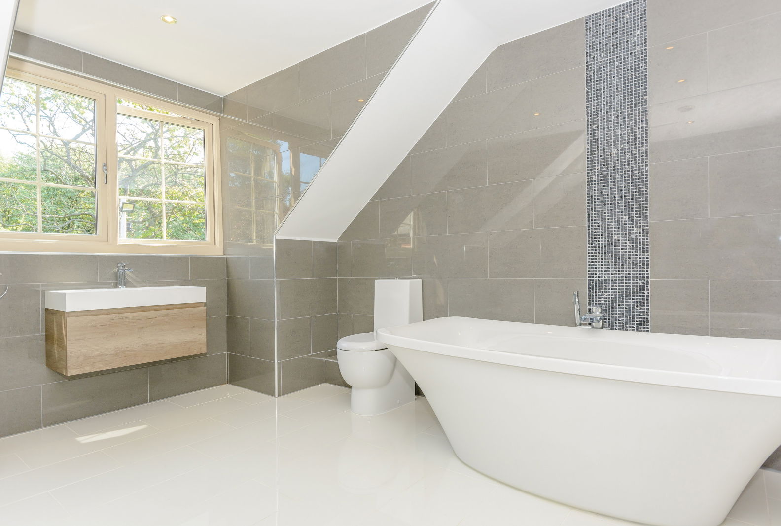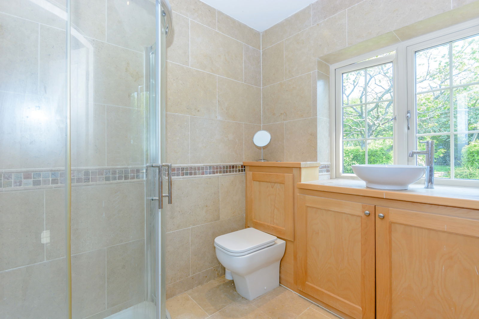 The family bathroom is generously proportioned with a five piece suite boasting Travertine tiling to the floor whilst a sash window commands stunning long distance views.