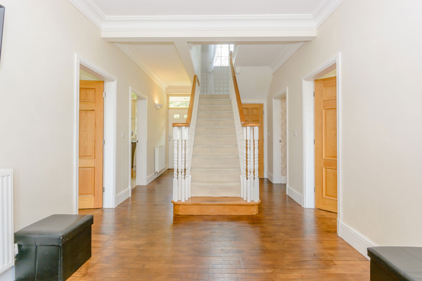 An entrance door opens to a reception hall which presents an impressive introduction to the property with a central staircase rising to the first floor level with storage cupboard beneath. The hall displays a retained original oak floor, ornate coving to the ceiling whilst a rear door opens directly onto the rear garden. Off the hall is a cloaks room / W.C which is presented with a modern two piece suite.