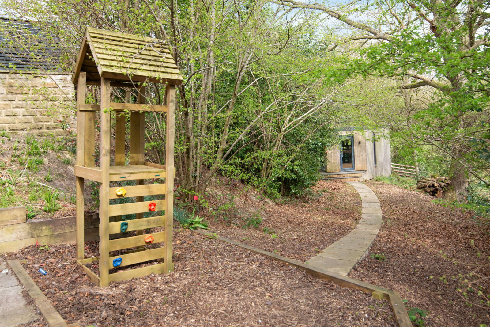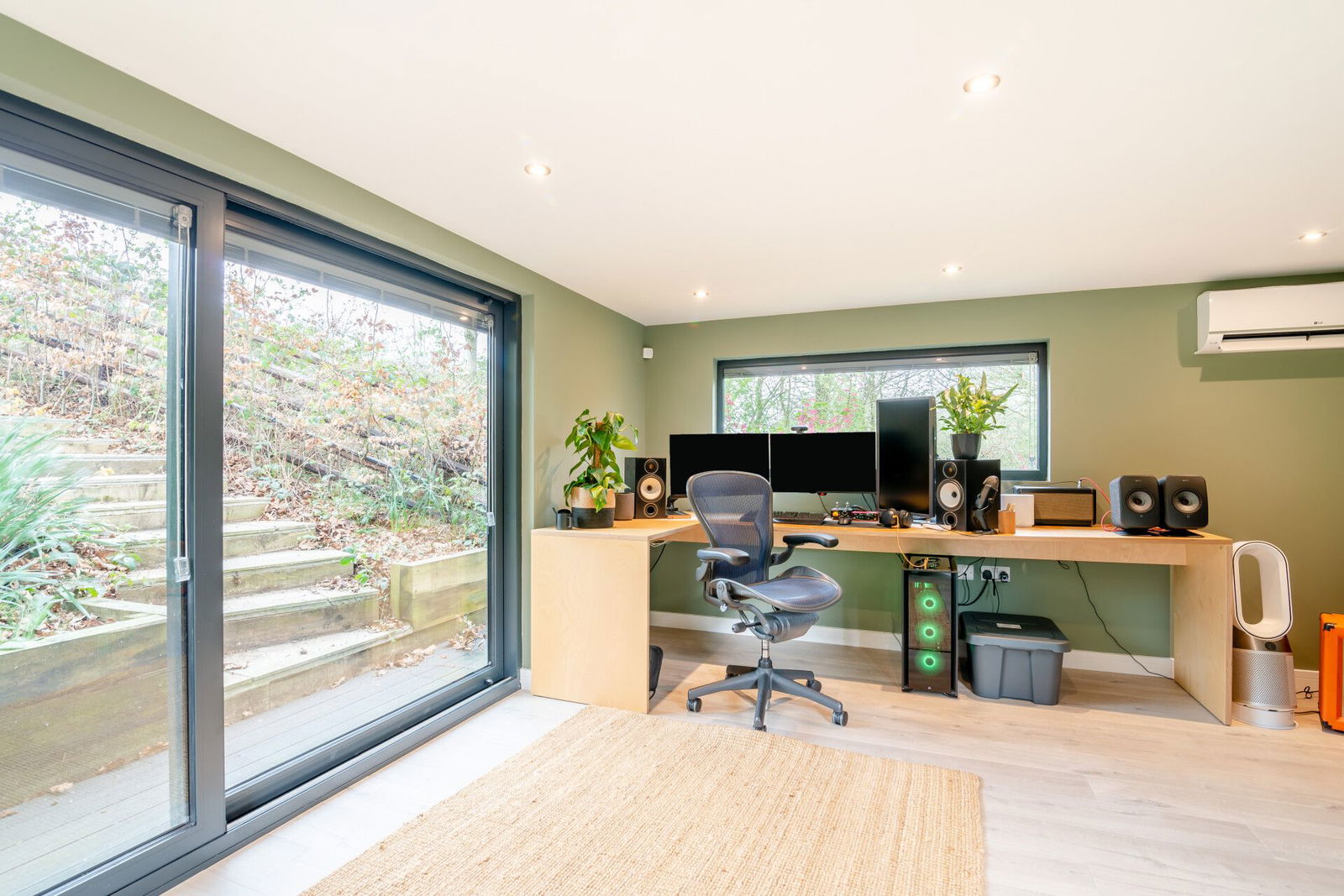 Electric double gates open onto a generous tegular block paved driveway which provides off road parking for several vehicles, there is a forecourt lawn and integral double garage which would make a fantastic games room with electric doors, a tiled floor and electric car charging point. A path leads through a woodland area at the side of the home to a purpose built home office which is heated and has air conditioning, power, lighting, and windows to three aspects.