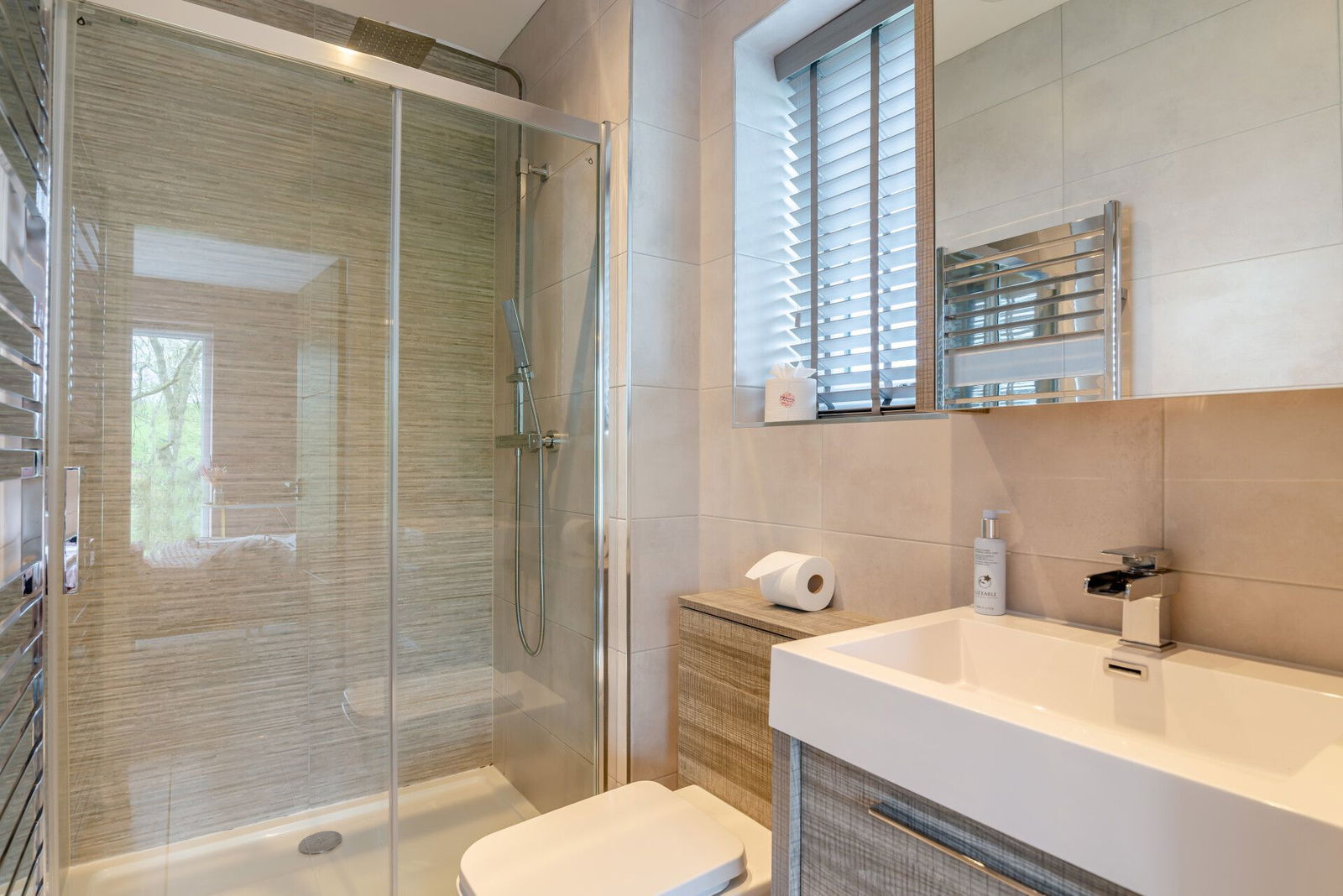 The family bathroom presents with a modern four piece suite consisting of a free standing double ended bath, a low flush W.C, a wash hand basin with vanity drawers beneath and a shower, the room having contemporary tiling to the walls and floor, a frosted window and a heated chrome towel radiator.