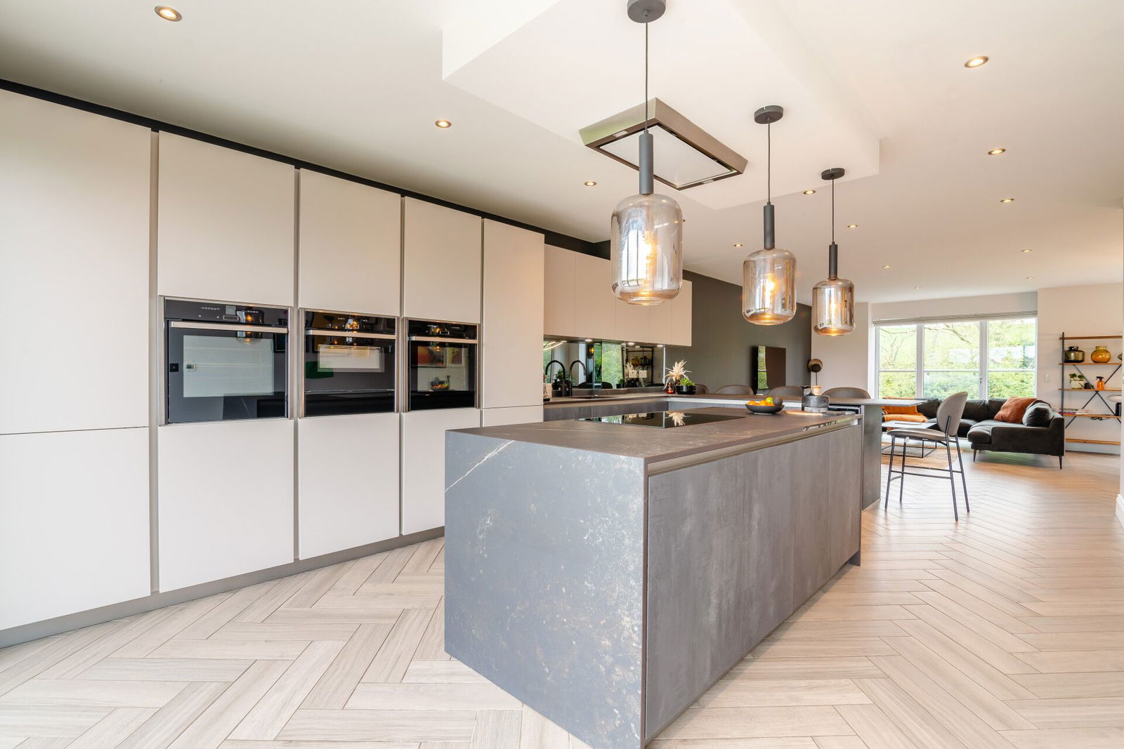 A bespoke range of kitchen furniture by Inspired Designs with Schuller units has Dekton work surfaces extending to a five seat breakfast bar with glass mirrored splashbacks and an inset sink unit with hot Quooker tap and InSinkErator. A central island has an inset induction hob with extraction over and additional cupboards beneath. An additional complement of appliance by Neff includes twin ovens, a combination microwave with a warming drawer, full height fridge and freezer, a dishwasher and a wine chiller.