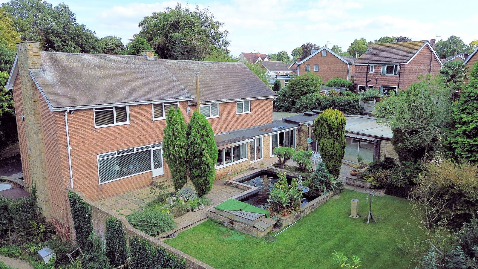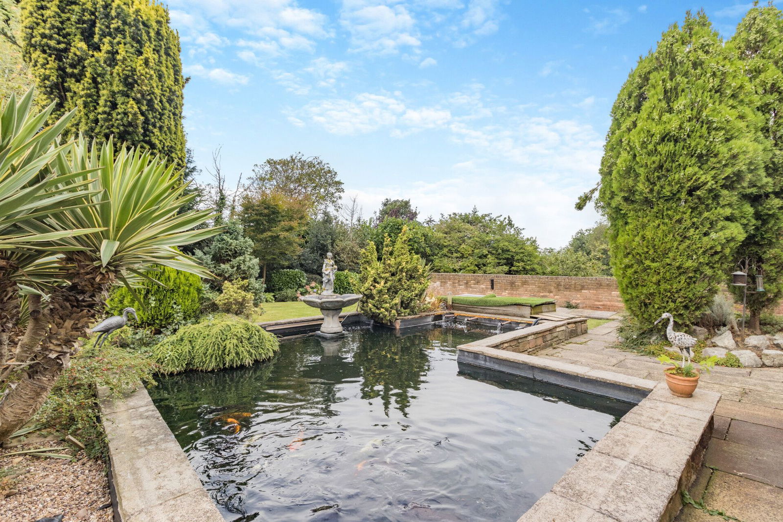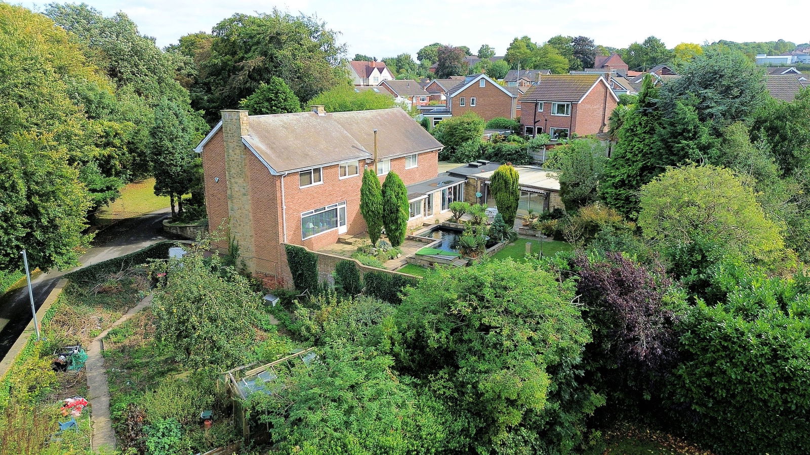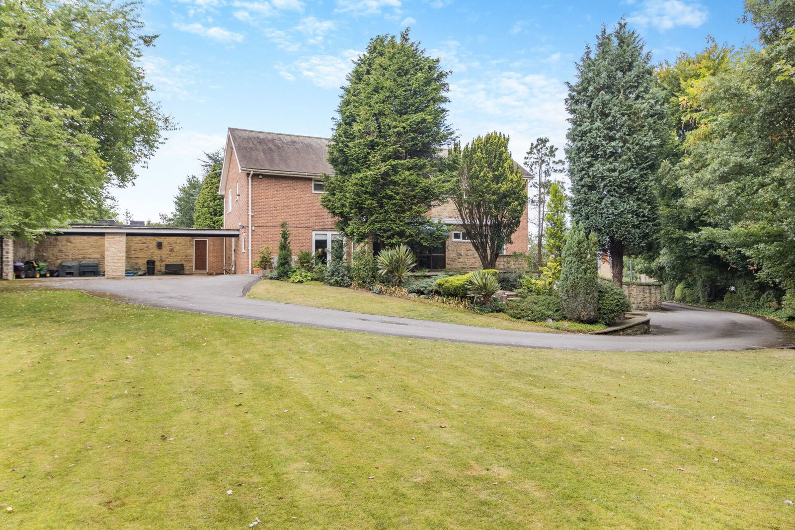 The property occupies a generous plot extending to approaching 1 acre, wrapped within a protective tree lined boundary; electronic wrought iron gates opening to a sweeping driveway extending through the grounds passing the double garage and front of the house before arriving at the double width carport which offers covered parking for several vehicles. At the immediate front aspect of the home is a south facing flagged terrace with surrounding planted beds, shrubs and trees overlooking a level lawned garden. At the side of the property, enclosed with a brick walled surround a former vegetable garden offers versatile space. The rear garden is privately enclosed, a flagged terrace at the rear of the home adjoins a koi pond and overlooks a level lawn which has established surrounding beds and a treelined border.
