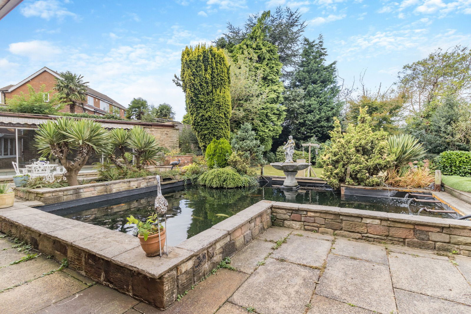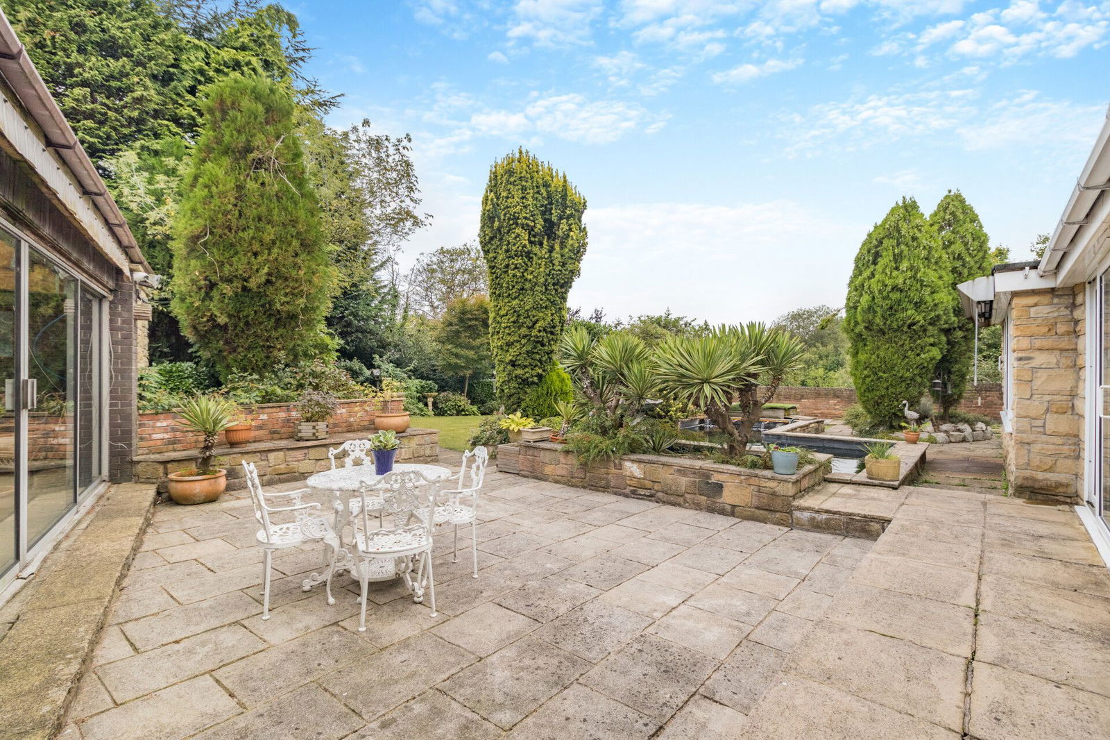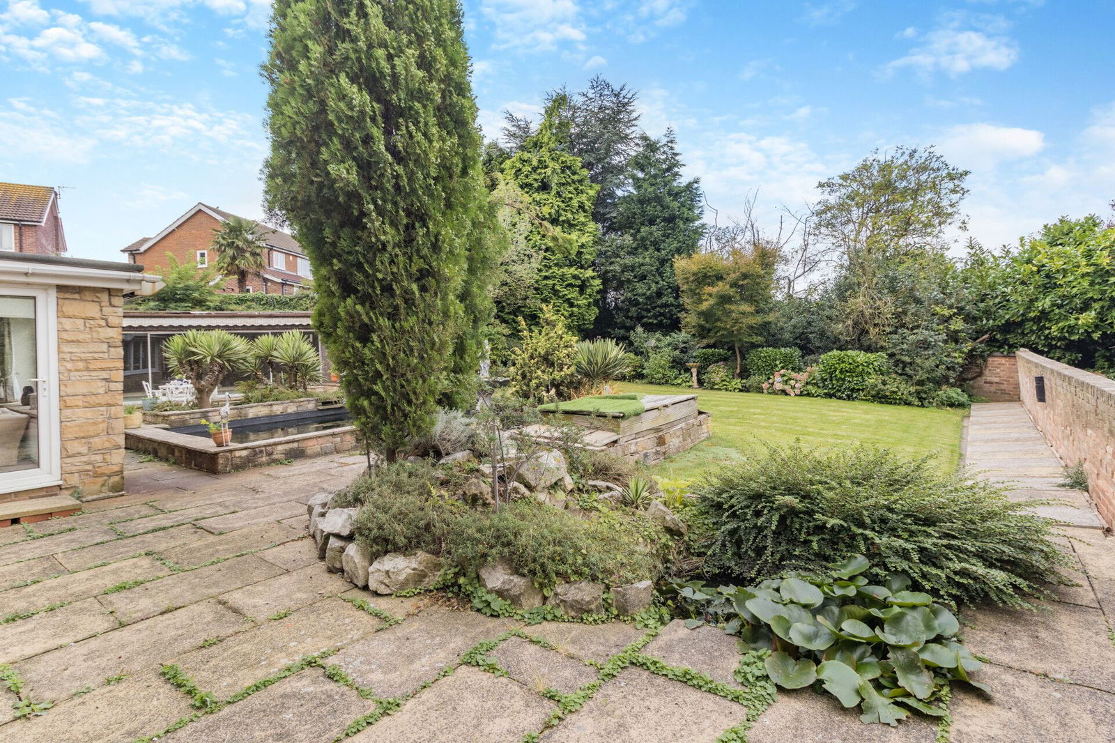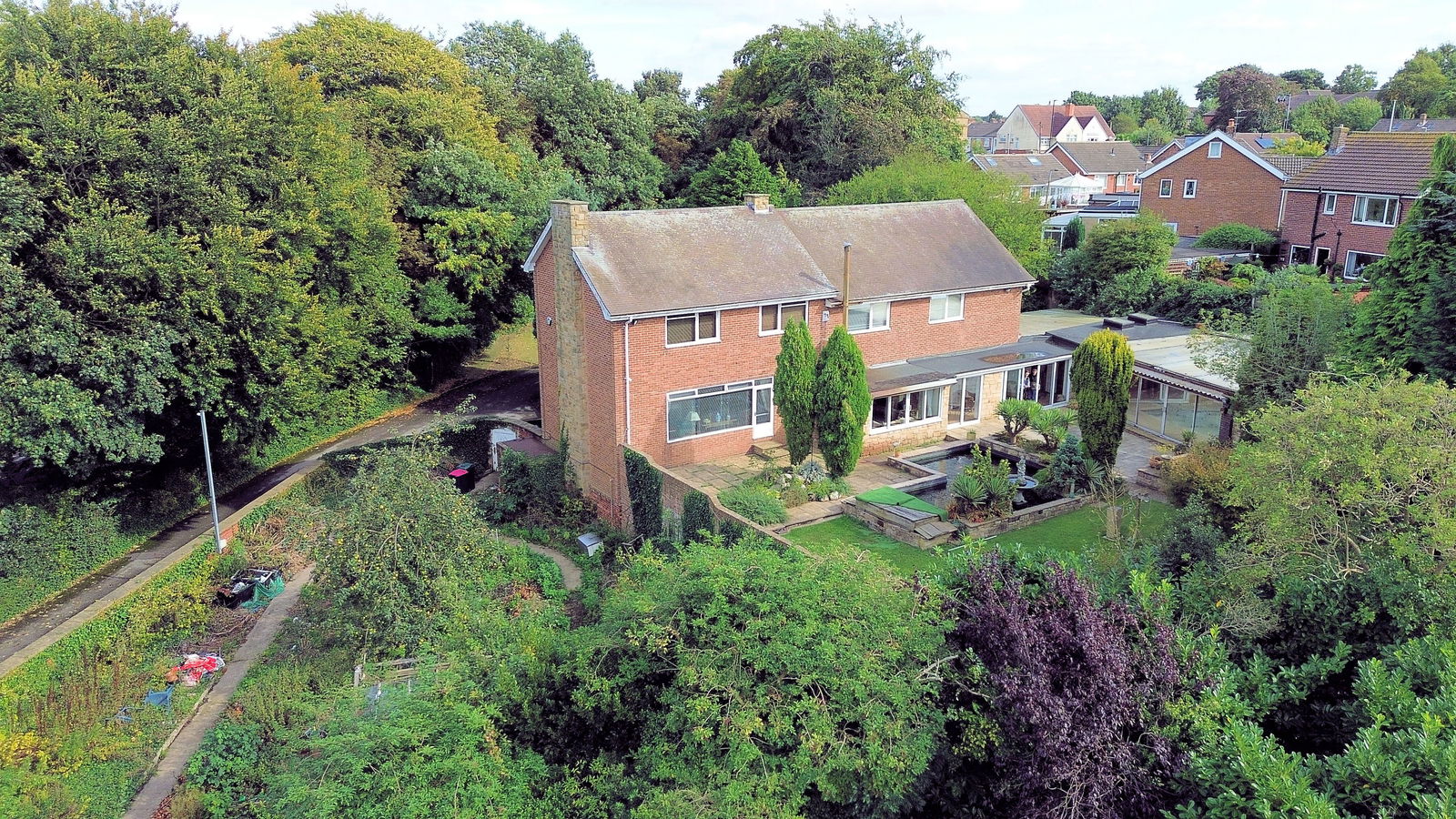 The property occupies a generous plot extending to approaching 1 acre, wrapped within a protective tree lined boundary; electronic wrought iron gates opening to a sweeping driveway extending through the grounds passing the double garage and front of the house before arriving at the double width carport which offers covered parking for several vehicles. At the immediate front aspect of the home is a south facing flagged terrace with surrounding planted beds, shrubs and trees overlooking a level lawned garden. At the side of the property, enclosed with a brick walled surround a former vegetable garden offers versatile space. The rear garden is privately enclosed, a flagged terrace at the rear of the home adjoins a koi pond and overlooks a level lawn which has established surrounding beds and a treelined border.