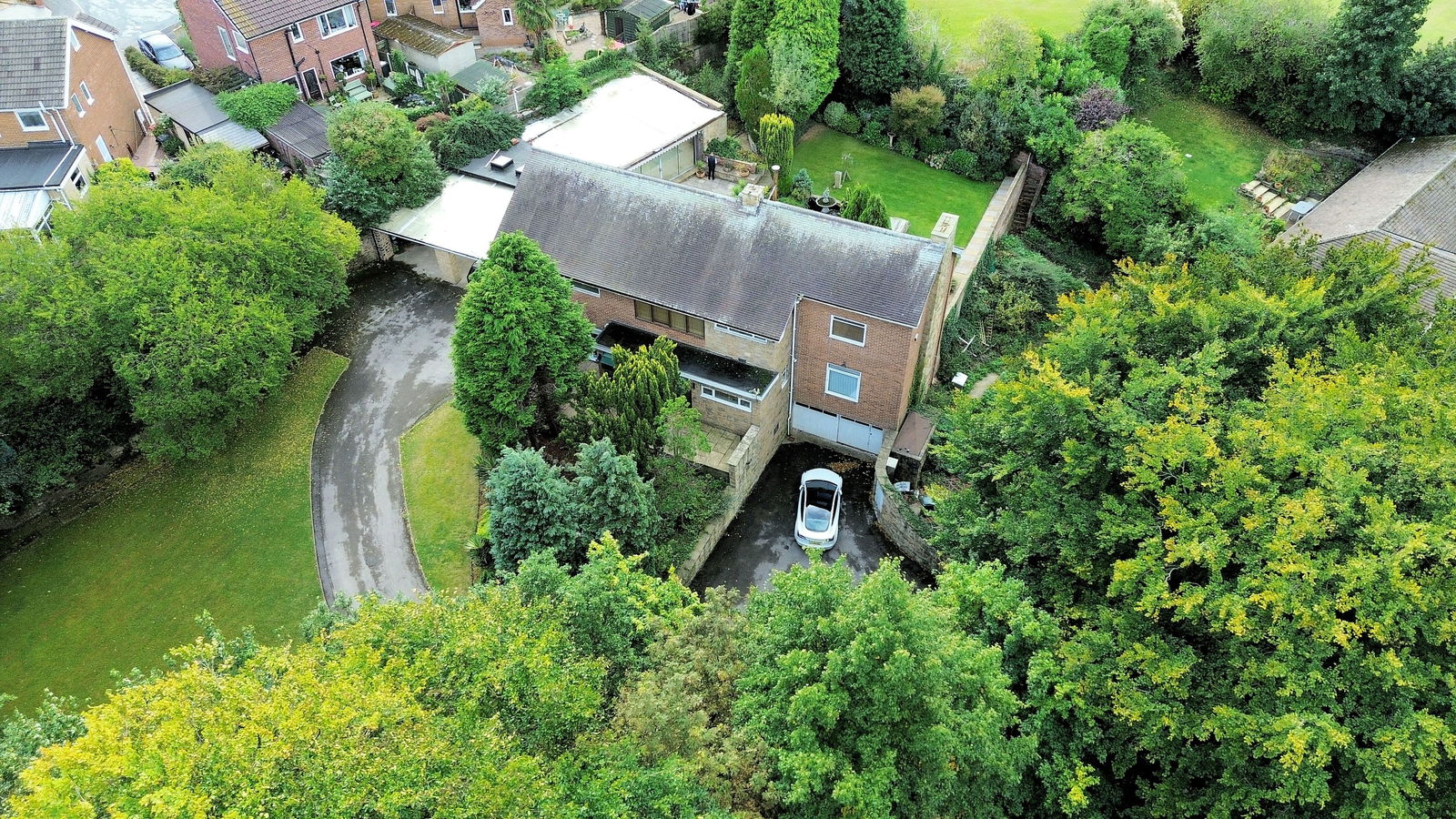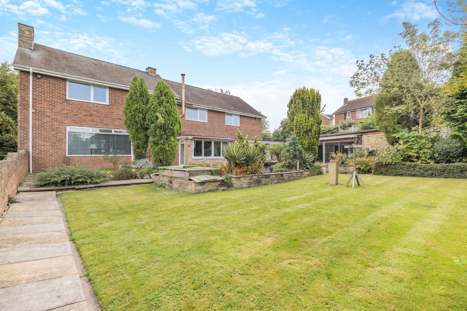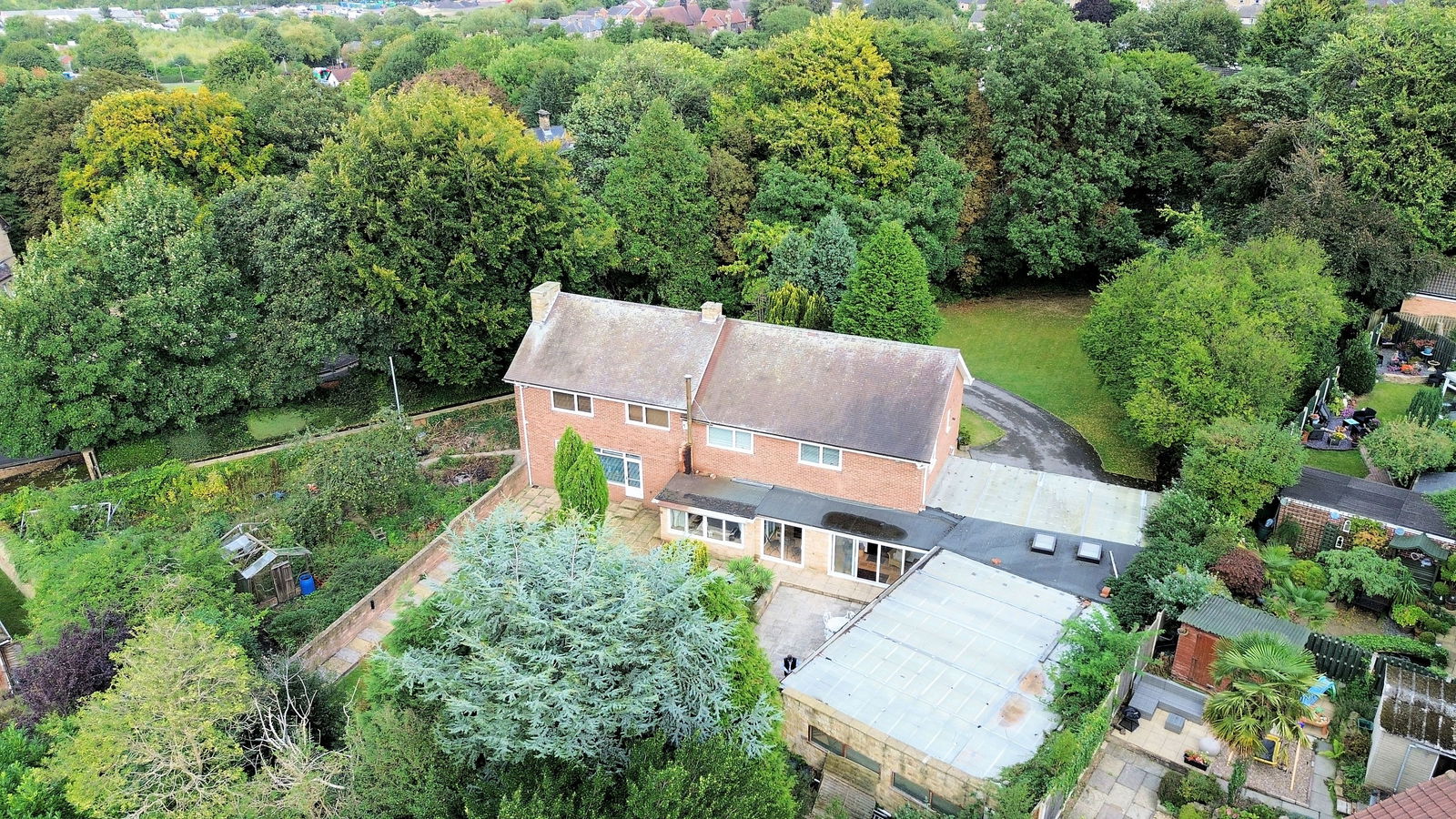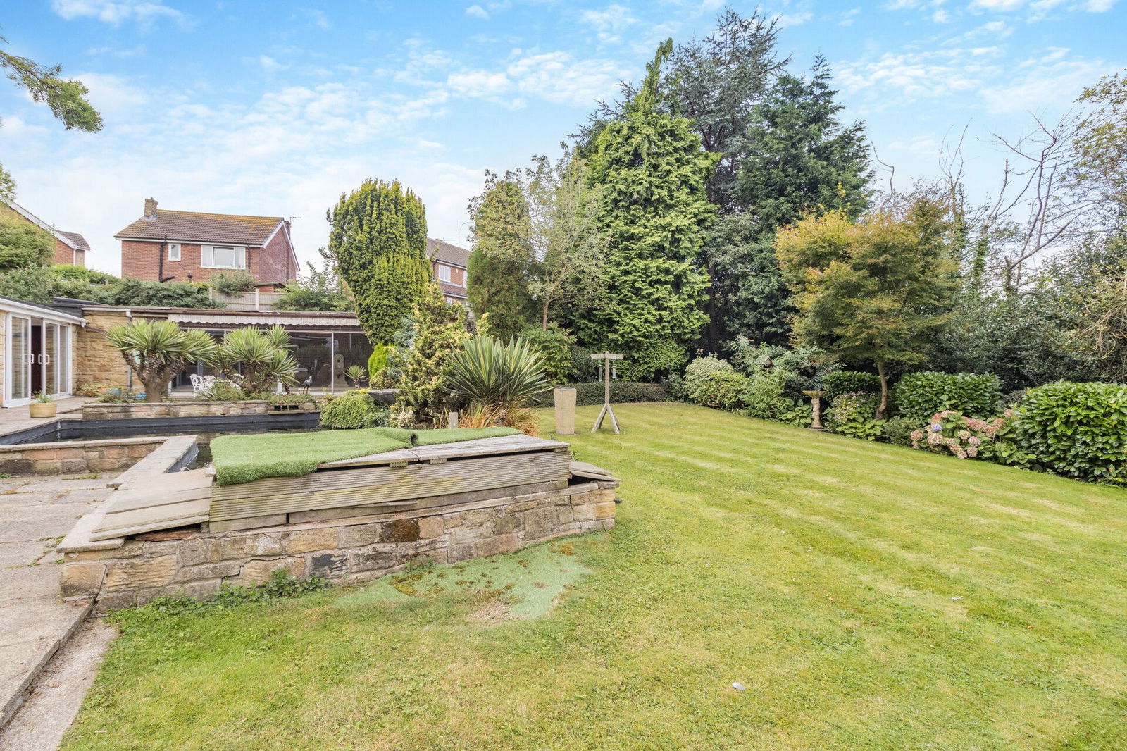 The property occupies a generous plot extending to approaching 1 acre, wrapped within a protective tree lined boundary; electronic wrought iron gates opening to a sweeping driveway extending through the grounds passing the double garage and front of the house before arriving at the double width carport which offers covered parking for several vehicles. At the immediate front aspect of the home is a south facing flagged terrace with surrounding planted beds, shrubs and trees overlooking a level lawned garden. At the side of the property, enclosed with a brick walled surround a former vegetable garden offers versatile space. The rear garden is privately enclosed, a flagged terrace at the rear of the home adjoins a koi pond and overlooks a level lawn which has established surrounding beds and a treelined border.