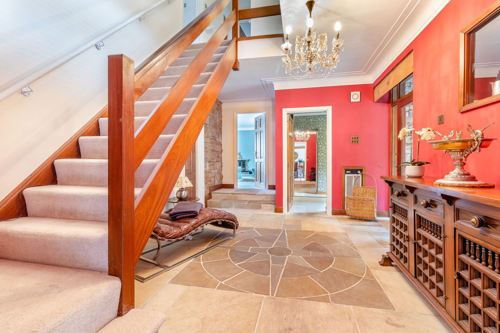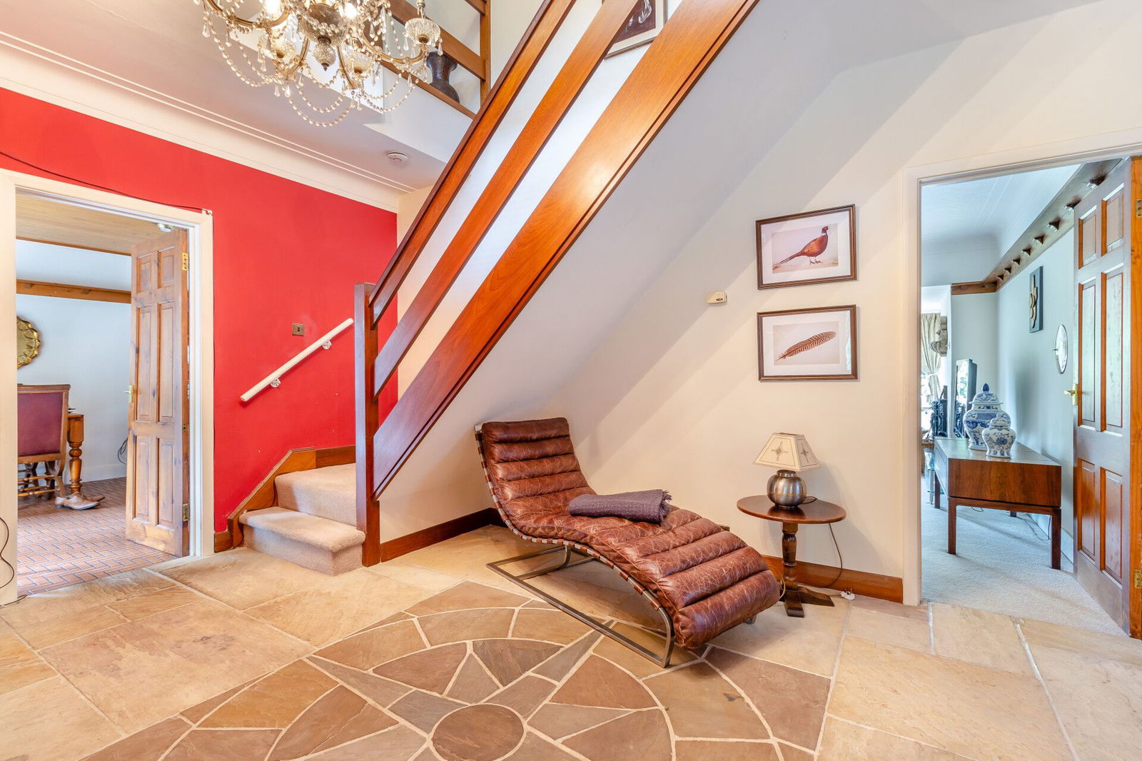 An entrance door to the front of the home opens into a glass fronted reception area which in turn has a door into the hallway, offering an impressive introduction to the home with a stone floor, staircase and access to a cloakroom which has a coats cupboard and a wash basin. An enclosed separate W.C is presented with a low flush W.C.
