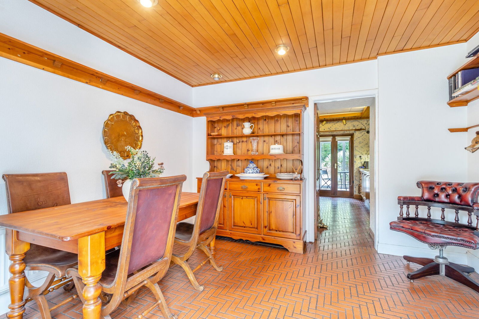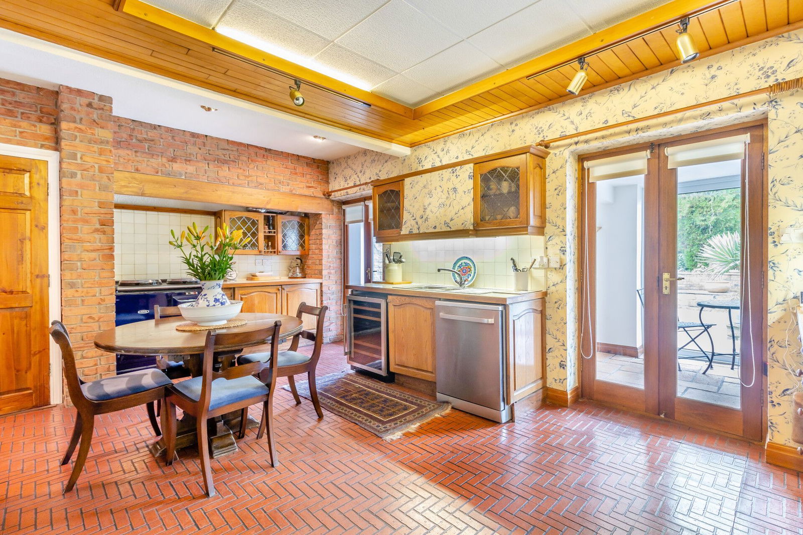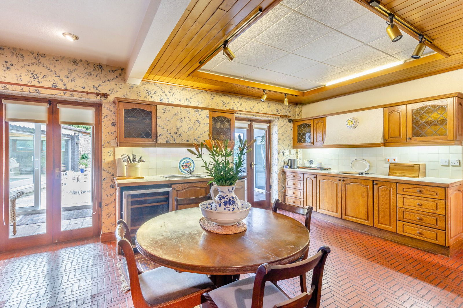 The dining room has full tiling to the floor continuing through to the kitchen and French doors which open onto a flagged terrace at the front aspect of the home, overlooking the garden enjoying a south facing aspect.