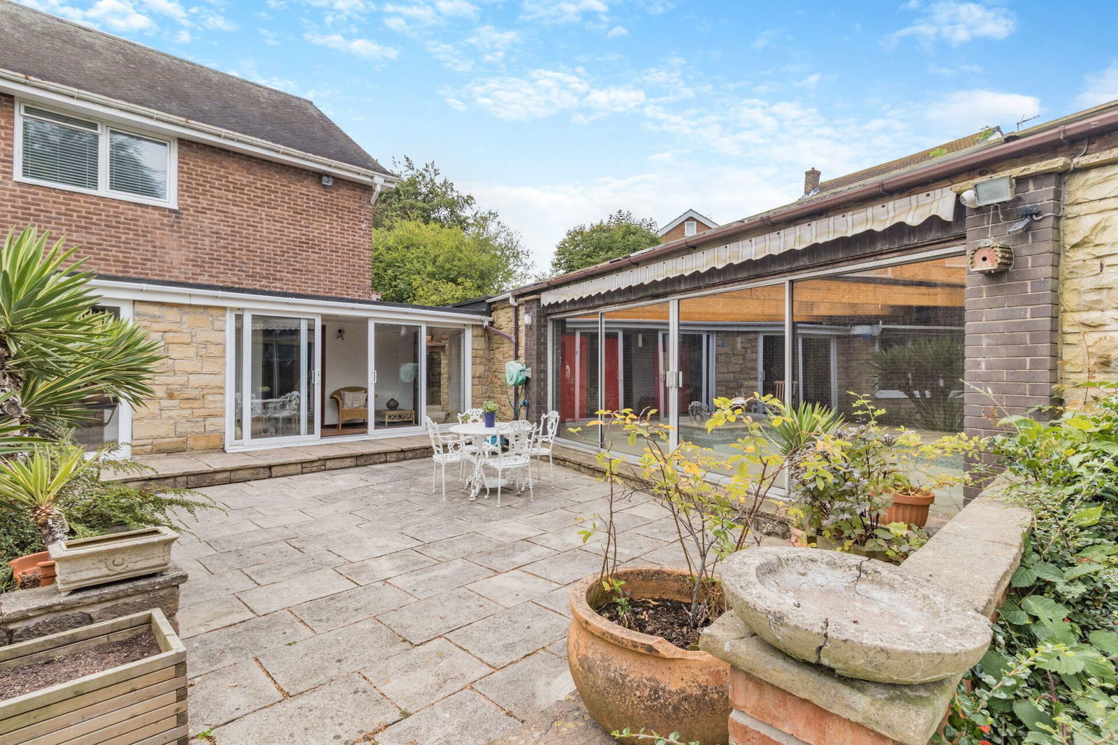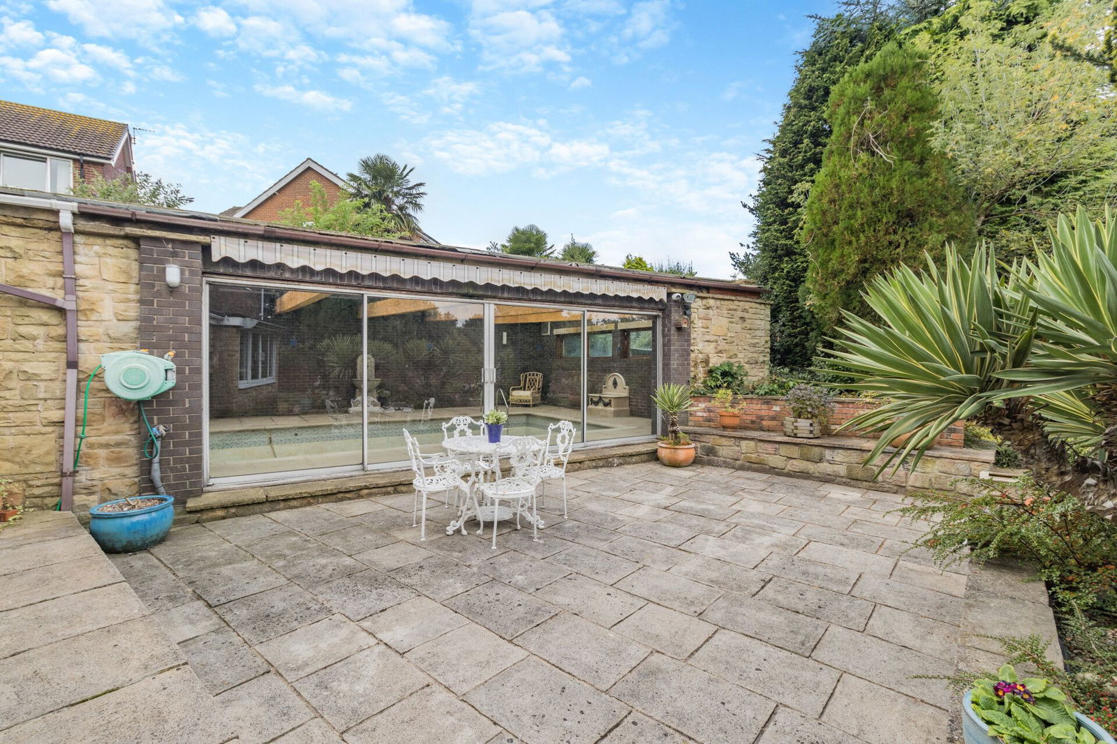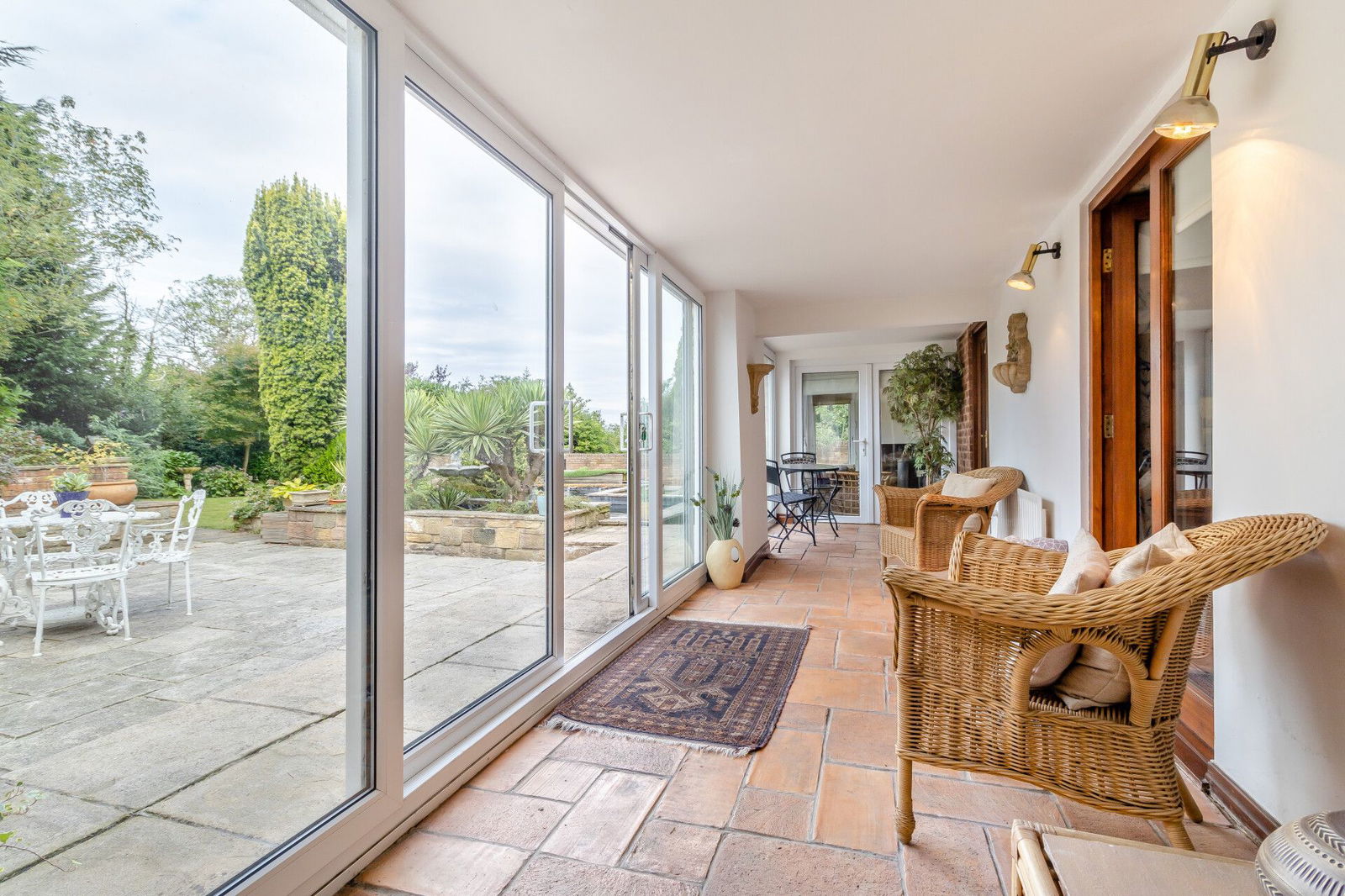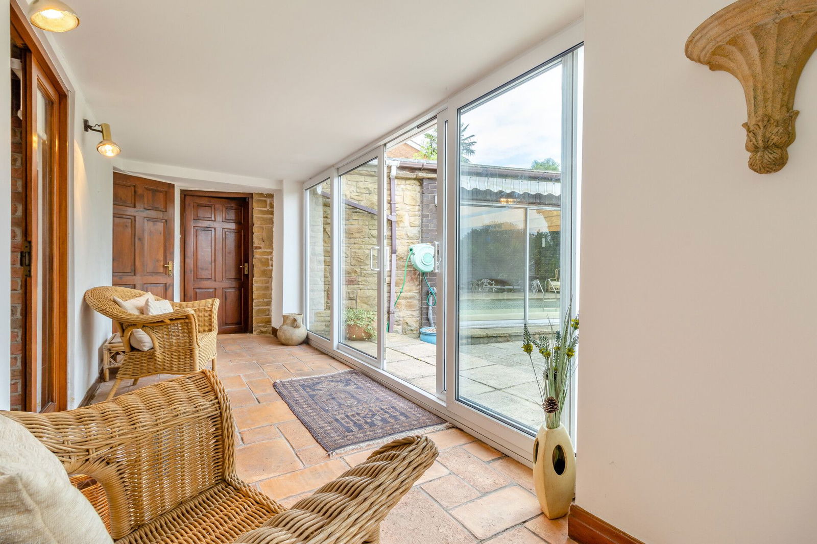 The summer/garden room adjoins the kitchen and sitting room, has a door to the carport and access to the swimming pool whilst two sets of sliding patio doors open directly onto a flagged terrace at the rear aspect of the home overlooking the gardens.