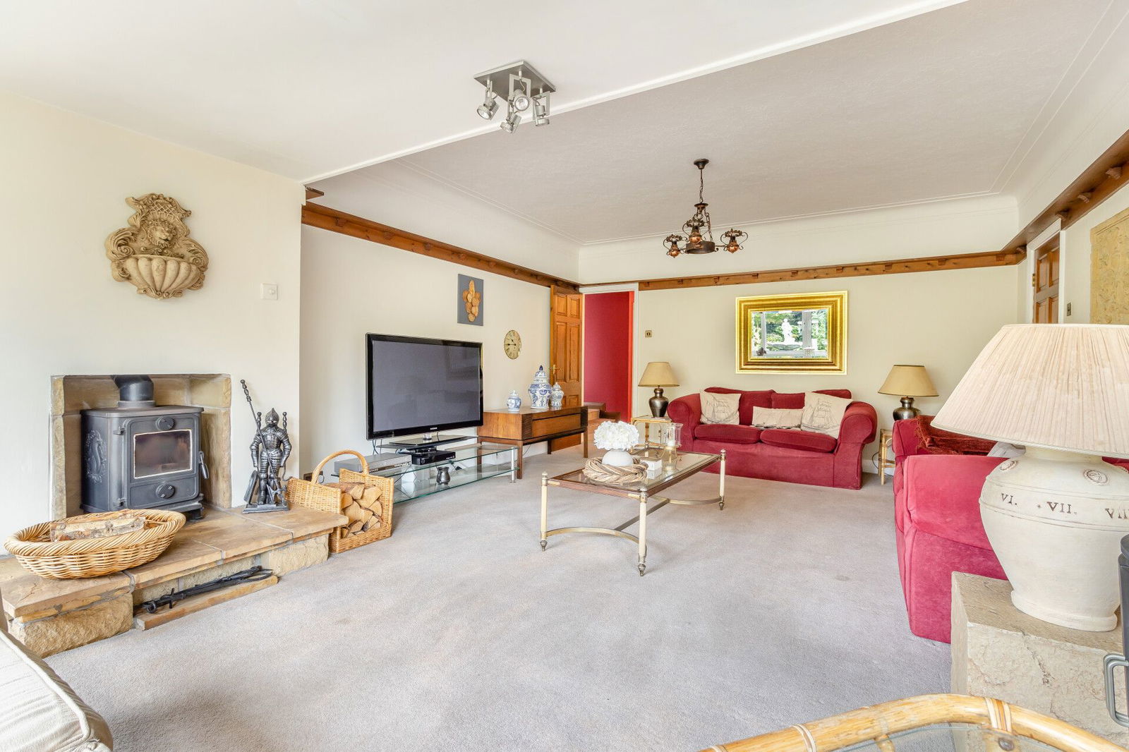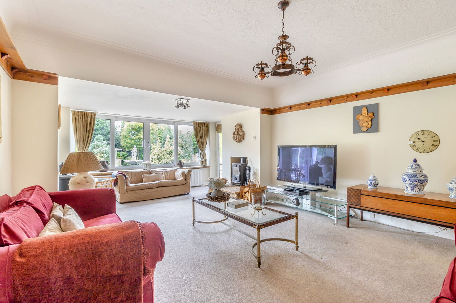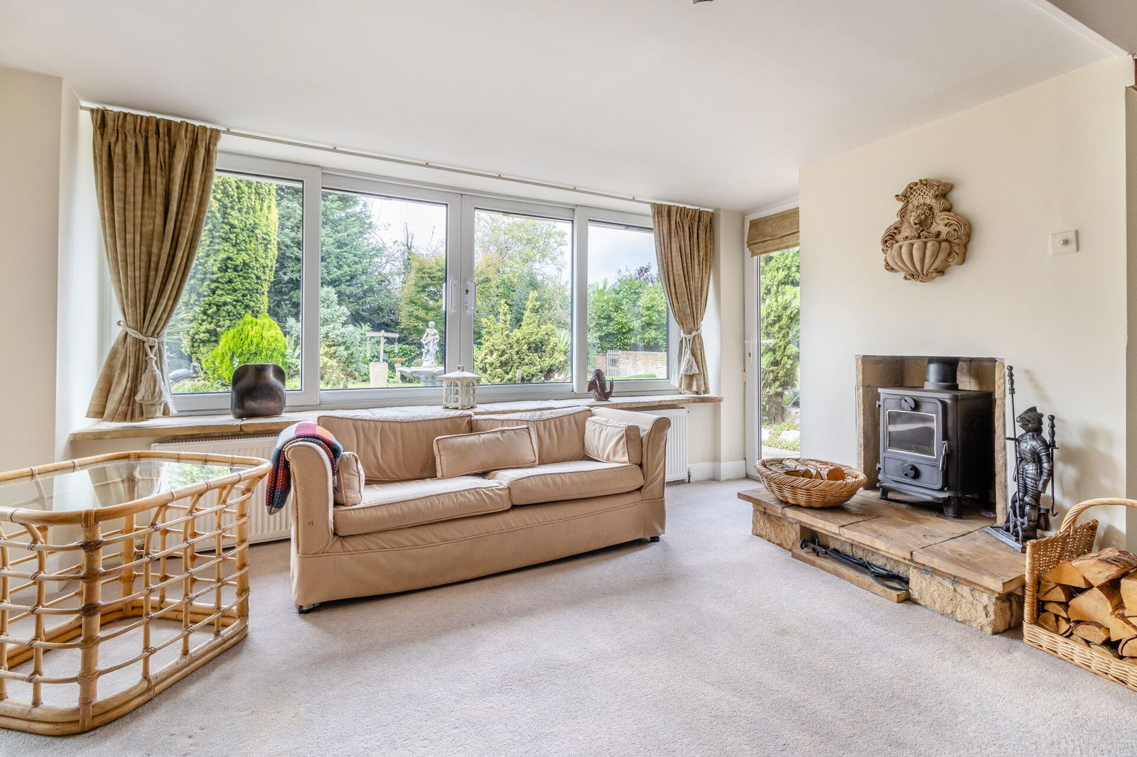 A generous sitting room adjoins the kitchen, has French doors opening to the garden room and a window looking directly over the rear garden and Koi-pond. A wood burning stove is set back into a chimney breast and a secondary door leads back to the hallway.