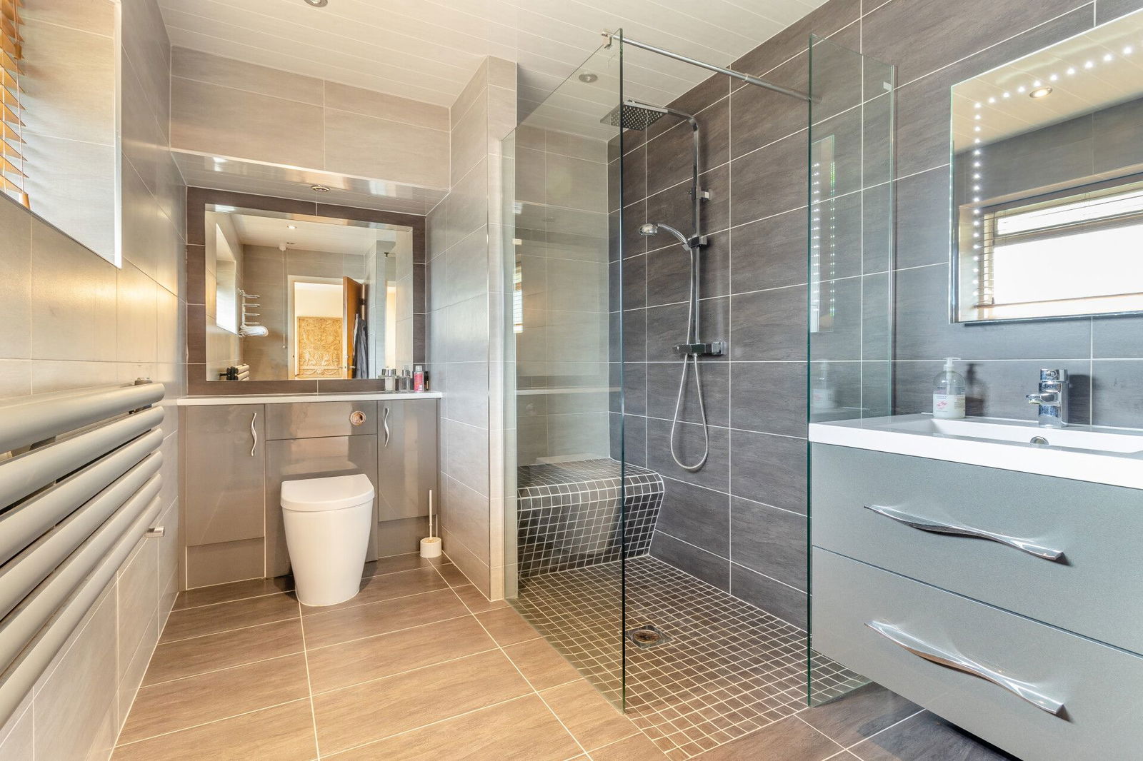 The modern family bathroom presents a low flush W.C, a step-in wet room style shower with fixed seat and a wash hand basin with floating vanity drawers beneath; full tiling to the walls and floor, a frosted window, spotlighting to the ceiling and a contemporary styled heated towel radiator.