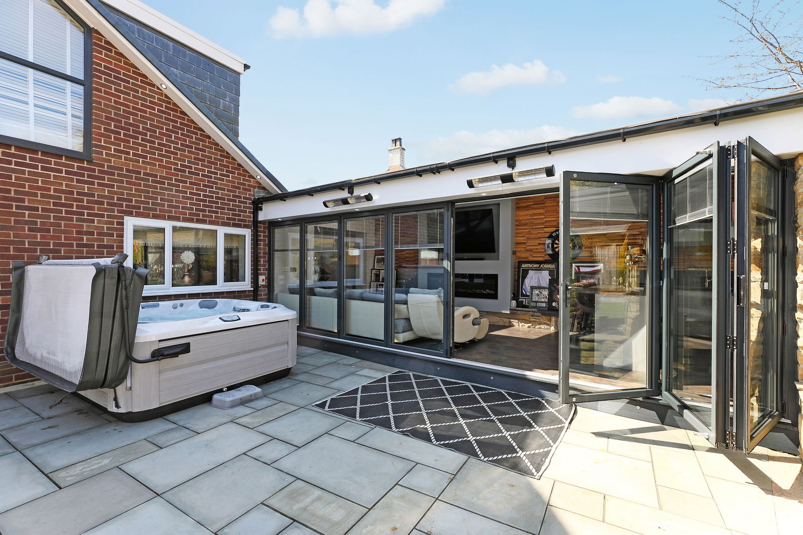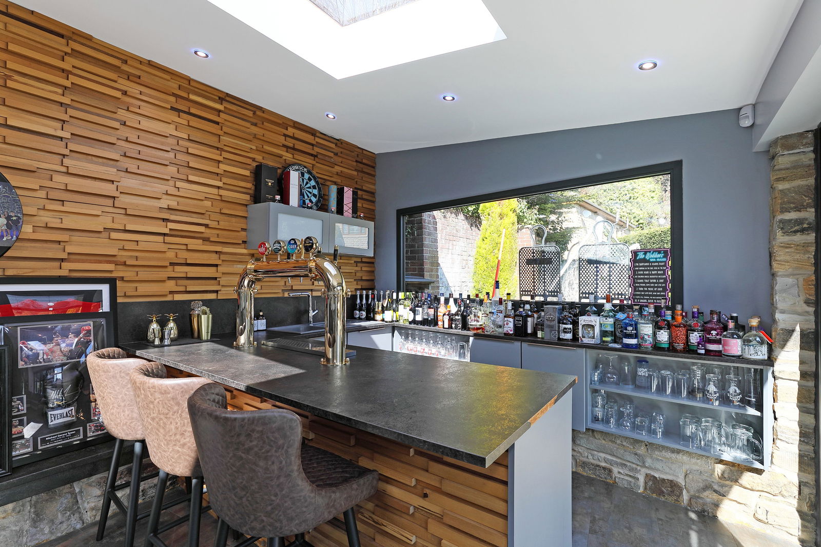 The leisure suite offers an impressive addition to the home, a bar and lounge area having skylight windows, a window to the garden and a bank of bi-folding doors opening onto the flagged garden terrace.There is a media wall with instant feature electric fire contemporary designed wood cladding to the wall and a home bar with a work surface incorporating a sink unit, pumps and bottle chillers. The room extends to an additional area, currently used as a home gymnasium with French doors opening to the front garden and a Velux skylight window.