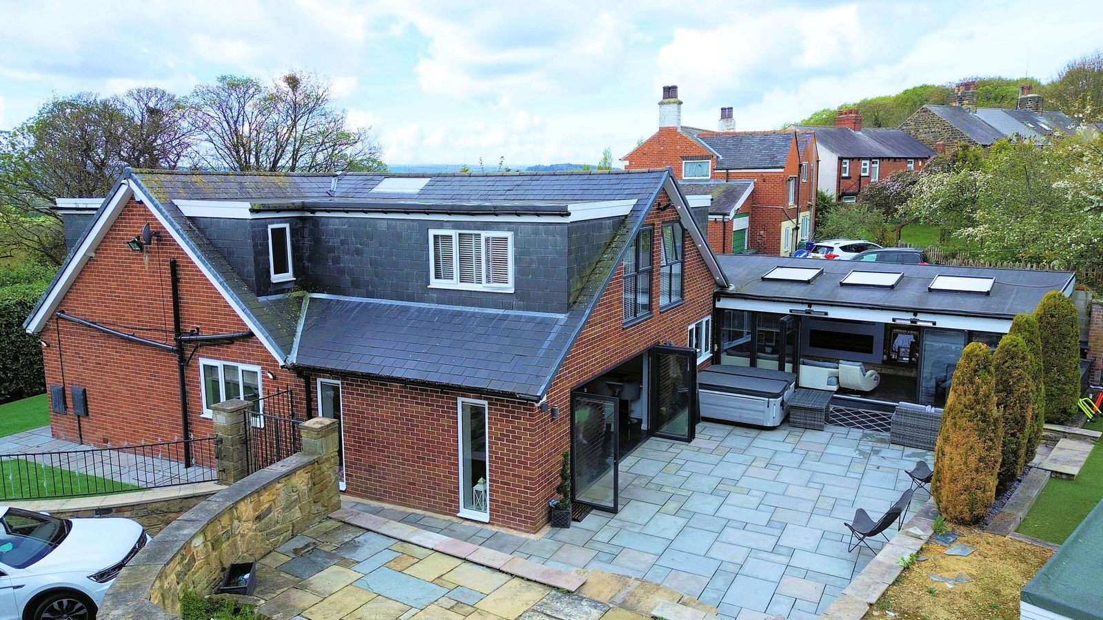 The property occupies a generous plot enjoying a tucked away position, set behind a hedged border. Artificial low maintenance lawns at the front and side of the property are accompanied by paved walkways and a patio. The majority of the grounds are positioned to the rear of the rear aspect of the home, a sunken terrace adjoins both the kitchen and leisure suite before stepping up to a raised stone flagged garden terrace beyond which is an artificial grassed lawn set within a fence boundary. A double garage has an electronically operated entrance door, power and lighting. There is additional parking to the drive in front of the garage.