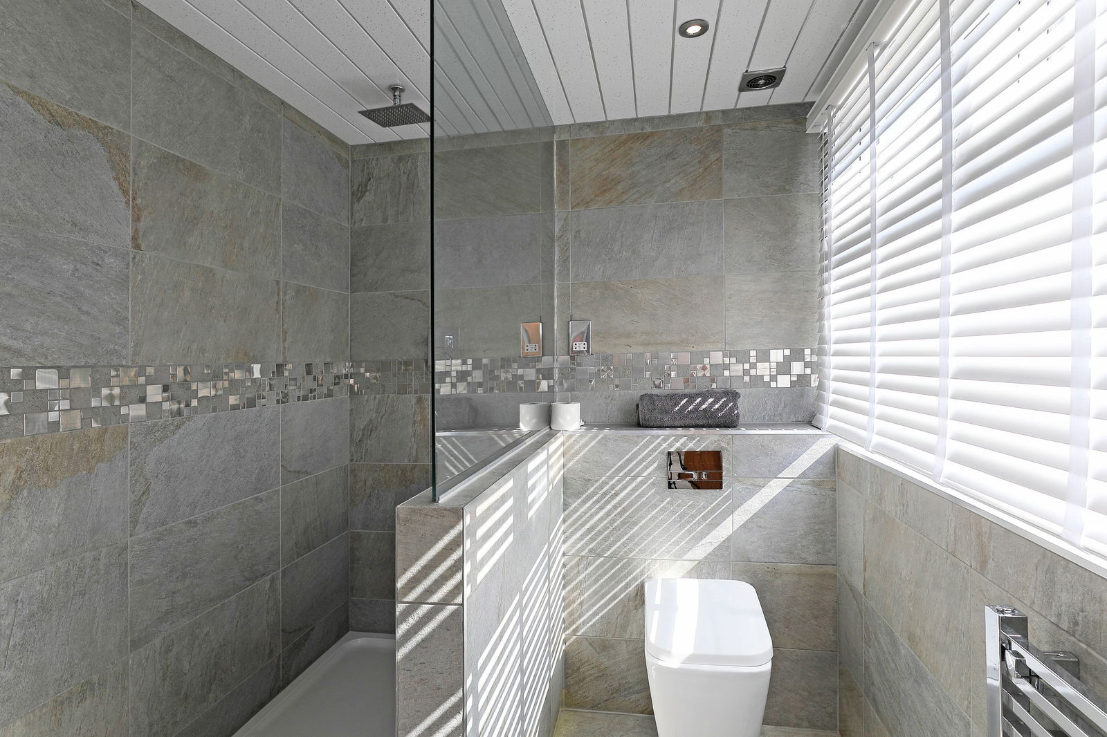 The family bathroom is presented with a shower and steam room with a fixed window, a jacuzzi spa bath with T.V inset to the wall, a low flush W.C and a wash hand basin with vanity drawers beneath. The room has contrasting tiling to the walls a frosted window, a vertical contemporary radiator.