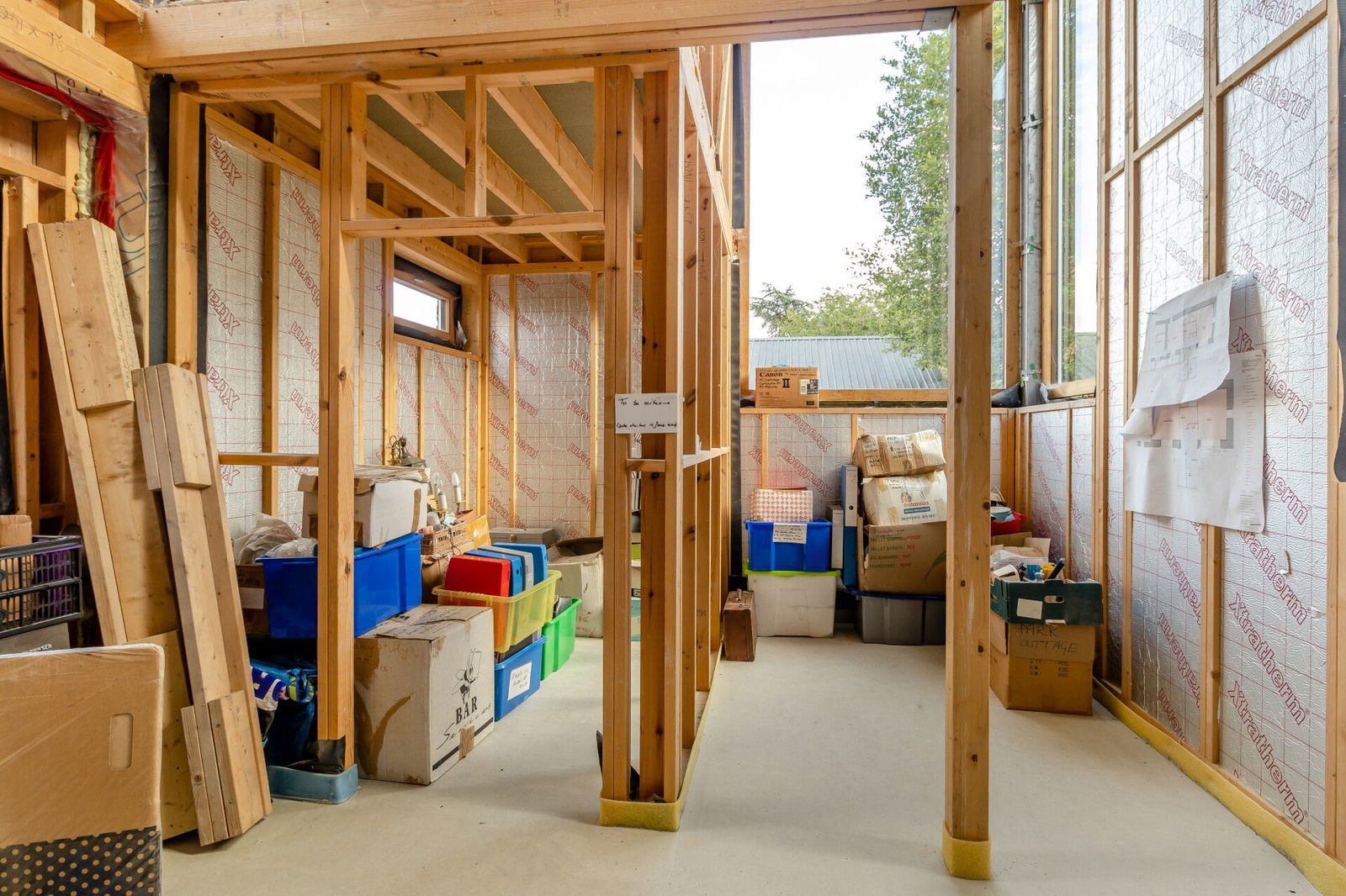 A timber gate opens to a block paved driveway providing parking for several vehicles. To the left side of the driveway, there is a paddock that is partially enclosed by fencing, previously utilised as a ménage, beneath which the ground source heat exchange coils for the heat pump are installed.