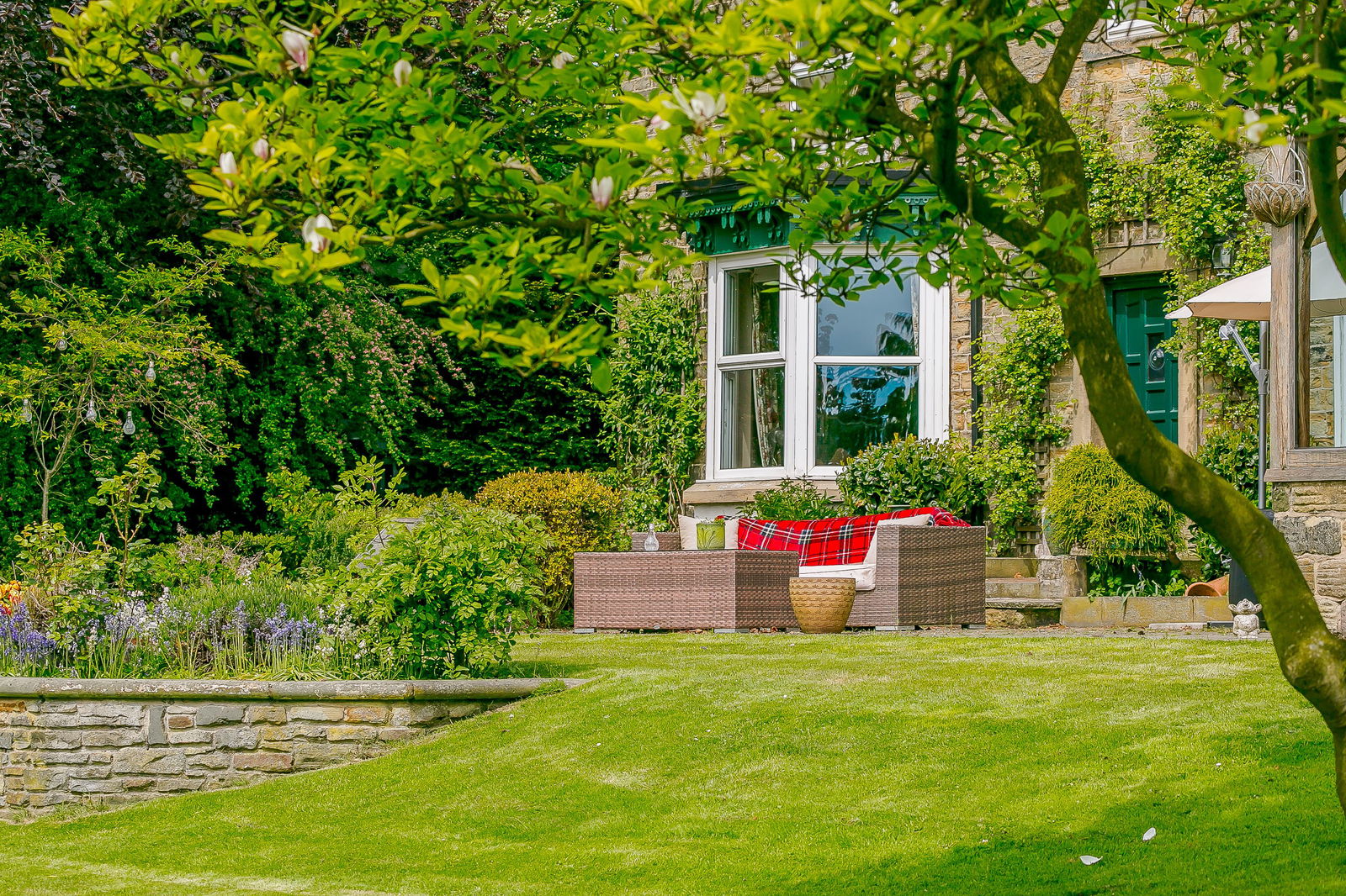 From the driveway, two sets of stone steps rise to a stone flagged terrace at the front of the property. A stone path from the patio leads around the perimeter of the orangery to a further seating terrace with planted borders.