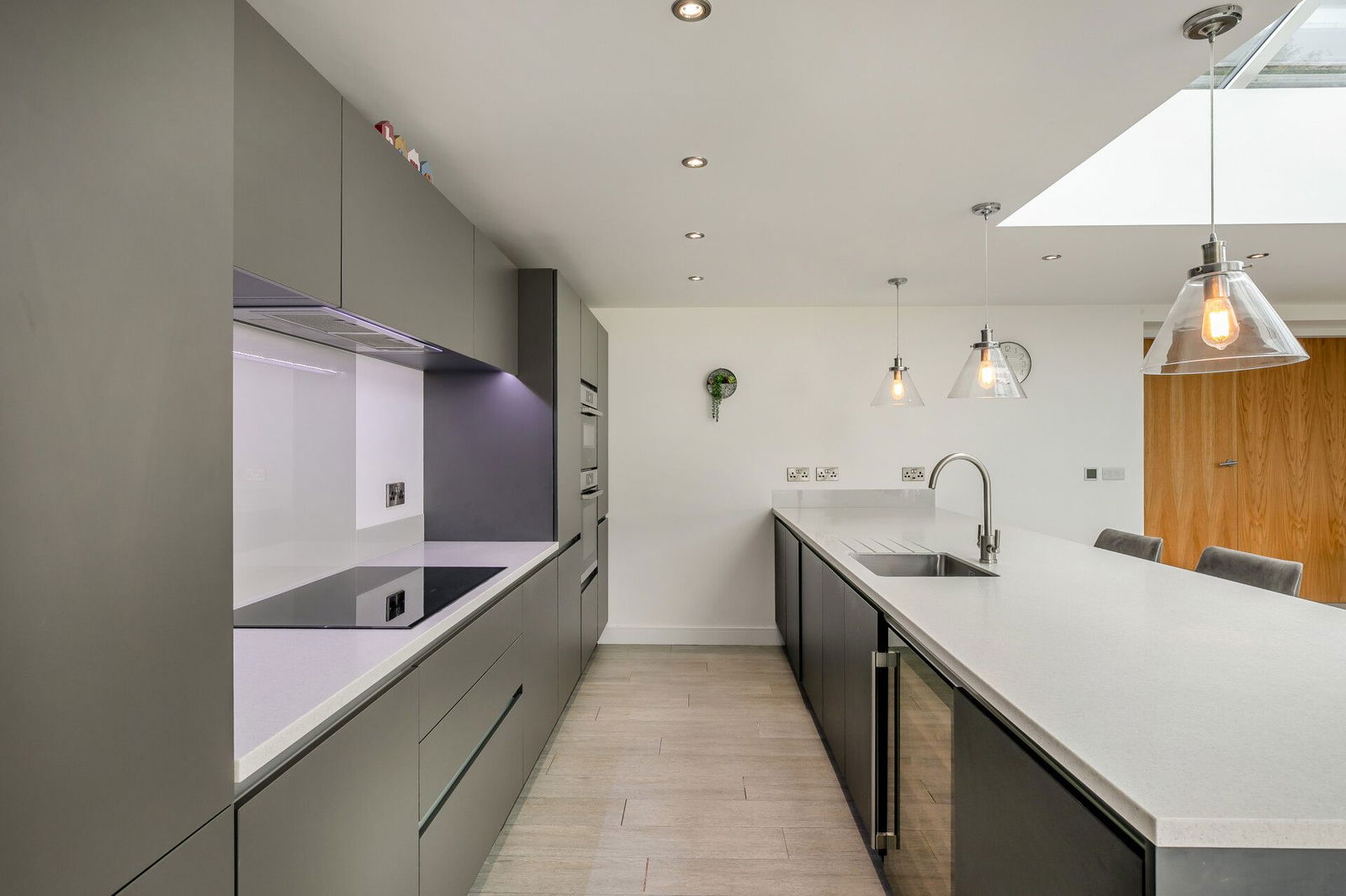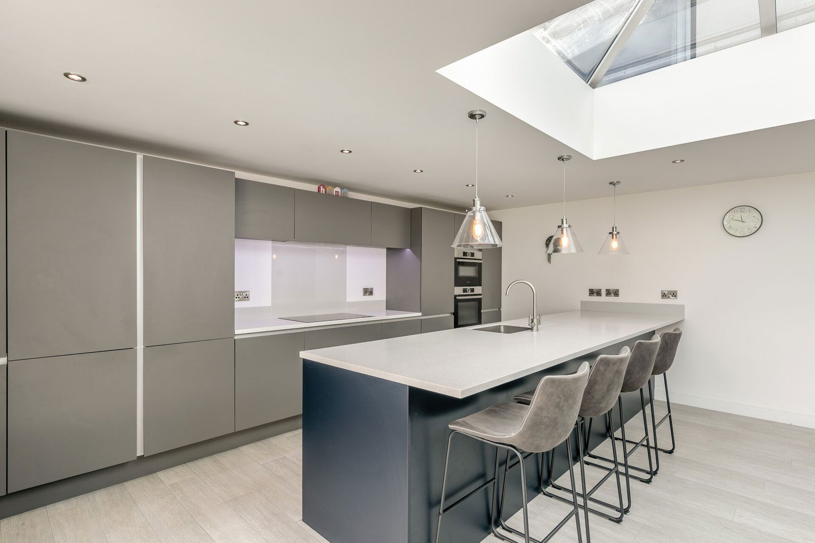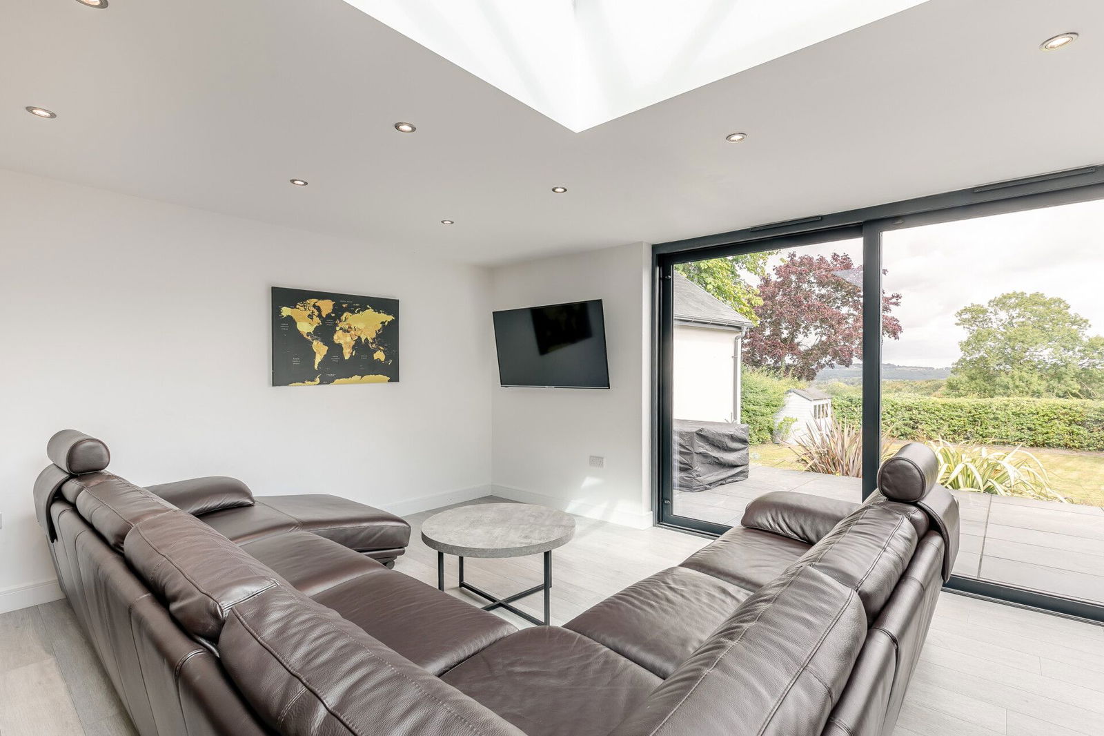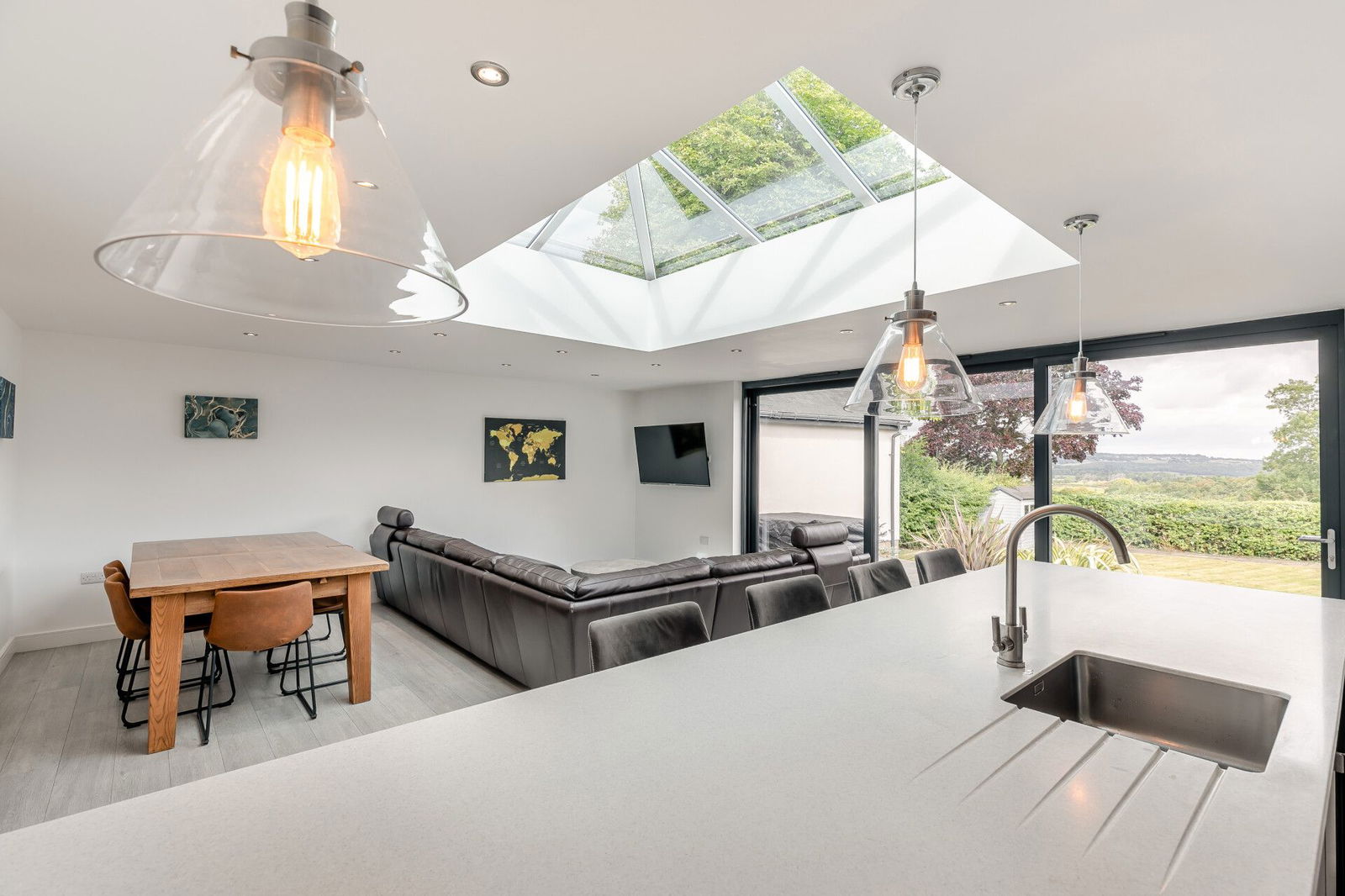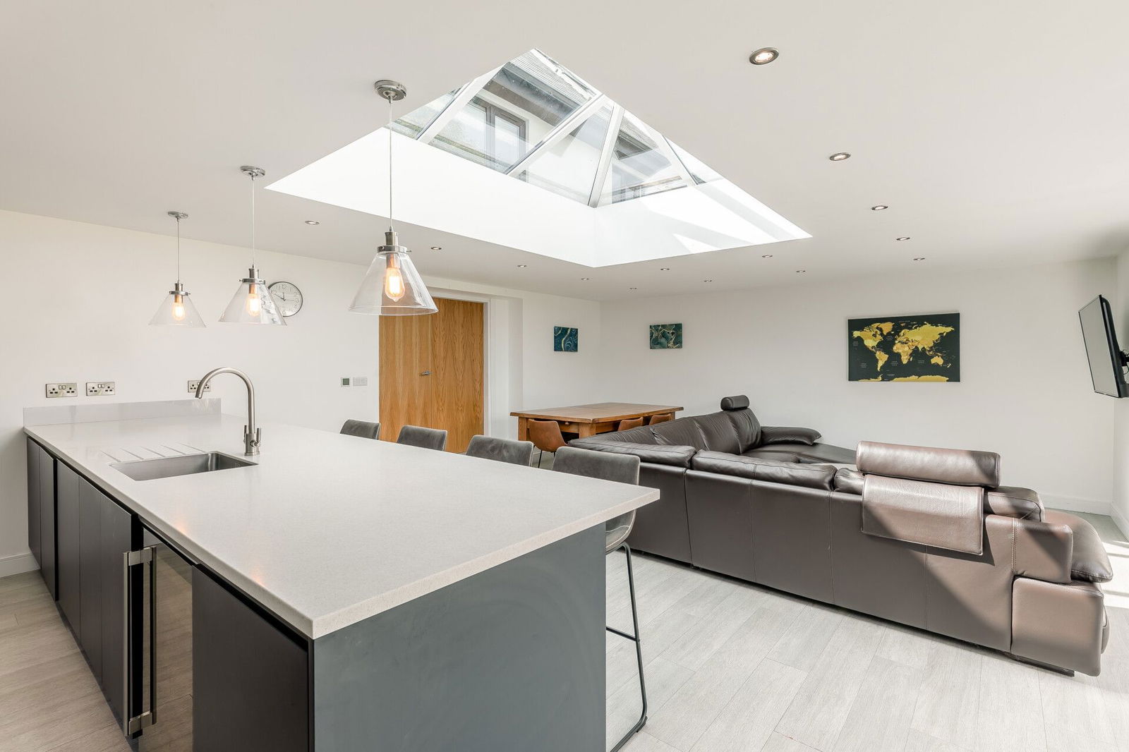 An open plan living kitchen forms the hub of the home, is flooded with natural light and commands amazing views over the garden and adjoining countryside beyond. A spectacular room, with a large glass Lantern to the ceiling, incorporating a kitchen, dining area and lounge; presented with a comprehensive range of furniture with Corian worksurfaces extending to a generous breakfast bar and incorporating a sink unit and inset drainer. There are glass splash backs to the walls and a complement of appliances including a twin oven and grill with a Bosch five-ring induction hob with concealed extractor and glass splashback, a wine chiller, a dishwasher, full height fridge and a full height freezer. A bank of sliding doors to the rear open directly on to a garden terrace, seamlessly connecting the inside to the outdoors encouraging Al-Fresco dining.