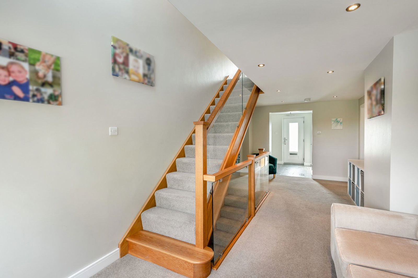 A contemporary styled entrance door opens into a generous reception hallway which is immoderately impressive, the eyes naturally drawn to a picture window at the far end offering a glimpse of surrounding countryside and stunning views across the valley. A cloakroom presents a modern two-piece suite whilst an oak and glass staircase gains access to both the lower ground and first floor accommodation.