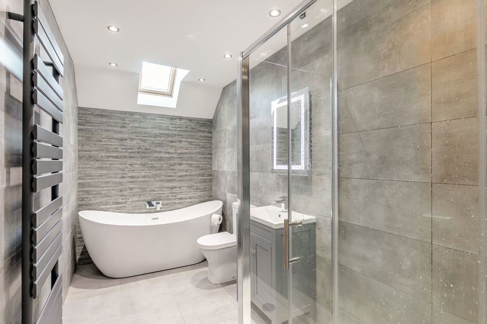 A bathroom presents a double shower, a wash hand basin with vanity cupboard beneath, a low flush W.C, and a freestanding double ended bath; the room complemented by feature tiling to the walls and floor, having a skylight window and a heated towel radiator.