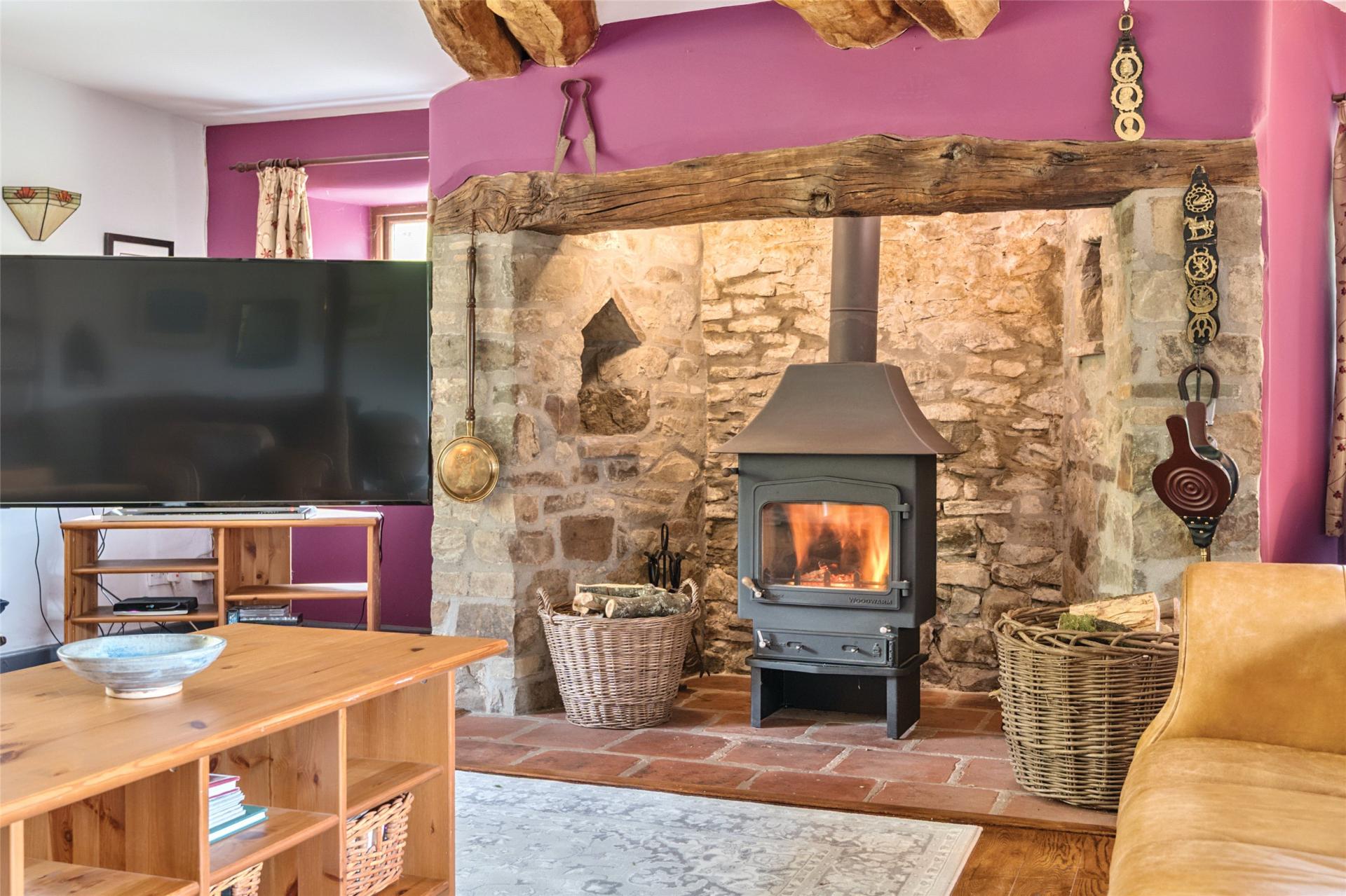 The sitting room is a beautifully proportioned triple-aspect space, showcasing an open stone inglenook fireplace with display niches, a wood-burning stove, and French oak flooring. The room also boasts exposed beams, a window seat, and arched alcoves.