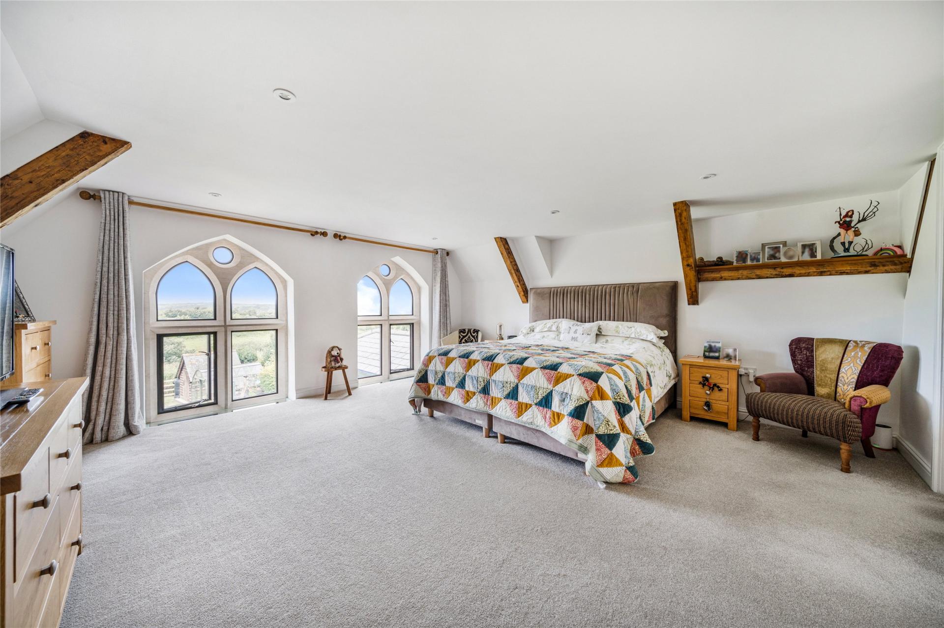 Set within a highly sought-after rural location in Arlington, this striking home offers spacious and versatile accommodation across three floors. From its exposed timber trusses and stone fireplaces to the striking Gothic-style arched windows, original features abound and have been lovingly retained to celebrate the building’s heritage.
