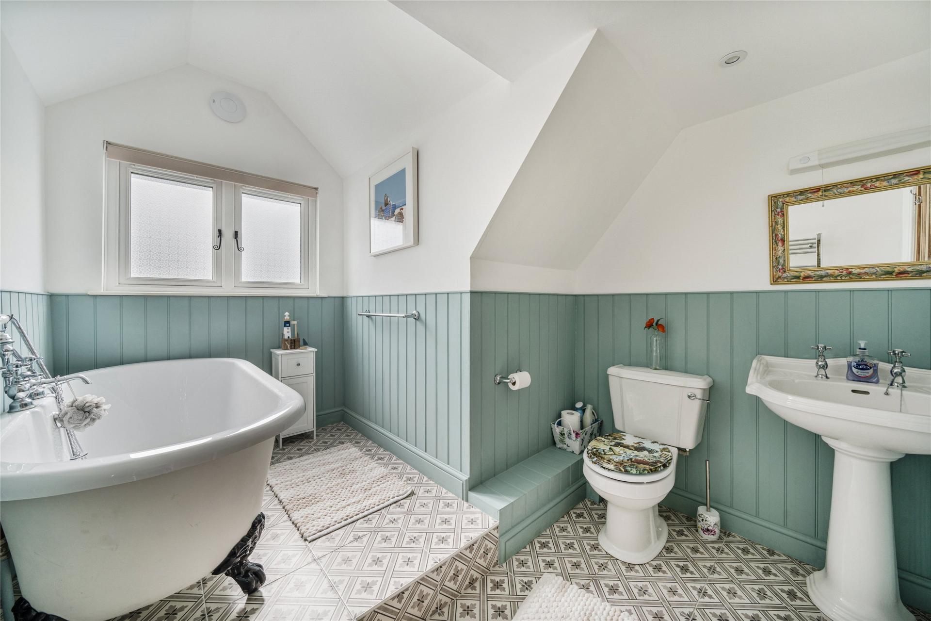 The ground floor also boasts a large, dual-aspect living room complete with a newly installed wood-burning stove on a slate hearth – perfect for cosy evenings in. French doors open onto a private rear courtyard, while a three-piece suite shower room adds flexibility for ground-floor living. Completing the ground floor is a bright garden room/conservatory, offering serene views across the front gardens – the perfect place to relax and enjoy the tranquil setting.