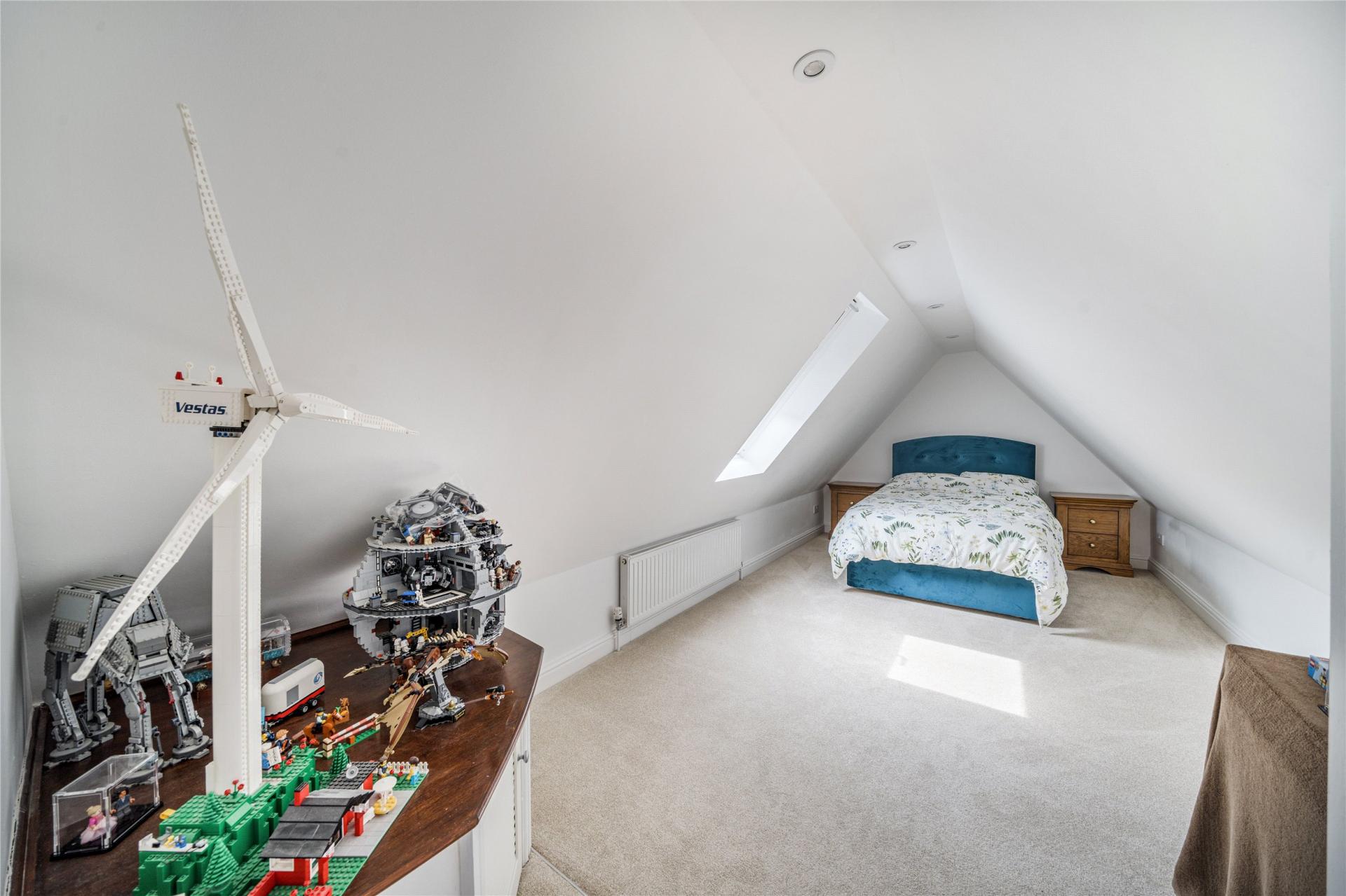 Rising to the second floor, you will find two further double bedrooms – both enjoying excellent proportions and flooded with natural light via Velux windows. These rooms offer wonderful flexibility, whether used as guest suites, children’s bedrooms, or dedicated home offices or studios.