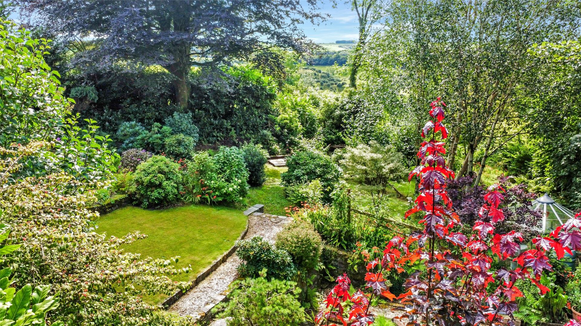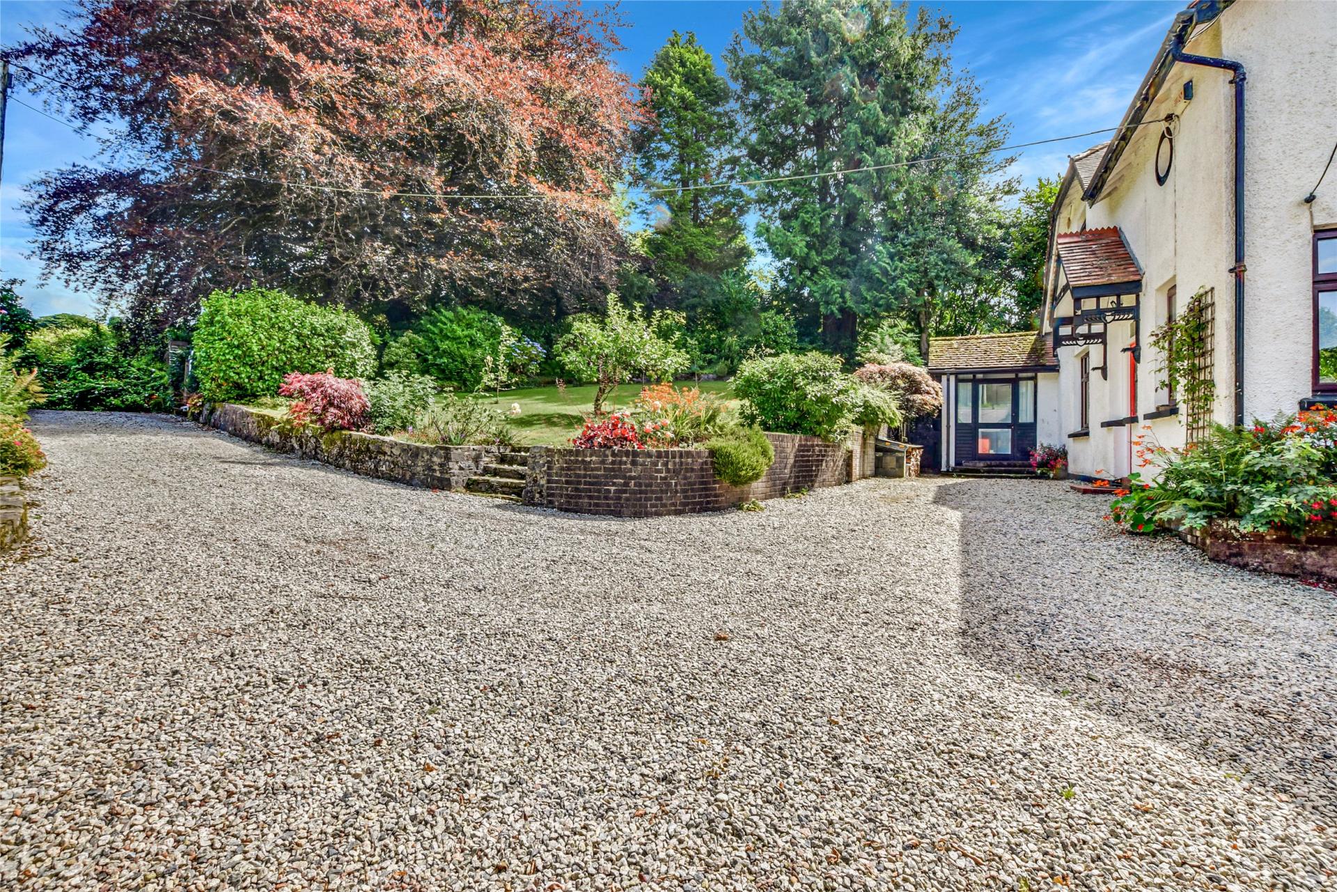 The front garden, raised above the drive, is mainly laid to lawn and is bounded by mature plants, trees, and shrubs that offer complete seclusion and privacy from the lane and neighboring properties. Access to the rear garden is available on both sides of the property.