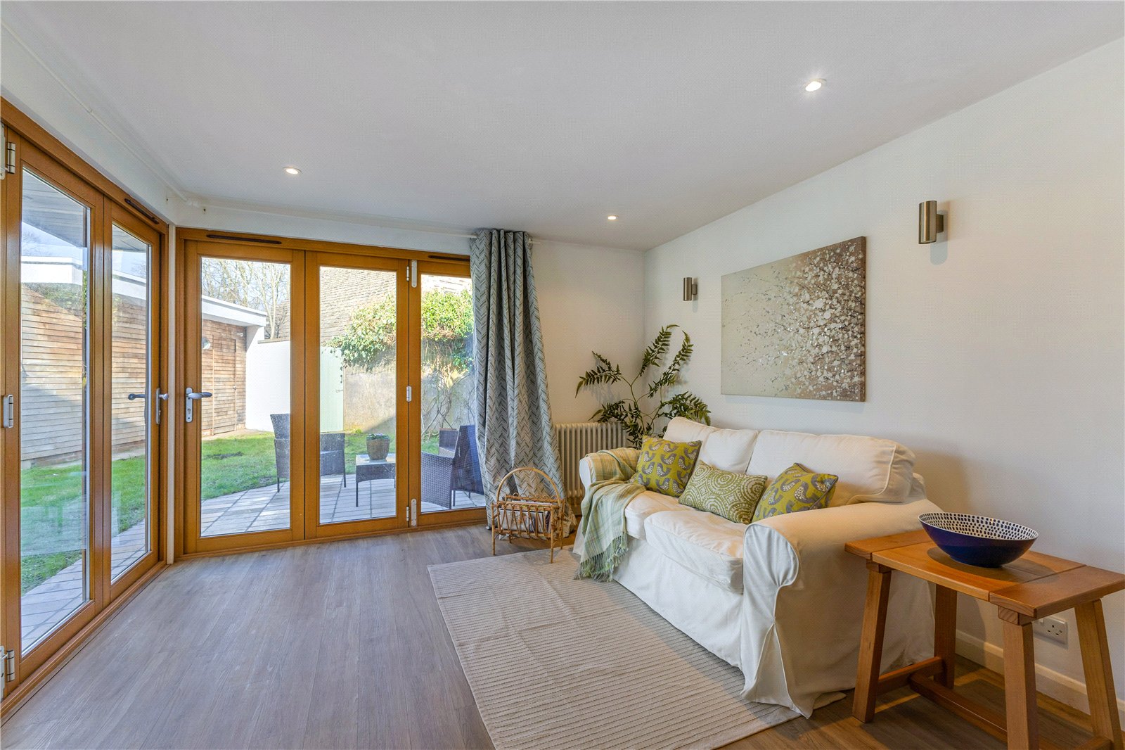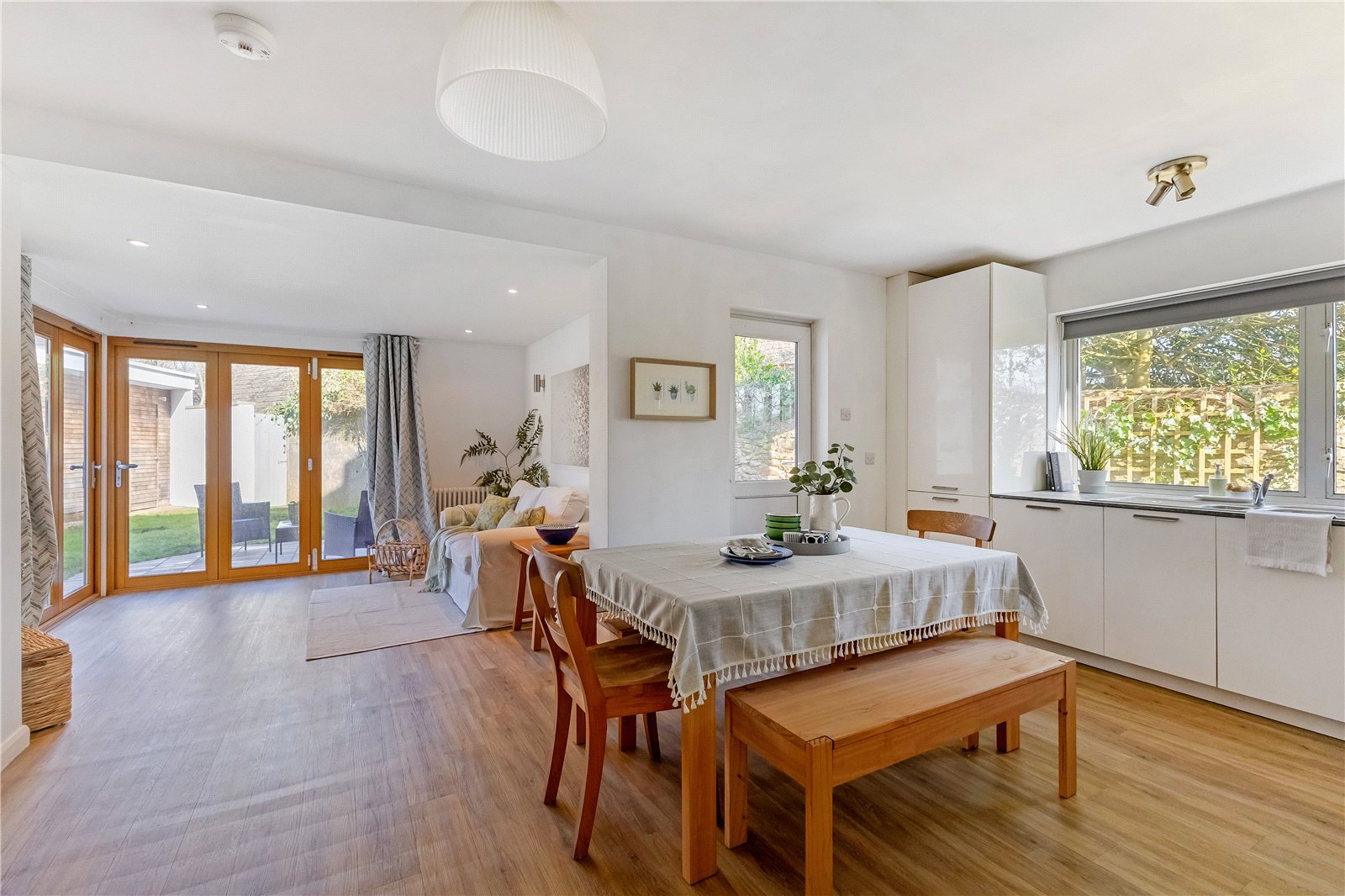 The kitchen has space for a big table and a sitting area, and with large doors leading to the patio and garden this area benefits from lots of light and a strong connection with outside.