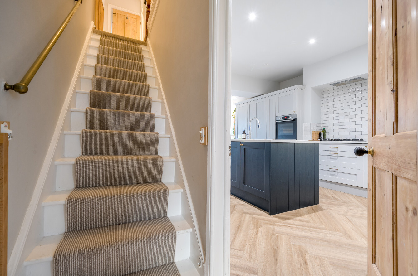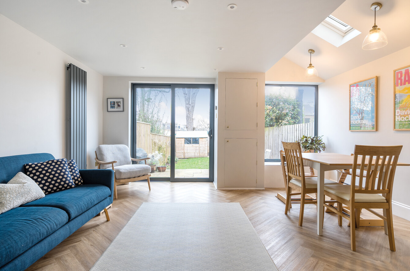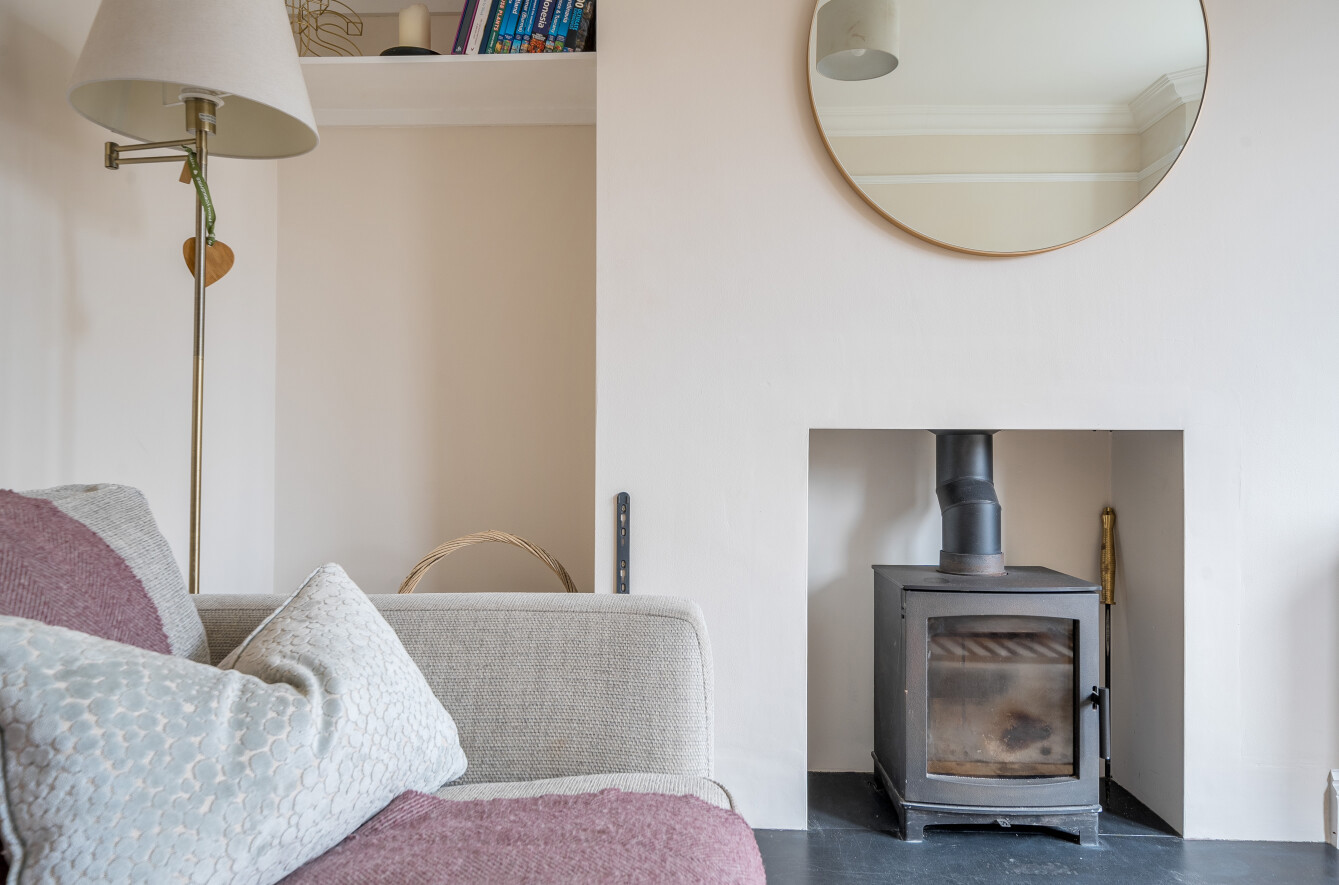 The kitchen/diner area has been perfect for hosting guests and for raising small children. The space is so light and airy, and its where we spend most of our time. The sitting room is another of our favourite spaces as its perfect for cosy winter evenings with the wood-burning stove on. The top room offers lovely views out to Round Hill.