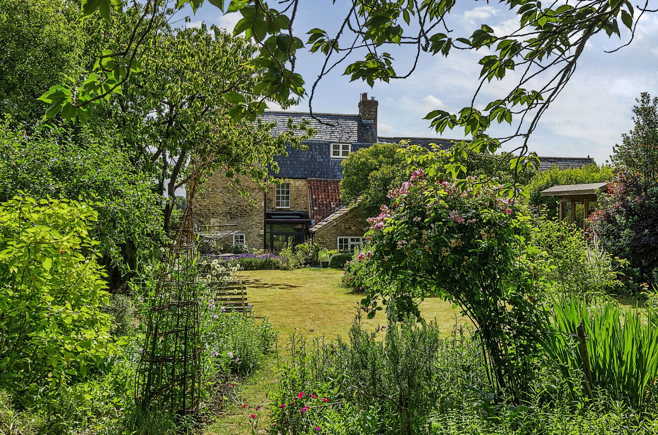 The kitchen has been updated several times, with the most recent improvements including skylights and new doors that open onto the beautifully designed garden, where careful planting offers year-round colour. The garden is one of my favourite places its full of interesting plants and looks out over fields of sheep and cows, with the avenue of trees leading to the church beyond. Its a lovely place to sit, especially at lunch or dinner on summer days.