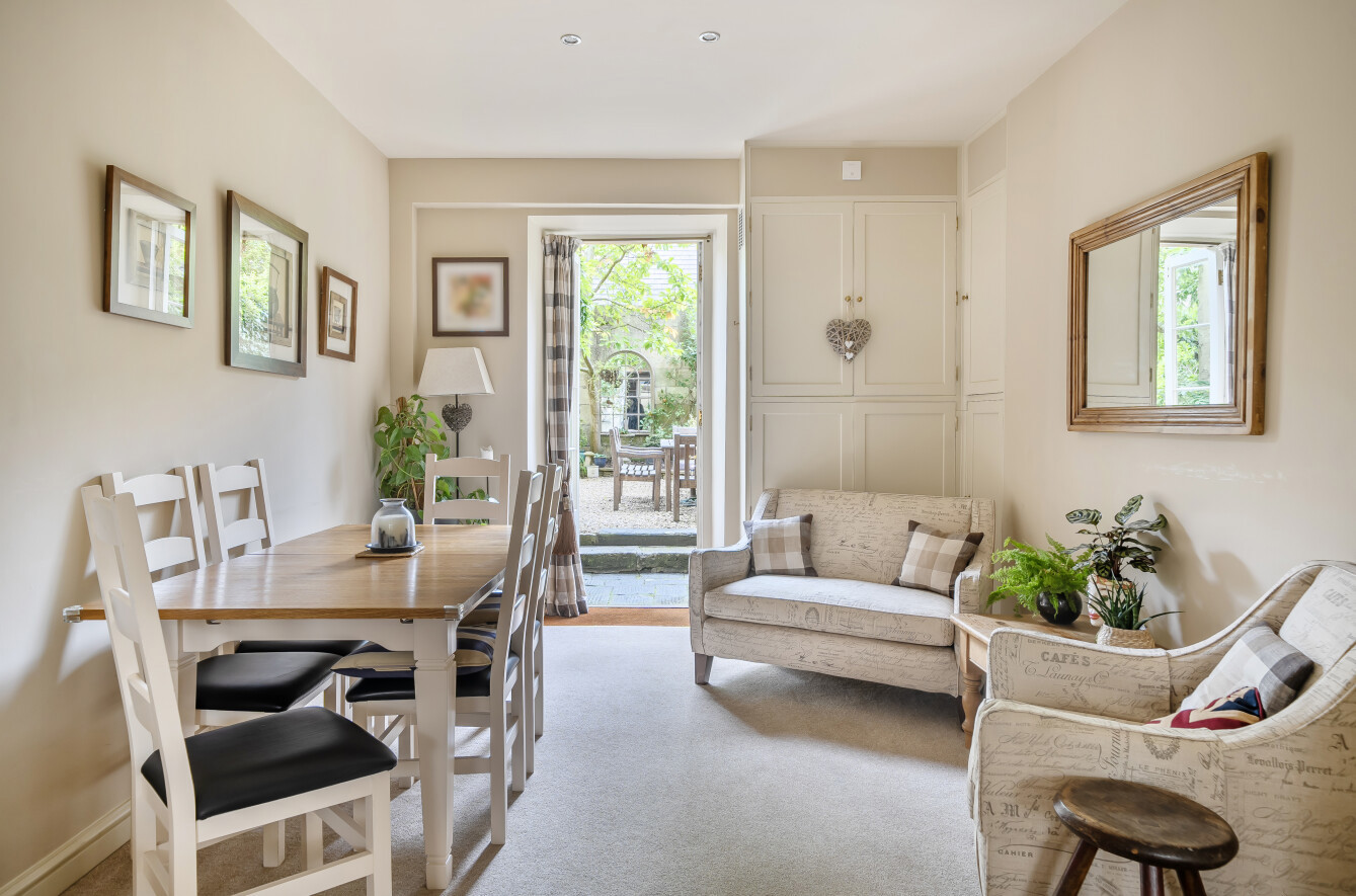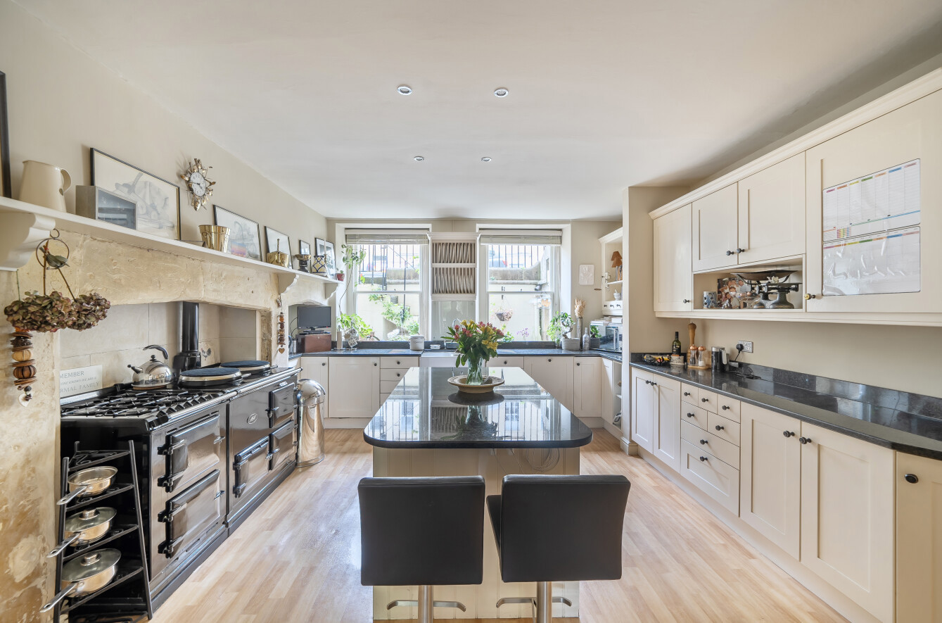 Spread over five floors, the accommodation is generous and well-proportioned. On the lower ground floor, a spacious kitchen sits at the heart of the home while the adjoining dining room opens directly onto the walled courtyard garden, creating a seamless link between inside and out. Two converted vaults provide excellent storage, while a cloakroom and second front entrance add practicality.