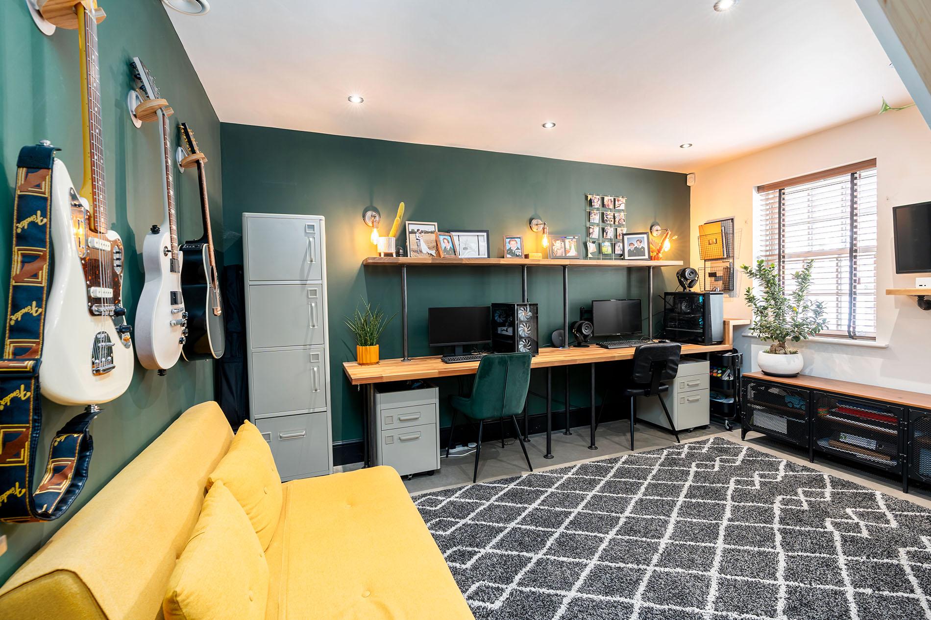 Home office, another spacious and flexible room with a fantastic range of fitted furniture and workspace having a door and window to the rear gardens.