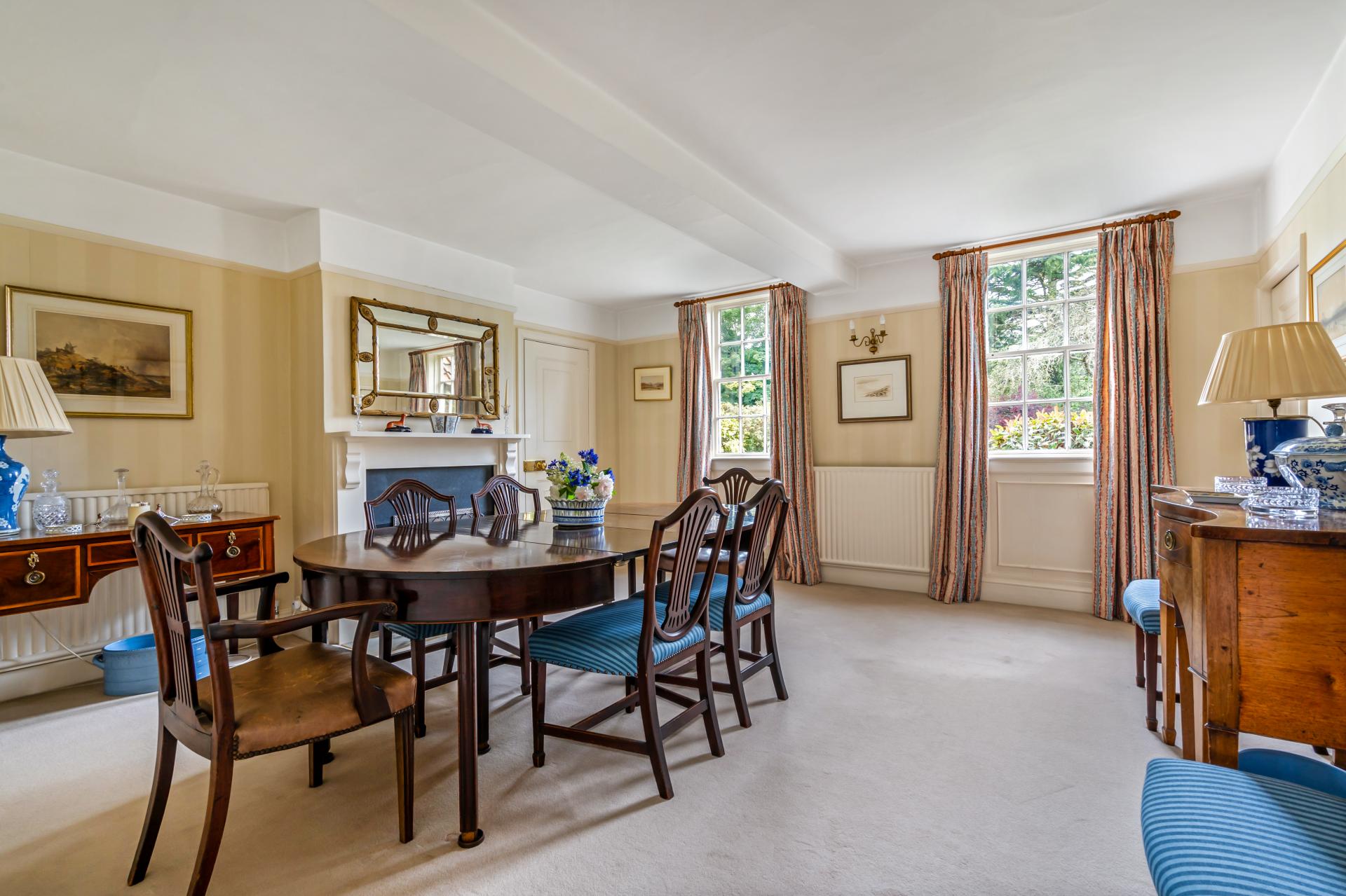 Formal dining room, enjoying a double fronted view over the garden and also features a picture rail and an open fire with a timber surround and mantle.