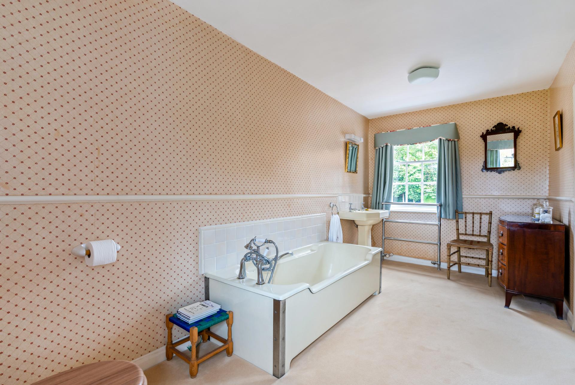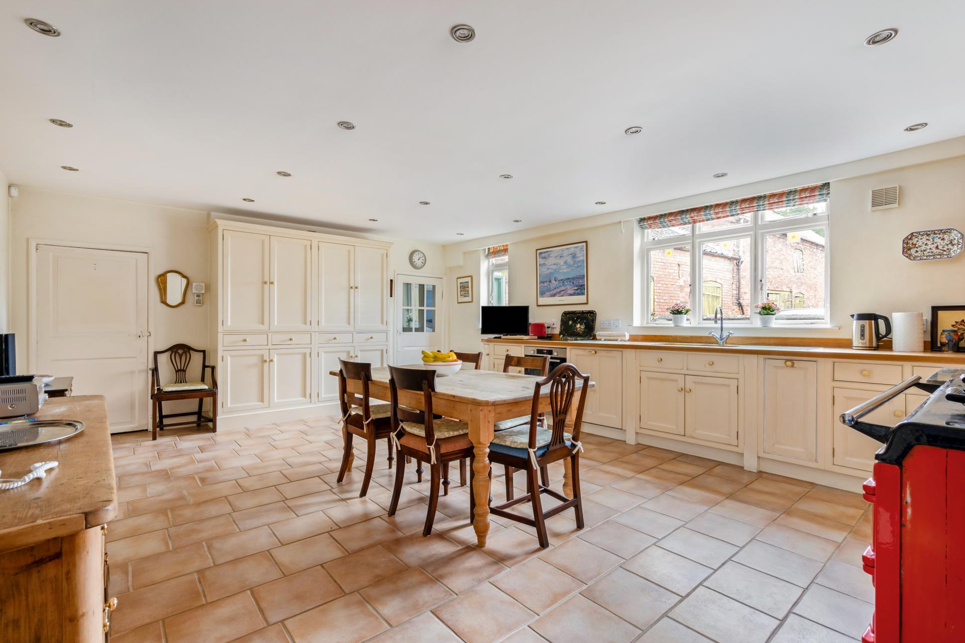 The spacious, bright kitchen diner sits to the rear elevation and incorporates a range of solid wood cream base and wall units with oak worksurfaces. There are two fitted, solid oak units either side of the chimney breast, one of which holds an integrated fridge alongside built-in shelving whilst the unit to the left of the chimney breast forms a very useful pantry cupboard. To the left of the kitchen there is a fitted floor to ceiling unit incorporating upper and lower-level cabinetry with central drawer storage. Appliances within the kitchen include the red two oven, two stove Aga, an integrated dishwasher, an electric oven with warming drawer below and a four burner Neff electric hob.