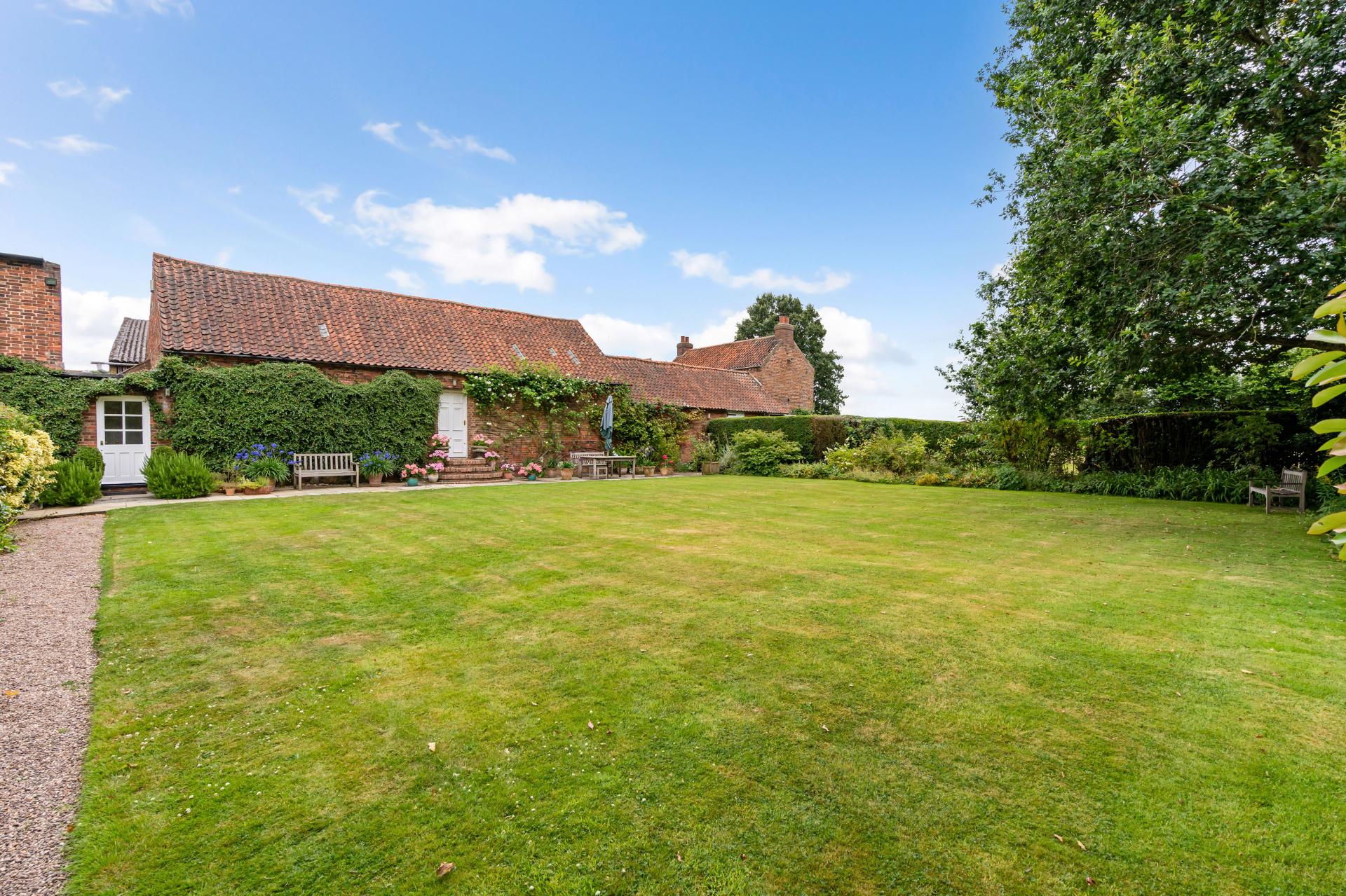 A large expanse of lawn to the most southern part of the plot has previously been used as a grass tennis court, a very private parcel of garden with a mature tree lined/hedged boundary to the west and open fields to the south aspect. There are two brick built outbuildings accessible from this section of the garden, one with a stable door and the other a generous garden store with a vaulted ceiling.
