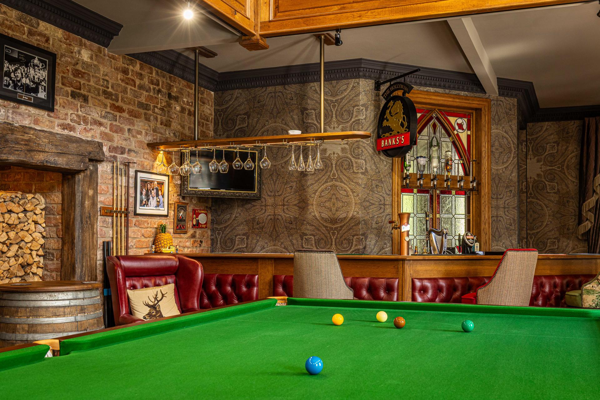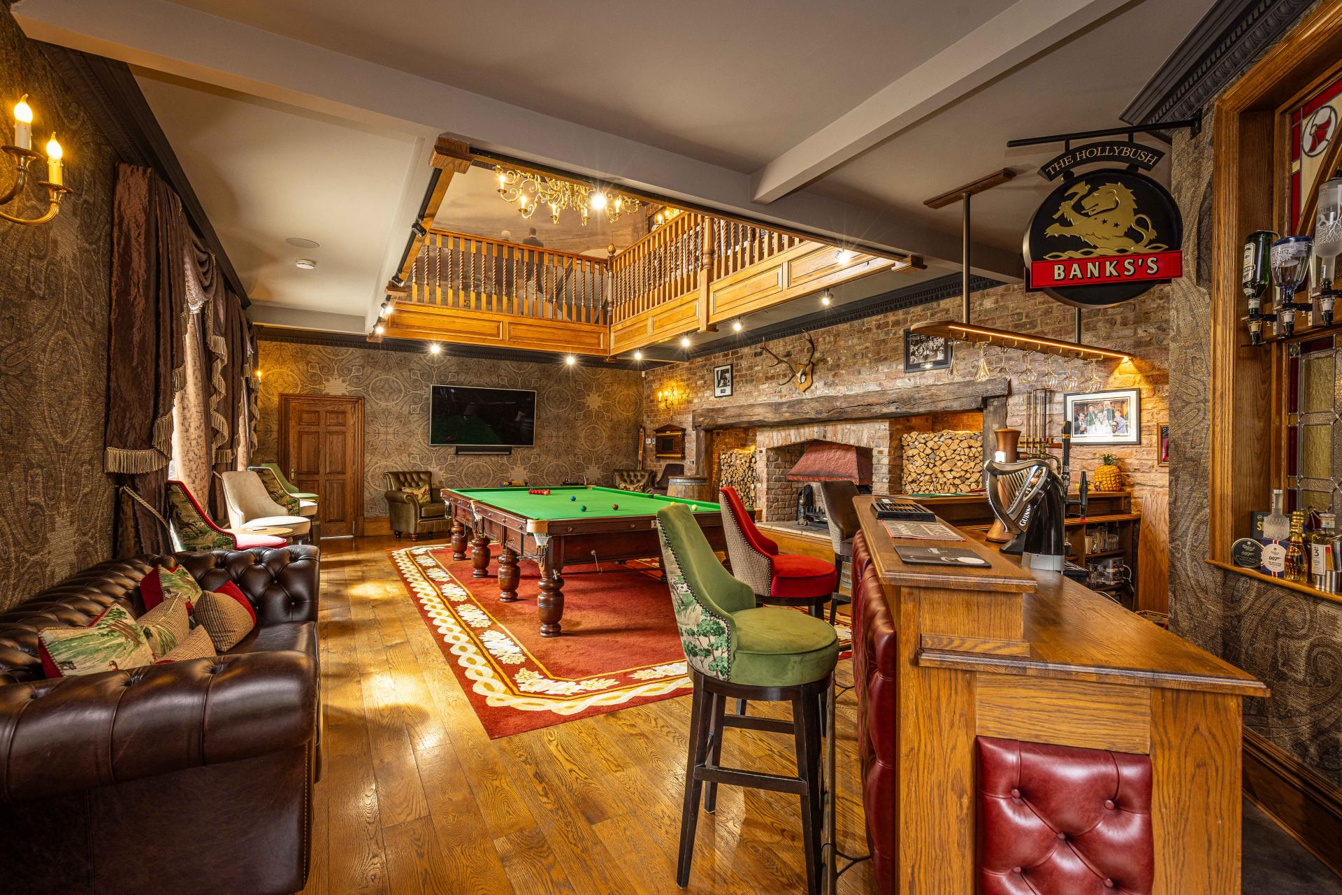 A sumptuous games room gives a further entertainment area, with space for a snooker table and fully functioning bar. There is a galleried landing area above which provides a spectacular vantage point to take in the antics below. This room certainly has the wow factor and is an extravagant setting to party the night away.