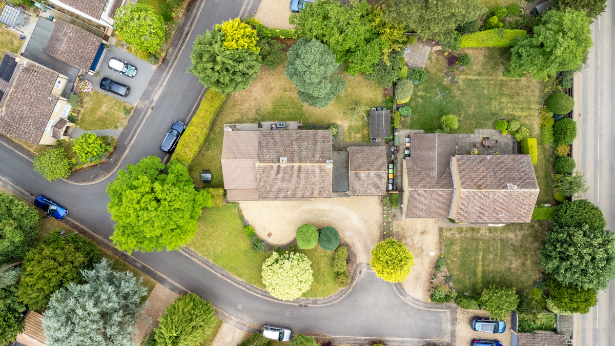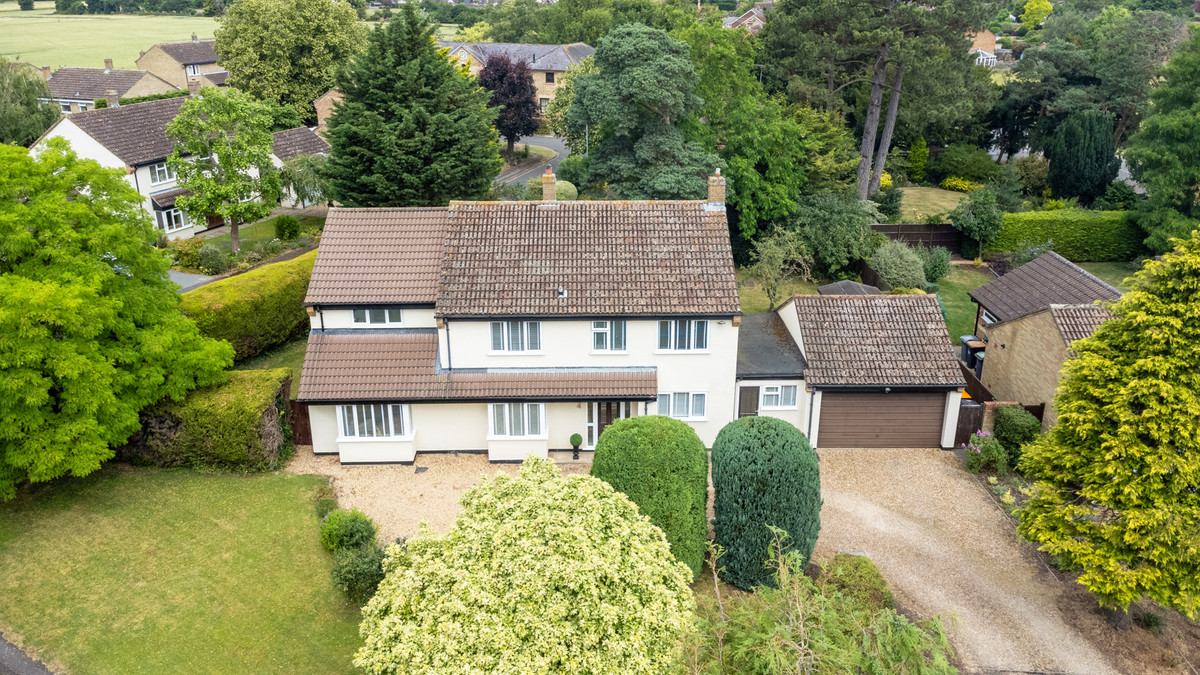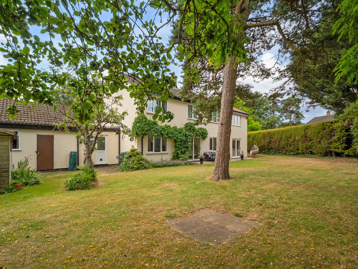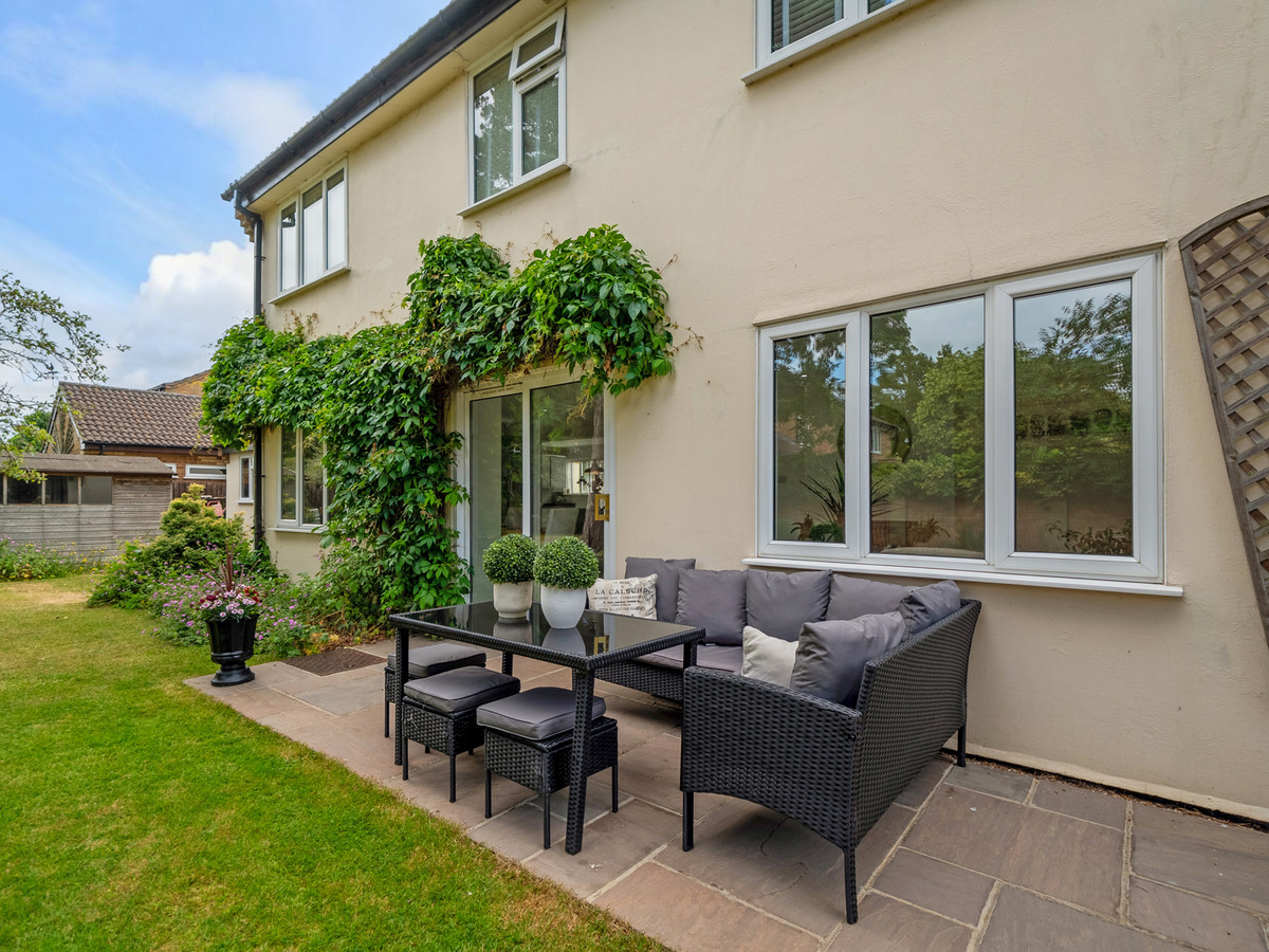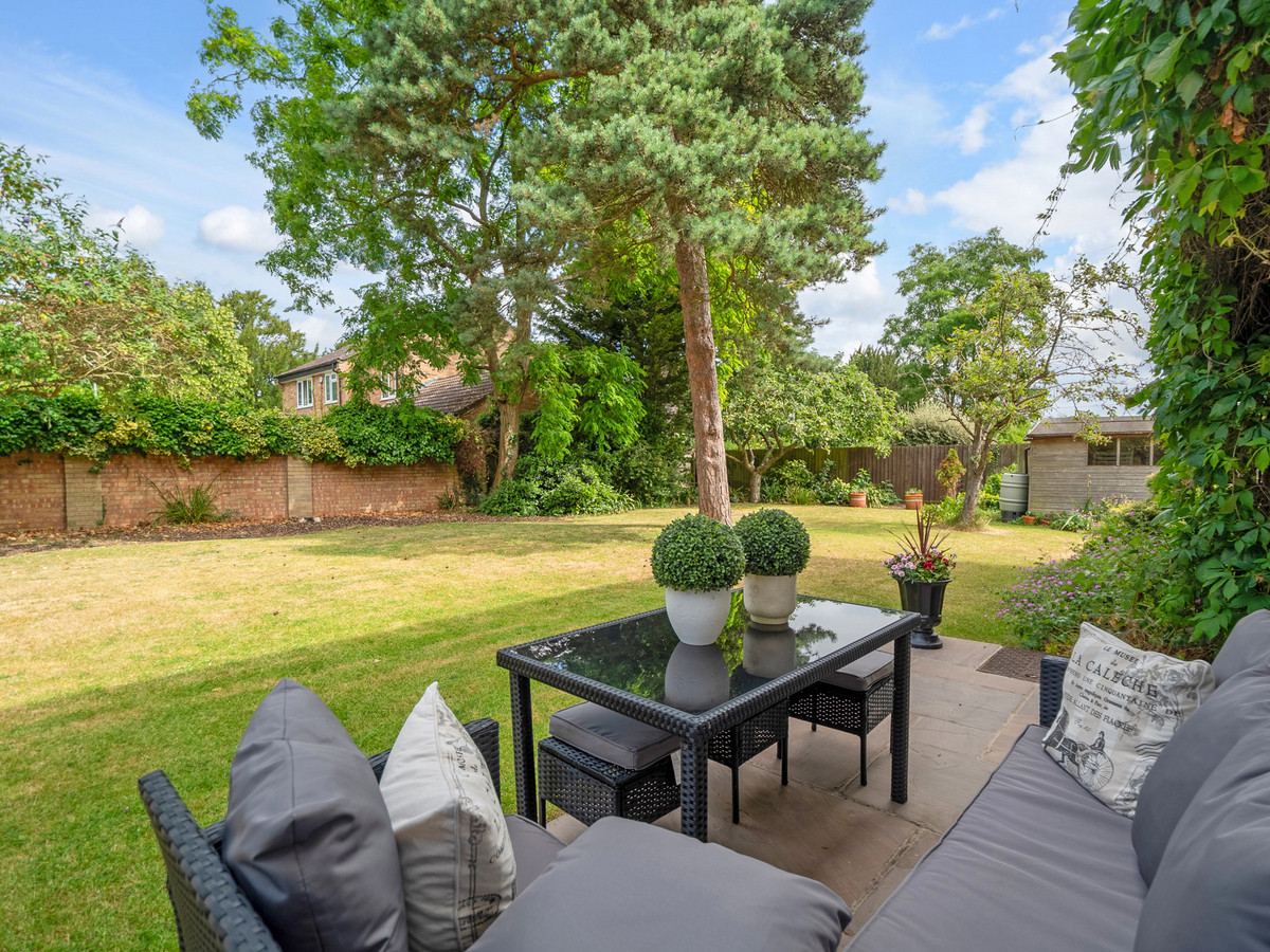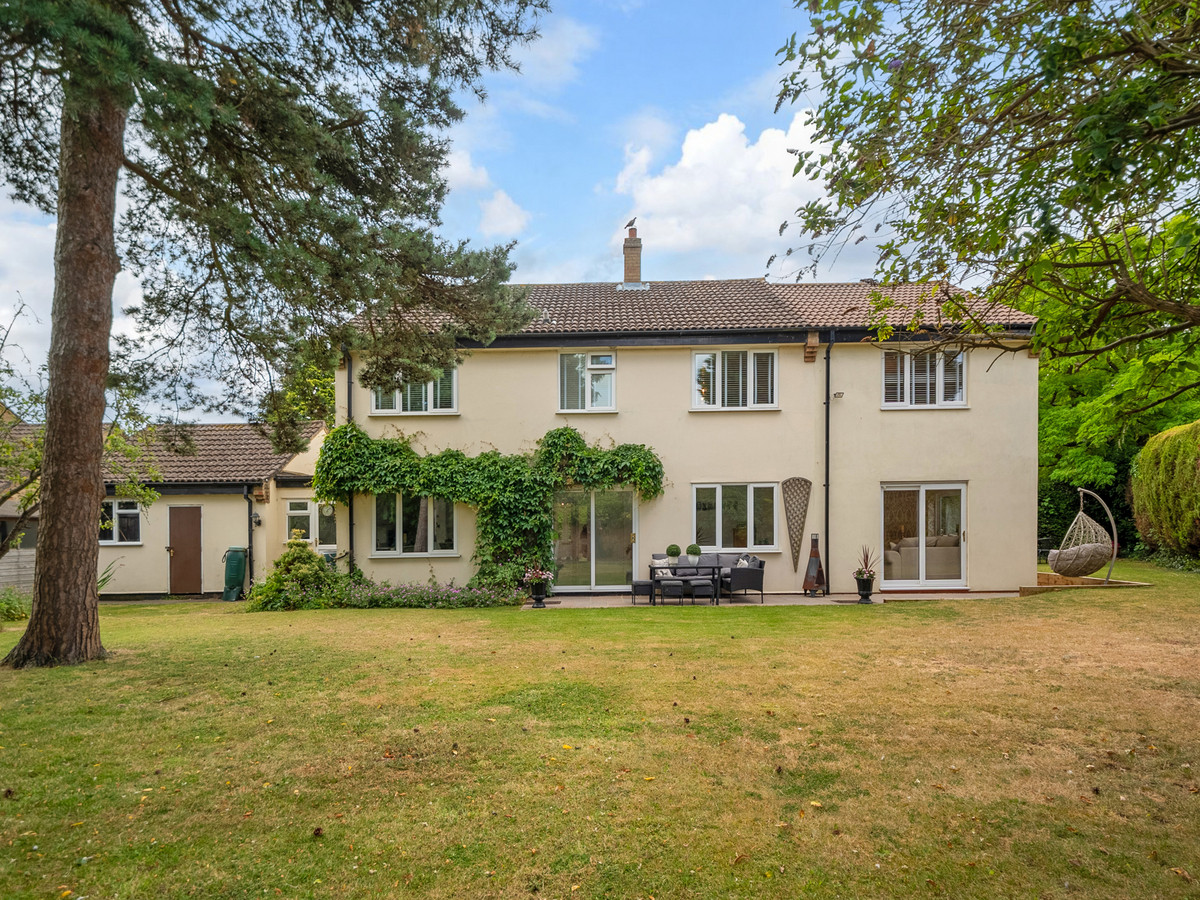 The house is centrally situated on its plot, providing extensive off-road parking and a large double garage. The wrap-around garden includes extensive lawns, a paved patio area, and mature trees, including one protected by a tree preservation order.