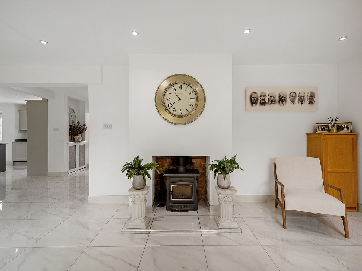 Upon entering, you are greeted by an impressive open-plan kitchen, dining, and family room. This versatile space is perfect for contemporary family life, featuring modern units with quartz countertops, two integrated dishwashers, a double Neff oven, an induction hob with an extractor hood, and space for an American-style fridge freezer. The kitchen area flows seamlessly into a living space with ample seating and a charming log-burning stove, creating a warm focal point. The ground floor also includes a spacious 27ft dual-aspect living room with additional access to the rear garden, a study, a utility room with space for additional appliances, and a downstairs cloakroom.