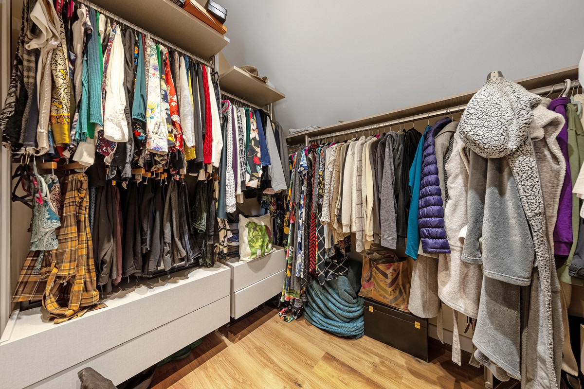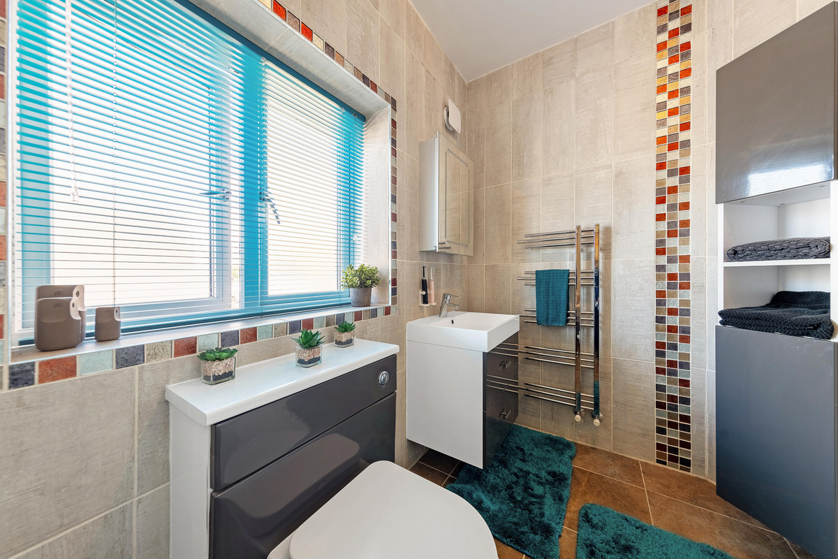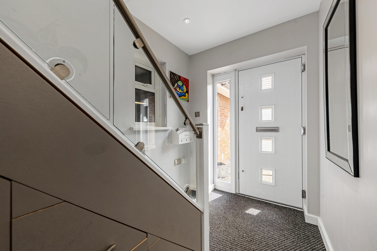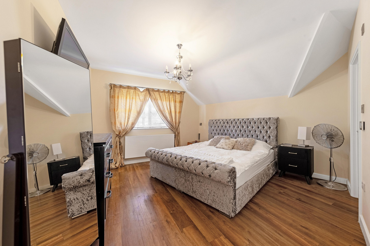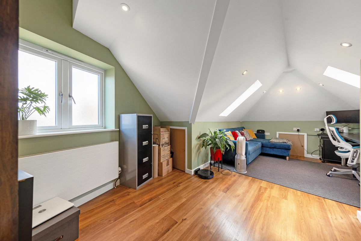 Upstairs, you’ll find three spacious double bedrooms, a single room, and a large fifth room currently used as a home gym or office—easily converted into a further double bedroom if needed. The main bedroom includes a walk-in dressing room and a sleek en-suite with walk-in shower, underfloor heating, and smart controls. A modern family bathroom, finished with decorative panels and a full-sized bath with overhead shower, completes the level. Additional storage is found in two loft areas and a walk-in airing cupboard.